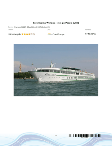 Serenissima Wenecja - rejs po Padzie (VEN) Termin: 29 wrzesień 2017 - 03 październik 2017 (ilość dni: 5) Statek: Michelangelo Linia: Cena od: CroisiEurope €726.00/os. 1/3 EV:45562 TRASA REJSU dzień 1 Data Port Wpłynięcie Wypłynięcie piątek 29.09.2017 Wenecja --:-- --:-- Legenda Włochy Zaokrętowanie o godzinie 18:00. Koktajl powitalny i kolacja. Wolny wieczór w Wenecji. dzień 2 sobota 30.09.2017 Wenecja --:-- --:-- Włochy Po śniadaniu popłyniemy wzdłuż weneckiej laguny. Po lunchu możliwość skorzystania z wycieczki fakultatywnej na weneckie wyspy: Murano i Burano. Murano słynie z wyrobu szkła oraz kościołów: Santa Maria i San Donato. Burano natomiast znane jest z rybołówstwa, koronkarstwa oraz kolorowych domów. Powrót późnym popołudniem. Po kolacji wieczór taneczny. dzień 3 niedziela 01.10.2017 Wenecja --:-- --:-- Włochy Po śniadaniu istnieje możliwość skorzystania z wycieczki fakultatywnej po mieście ze zwiedzaniem Pałacu Dożów – symbolu chwały i potęgi Wenecji oraz słynnego Placu św. Marka. Po lunchu czas wolny na zwiedzanie na „własną rękę”. Powrót na statek do godziny 19:00. dzień 4 poniedziałek 02.10.2017 Chioggia --:-- --:-- Włochy Wczesnym rankiem wyruszymy w kierunku Chioggi, gdzie dotrzemy po śniadaniu. Czas wolny na zwiedzanie miasta na „własną rękę”. Po lunchu będzie możliwość skorzystania z wycieczki fakultatywnej do Padwy – miasta św. Antoniego, które jest znanym centrum pielgrzymkowym. Odwiedzimy bazylikę „Santo”, wybierzemy się na spacer po zabytkowym centrum miasta i odkryjemy słynną kawiarnię ”Pedrocchi”. dzień 4 poniedziałek 02.10.2017 Wenecja --:-- --:-- Włochy W międzyczasie statek popłynie do Wenecji, gdzie dołączymy do niego wieczorem. Uroczysta kolacja pożegnalna. dzień 5 wtorek 03.10.2017 Wenecja --:-- --:-- Włochy Wyokrętowanie o godzinie 9:00. CENNIK Cena katalogowa Kabina zewnętrzna z oknem od €726.00 3 osoba dorosła w kabinie zniżka 30% dziecko od 2 do 9 lat zniżka 20% Opłaty portowe Cena promocyjna w cenie Uwaga! Ceny za osobę w kabinie dwuosobowej. Cena zawiera: 5-dniowy (4 noclegi) rejs po Padzie; zakwaterowanie w kabinie dwuosobowej z klimatyzacja, prysznicem oraz WC; pełne wyżywienie od kolacji dnia pierwszego do śniadania dnia ostatniego; napoje w tym wodę, wino, piwo, soki owocowe i kawę serwowane podczas posiłków na pokładzie, opiekę hostessy na pokładzie; koktajl powitalny oraz uroczysty wieczór galowy; opłaty portowe. 2/3 EV:45562 Cena nie zawiera: kosztów dojazdu do portu; ubezpieczenia KL, NNW i bagaż; napojów serwowanych w barze, win z karty, szampana oraz napojów podczas wycieczek fakultatywnych i transferów; wycieczek fakultatywnych (można zarezerwować i zapłacić na pokładzie); wydatków osobistych. Wycieczki fakultatywne: • Wyspy Murano i Burano – €32/os. • wycieczka z przewodnikiem po Wenecji ze zwiedzaniem Pałacu Dożów – €35/os. • wycieczka z przewodnikiem po Padwie - €37/os. 3/3 EV:45562