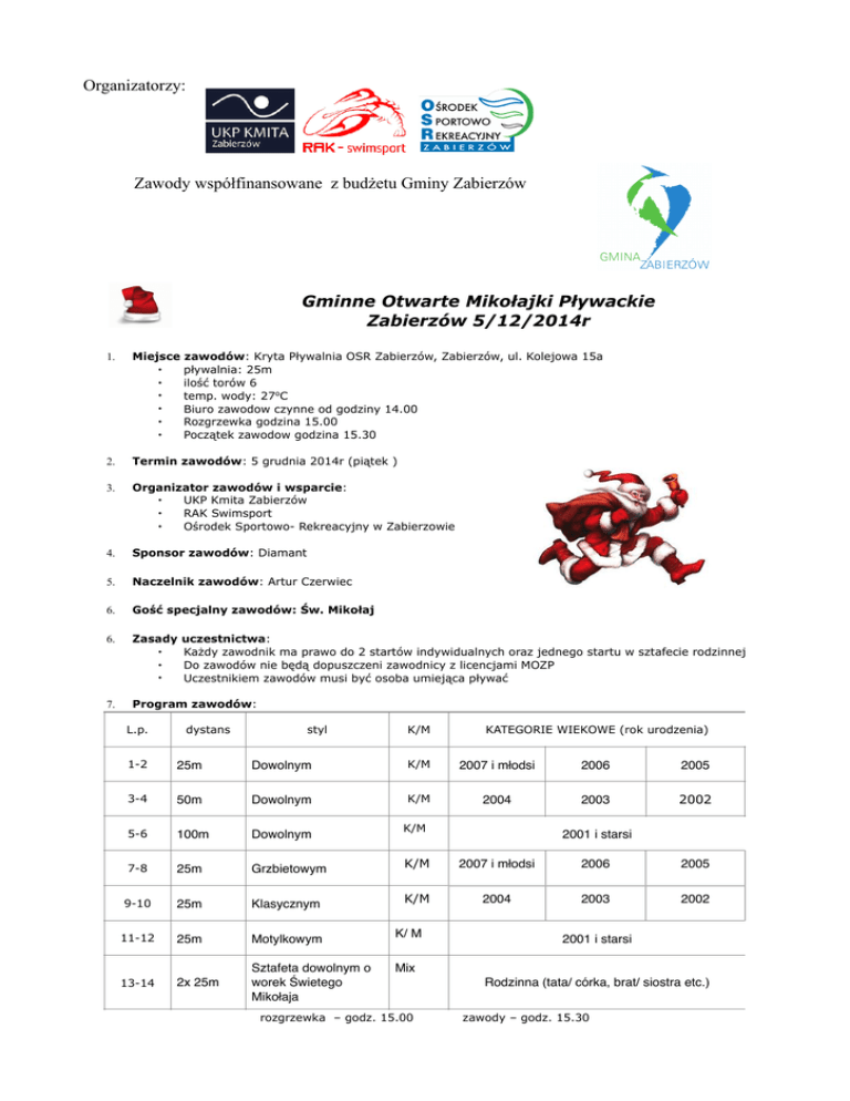 Organizatorzy: Zawody współfinansowane z budżetu Gminy Zabierzów Gminne Otwarte Mikołajki Pływackie Zabierzów 5/12/2014r 1. Miejsce zawodów: Kryta Pływalnia OSR Zabierzów, Zabierzów, ul. Kolejowa 15a • pływalnia: 25m • ilość torów 6 • temp. wody: 27oC • Biuro zawodow czynne od godziny 14.00 • Rozgrzewka godzina 15.00 • Początek zawodow godzina 15.30 2. Termin zawodów: 5 grudnia 2014r (piątek ) 3. Organizator zawodów i wsparcie: • UKP Kmita Zabierzów • RAK Swimsport • Ośrodek Sportowo- Rekreacyjny w Zabierzowie 4. Sponsor zawodów: Diamant 5. Naczelnik zawodów: Artur Czerwiec 6. Gość specjalny zawodów: Św. Mikołaj 6. Zasady • • • 7. Program zawodów: L.p. uczestnictwa: Każdy zawodnik ma prawo do 2 startów indywidualnych oraz jednego startu w sztafecie rodzinnej Do zawodów nie będą dopuszczeni zawodnicy z licencjami MOZP Uczestnikiem zawodów musi być osoba umiejąca pływać dystans styl K/M KATEGORIE WIEKOWE (rok urodzenia) 1-2 25m Dowolnym K/M 2007 i młodsi 2006 2005 3-4 50m Dowolnym K/M 2004 2003 2002 5-6 100m Dowolnym 7-8 25m Grzbietowym K/M 2007 i młodsi 2006 2005 9-10 25m Klasycznym K/M 2004 2003 2002 11-12 25m Motylkowym K/ M 2x 25m Sztafeta dowolnym o worek Świetego Mikołaja Mix 13-14 K/M rozgrzewka – godz. 15.00 2001 i starsi 2001 i starsi Rodzinna (tata/ córka, brat/ siostra etc.) zawody – godz. 15.30 * sztafeta 2x 25m o worek Św Mikołaja polega na przepłynięciu w czapce i z workiem na placeach lub w dłoni dowolnym sposobem dystansu 25m i przekazanie atrybutów osobie ze sztafety, która drugi odcinek 25m pokonuje w sposób analogiczny w czapce i z workiem na plecach lub dłoni . Głowa musi znajdować sie nad powierzchnią wody. Start możliwy jest dopiero po założeniu czapki na głowę i zainstalowaniu worka. 8. Zgłoszenia do zawodów: zgłoszenia należy dostarczyć na adres poczty elektronicznej: pł[email protected] w terminie do 2 grudnia 2014. (Wtorek godzina 22.00) Zgłoszenia dokonane po tym terminie mogą zostać przyjęte pod warunkiem uiszczenia opłaty 50zl Zgłoszenie musi zawierać: imię i nazwisko zawodnika, pełną datę urodzenia DD/MM/RRRR, dystans i konkurencje oraz najlepszy wynik uzyskany w ostatnich 12 miesiącach. 9. Regulamin zawodów: • Zawody przeprowadzane są seriami na czas, bez podziału na kategorie wiekowe • Po zakończeniu każdej konkurencji zostaną ogłoszone wyniki z podziałem na kategorie wiekowe • Dopuszcza sie używania sprzętu ułatwiającego pływanie (deski, makaron etc.) 10. Regulamin rozgrzewki: • Tor 6 jest torem jednokierunkowym, przeznaczonym również na skoki do wody • Skoki do wody w innych miejscach są niedopuszczalne pod groźbą wykluczenia z zawodów 11. Nagrody: • Za miejsca I – III medale i dyplomy w każdej konkurencji indywidualnej i kategorii wiekowej • Puchary za miejsca I- III w sztafetach • Paczki od Św. Mikołaja (odbiór przed zawodami przy rejestracji w biurze zawodow) • Nagroda główna w formie loterii • Dla dzieci urodzonych w latach 2008 i młodszych medal za uczestnictwo w zawodach • Niespodzianki w miarę pozyskiwania sponsorów. 12. Zasady • • • • • • 13. finansowania: koszty organizacyjne pokrywa organizator koszty uczestnictwa ponoszą uczestnicy opłata startowa wynosi 20zł od zawodnika – płatna przed zawodami w biurze zawodow Osobie dokonującej opłaty startowej przysługuje paczka od Świętego Mikołaja wydawana w biurze zawodów uczniowie szkół podstawowych i gimnazjalnych z terenu Gminy Zabierzów są zwolnieni z opłaty startowej członkowie szkółek pływackich działających na terenie Ośrodka Sportowo – Rekreacyjnego w Zabierzowie są zwolnieni z opłaty startowej Postanowienia końcowe: • za dyscyplinę i porządek w trakcie zawodów odpowiadają opiekunowie oraz rodzice Sponsorzy: