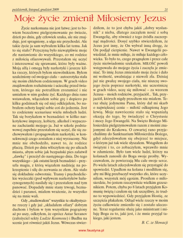 październik, listopad, grudzień 2009 21 Moje życie zmienił Miłosierny Jezus Życie narkomana nie jest łatwe; jest to bowiem bezcelowe pielgrzymowanie po świecie, dzień po dniu, gdy człowiek szuka, ale nie znajduje, jest spragniony, a ulga nie przychodzi. Ale takie życie ja sam wybrałem kilka lat temu. Jak to się stało? Przyczyną było niewątpliwie moje złe nastawienie do wszystkiego, co mi rodzice z miłością ofiarowywali. Przestałem się uczyć i interesować się sprawami, które były ważne. Moją alfą i omegą były narkotyki i jeszcze kilka rzeczy, których byłem niewolnikiem. Byłem uzależniony od swojego ciała – autoerotyka stała się moim chlebem codziennym. W grach video znajdowałem rozluźnienie i ucieczkę przed światem, którego nie potrafiłem zrozumieć i nie umiałem w nim godnie żyć. Każdego dnia rano wstawałem, włączałem sobie grę i dopiero po kilku godzinach się od niej odklejałem, bo nabrałem ochoty kupić sobie coś do jedzenia. Jest to codzienny scenariusz wielu młodych ludzi. Tak się borykałem w beznadziei: w kółko narkotykowe imprezy, kobiety, alkohol i wypaczone zachcianki mojego ja. Już w szkole podstawowej zupełnie przestałem się uczyć, źle się zachowywałem i propagowałem narkotyki, w konsekwencji czego zostałem z niej wyrzucony. Nic mnie nie obchodziło, nawet to, że rodzice płaczą. Dzień po dniu włóczyłem się po ulicach miasta, abym sobie jak bezpański pies załatwił „dawkę” i przeżył do następnego dnia. Do tego wszystkiego – jak ostatni krzyk beznadziei – przyszła magia, z którą wiązałem nadzieję na pokrzepienie i siłę do zerwania ze złem. Ale stało się dokładnie odwrotnie. Transy i psychodelickie wycieczki (pod wpływem narkotyków halucynogennych) nasilały się i przestałem nad tym panować. Dopadały mnie stany trwogi, beznadziei i paranoi, miałem wrażenie, że wszystko się na mnie wali. Gdy „studiowałem” wszystkie te okultystyczne rzeczy i gdy już „składałem ofiary” dobrym duchom i byłem w tym wszystkim pogrążony aż po uszy, odkryłem, że oprócz Astar Seranov (założyciel sekty Ludzie Kosmosu) i Budhu na scenie jest również jakiś Jezus. Wówczas stwier- dziłem, że to jest chyba jakiś „dobry wysłannik” z nieba, dlatego zacząłem nosić z sobą Ewangelię, aby również z tego źródła zaczerpnąć mądrości. Dosyć szybko stwierdziłem, że Jezus jest inny, że On wybrał inną drogę, że On podjął cierpienie. Nawet w Ewangelii powiedział, że mnie miłuje, że miłuje każdego człowieka. To było to, czego pragnąłem i przez całe życie nieświadomie szukałem. MIŁOŚĆ powoli wstępowała do mojego życia i zaczęła je zmieniać. To imię Jezus zmieniało moje życie i dało mi wolność, uwalniając z niewoli zła. Dzisiaj już nie gwałcę swojego ciała, nie niszczę swojego życia poprzez narkotyki, nie uczestniczę w grach video, uczę się miłować – za wzorem Jezusa – moich rodziców, przyjaciół... Tak, przyjaciół, których nigdy przedtem nie miałem. Teraz służę jedynemu Panu, który dał mi skarb o największej cenie – miłość odkupioną Jego krwią. Moje nawrócenie stało się wspaniałą okazją do tego, by świadczyć o Chrystusie i mocy Jego Ewangelii. Na Święto Bożego Miłosierdzia pielgrzymowałem razem z moimi znajomymi do Krakowa. O czwartej rano przyjechaliśmy do Sanktuarium Miłosierdzia Bożego, gdyż zdecydowałem się obejrzeć to miejsce, o którym już tak wiele słyszałem. Wstąpiłem do świątyni i to, co zobaczyłem, wprawiło mnie w zdumienie. Było tam wiele ludzi, którzy na kolanach zanosili do Boga swoje prośby. Wyczuwałem, że powierzają Mu całe swoje serce. Po wielu latach zdecydowałem się przystąpić do spowiedzi. Upadłem na kolana i modliłem się, aby mi Bóg przebaczył wszystko zło, które uczyniłem, wszystek mój egoizm. Prosiłem o miłosierdzie, bo jestem rzeczywiście wielkim grzesznikiem. Potem, chyba po 8 latach przyjąłem Komunię świętą i czułem się tak szczęśliwy, że trudno to wypowiedzieć. Gdy przyjąłem Hostię, ze szczęścia płakałem. Odtąd wiele rzeczy w moim życiu całkowicie zmieniło się i zostało uleczone. Teraz regularnie służę jako ministrant i miłuję Boga za to, jaki jest, i że mnie przyjął takiego, jaki jestem. B. C. ze Słowacji www.faustyna.pl