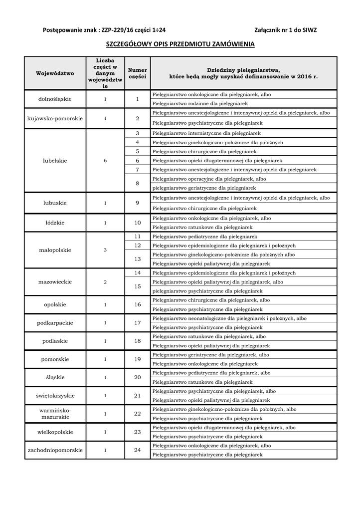 Postępowanie znak : ZZP-229/16 części 1÷24 Załącznik nr 1 do SIWZ SZCZEGÓŁOWY OPIS PRZEDMIOTU ZAMÓWIENIA Województwo Liczba części w danym województw ie Numer części dolnośląskie 1 1 kujawsko-pomorskie 1 2 Dziedziny pielęgniarstwa, które będą mogły uzyskać dofinansowanie w 2016 r. Pielęgniarstwo onkologiczne dla pielęgniarek, albo Pielęgniarstwo rodzinne dla pielęgniarek Pielęgniarstwo anestezjologiczne i intensywnej opieki dla pielęgniarek, albo lubelskie 6 Pielęgniarstwo psychiatryczne dla pielęgniarek 3 Pielęgniarstwo internistyczne dla pielęgniarek 4 Pielęgniarstwo ginekologiczno-położnicze dla położnych 5 Pielęgniarstwo chirurgiczne dla pielęgniarek 6 Pielęgniarstwo opieki długoterminowej dla pielęgniarek 7 Pielęgniarstwo anestezjologiczne i intensywnej opieki dla pielęgniarek 8 Pielęgniarstwo operacyjne dla pielęgniarek, albo pielęgniarstwo geriatryczne dla pielęgniarek Pielęgniarstwo anestezjologiczne i intensywnej opieki dla pielęgniarek, albo lubuskie 1 9 Pielęgniarstwo chirurgiczne dla pielęgniarek łódzkie małopolskie 1 3 10 Pielęgniarstwo pediatryczne dla pielęgniarek 12 Pielęgniarstwo epidemiologiczne dla pielęgniarek i położnych 14 2 Pielęgniarstwo ratunkowe dla pielęgniarek 11 13 mazowieckie Pielęgniarstwo onkologiczne dla pielęgniarek, albo 15 opolskie 1 16 podkarpackie 1 17 podlaskie 1 18 pomorskie 1 19 śląskie 1 20 świętokrzyskie 1 21 warmińskomazurskie 1 22 wielkopolskie 1 23 zachodniopomorskie 1 24 Pielęgniarstwo ginekologiczno-położnicze dla położnych albo Pielęgniarstwo opieki paliatywnej dla pielęgniarek Pielęgniarstwo epidemiologiczne dla pielęgniarek i położnych Pielęgniarstwo opieki paliatywnej dla pielęgniarek, albo pielęgniarstwo psychiatryczne dla pielęgniarek Pielęgniarstwo chirurgiczne dla pielęgniarek, albo Pielęgniarstwo psychiatryczne dla pielęgniarek Pielęgniarstwo neonatologiczne dla pielęgniarek i położnych, albo Pielęgniarstwo psychiatryczne dla pielęgniarek Pielęgniarstwo ratunkowe dla pielęgniarek, albo Pielęgniarstwo opieki paliatywnej dla pielęgniarek Pielęgniarstwo geriatryczne dla pielęgniarek, albo Pielęgniarstwo onkologiczne dla pielęgniarek Pielęgniarstwo pediatryczne dla pielęgniarek, albo Pielęgniarstwo ratunkowe dla pielęgniarek Pielęgniarstwo psychiatryczne dla pielęgniarek, albo Pielęgniarstwo opieki paliatywnej dla pielęgniarek Pielęgniarstwo ginekologiczno-położnicze dla położnych, albo Pielęgniarstwo psychiatryczne dla pielęgniarek Pielęgniarstwo opieki długoterminowej dla pielęgniarek, albo Pielęgniarstwo psychiatryczne dla pielęgniarek Pielęgniarstwo onkologiczne dla pielęgniarek, albo Pielęgniarstwo psychiatryczne dla pielęgniarek