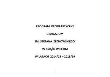 PROGRAM PROFILAKTYCZNY GIMNAZJUM IM. STEFANA ŻECHOWSKIEGO W KSIĄŻU WIELKIM W LATACH 2014/15 – 2018/19 1 Proponowany Program Profilaktyczny wynika z Programu Wychowawczego szkoły, którego głównym celem jest wszechstronny rozwój osobowości ucznia. Opisuje on wszelkie działania szkoły o charakterze profilaktycznym, wspomagające uczniów w radzeniu sobie z trudnościami i czynnikami zagrażającymi prawidłowemu rozwojowi. Program uwzględnia diagnozę problemów wychowawczych szkoły dokonaną na podstawie obserwacji funkcjonowania uczniów na terenie szkoły; rozmów z wychowawcami, nauczycielami, uczniami, rodzicami, z których wynika, że główne zagrożenia, które w sposób ciągły towarzyszą naszej młodzieży to: ■ agresja i przemoc ■ palenie papierosów ■ spożywanie alkoholu ■ wagarowanie i niechęć do szkoły ■ podatność na negatywne wpływy rówieśników Innymi zagrożeniami, które pojawiły się w ostatnim czasie i zagrażają naszej młodzieży są: zagrożenie uzależnieniem od substancji psychoaktywnych (narkotyki, dopalacze, leki), uzależnienie od komputera i Internetu, cyberprzemoc, zaburzenia odżywiania (anoreksja, bulimia). 1. ADRESACI. Adresatami planowanych działań profilaktycznych w Gimnazjum w Książu Wielkim są: uczniowie, rodzice oraz nauczyciele. 2 2. TERMIN REALIZACJI Program będzie realizowany w latach 2014/15 – 2018/19 przez: dyrektora szkoły, wszystkich nauczycieli, wychowawców, pedagoga szkolnego i psychologa szkolnego, rodziców, przy współpracy z instytucjami wspierającymi działania szkoły. 3. CEL GŁÓWNY Planowanie i wdrażanie oddziaływań profilaktycznych w szkole z zakresu profilaktyki uniwersalnej, selektywnej i wskazującej w celu pełnego rozwoju osobowości uczniów i przełamywania własnych ograniczeń, minimalizowania negatywnych wpływów środowiska, w tym przeciwdziałanie narkomanii. Działalność profilaktyczna obejmuje: - w przypadku profilaktyki uniwersalnej – wspieranie wszystkich uczniów w prawidłowym rozwoju i zdrowym stylu życia oraz podejmowanie działań, których celem jest ograniczanie zachowań ryzykownych niezależnie od poziomu ryzyka używania przez nich środków odurzających itp. - w przypadku profilaktyki selektywnej – wspieranie uczniów, którzy ze względu na swoją sytuację rodzinną, środowiskową lub uwarunkowaną biologicznie są w wyższym stopniu narażenie na rozwój zachowań ryzykownych - w przypadku profilaktyki wskazującej – wspieranie uczniów, u których rozpoznano wczesne objawy używania środków i substancji odurzających lub występowania innych zachowań ryzykownych, które nie zostały zdiagnozowane jako zaburzenia lub choroby wymagające leczenia. 4. CELE SZCZEGÓŁOWE ► rozwój osobowości ucznia w zakresie samopoznania, samoakceptacji, samooceny, szacunku do siebie i innych ►wspieranie uczniów w prawidłowym rozwoju i zdrowym stylu życia ► wyrabianie poczucia własnej wartości, rozwijanie asertywności ► przeciwdziałanie zachowaniom agresywnym oraz cyberprzemocy ► przeciwdziałanie aktom wandalizmu ► wdrażanie do przestrzegania norm moralnych, społecznych i prawnych 3 ► ograniczanie zachowań ryzykownych wśród młodzieży, przeciwdziałanie uzależnieniom, ► motywowanie do nauki, pokonywania trudności ► przygotowanie do wyboru szkoły ponadgimnazjalnej i zawodu ►dbanie o bezpieczeństwo własne i innych 5. FORMY REALIZACJI ● indywidualne rozmowy z uczniami, dyskusje, pogadanki ● spotkania z rodzicami, pedagogizacja tematyczna (prelekcje, warsztaty) ● gry i zabawy psychoedukacyjne ● zajęcia profilaktyczne ● konkursy ● gazetki tematyczne ● spektakle profilaktyczne ● prezentacja materiałów profilaktycznych (filmy, ulotki, broszury) ● wycieczki, wyjazdy ● ankiety ● projekty edukacyjne 6. EWALUACJA □ ankiety □ obserwacja □ rozmowy (indywidualne i grupowe) z uczniami, nauczycielami, wychowawcami □ ewaluacja wewnętrzna 7. OCZEKIWNE EFEKTY: □ Zmniejszenie przypadków zachowań agresywnych, aktów cyberprzemocy, łamania kodeksu ucznia, ulegania negatywnym wpływom kolegów. 4 □ Poprawienie frekwencji uczniów na zajęciach szkolnych. □ Minimalizowanie aktów wandalizmu na terenie szkoły. □ Poprawienie wyników nauczania. □ Zmniejszenie zainteresowania młodzieży substancjami psychoaktywnymi. □ Wzbogacenie wiedzy uczniów, rodziców i nauczycieli z zakresu profilaktyki m.in. wiedza nt. zaburzeń odżywiania □ Wybór szkoły ponadgimnazjalnej adekwatny do własnych możliwości i zainteresowań. □ Poprawa bezpieczeństwa w szkole i poza nią W zakresie postaw i nawyków uczeń potrafi: - panować nad swoimi emocjami i zachowaniem - ocenić swoje mocne i słabe strony - utrzymywać pozytywne relacje z rówieśnikami i dorosłymi - skutecznie porozumiewać się w różnych sytuacjach społecznych - przestrzegać norm społecznych - unikać zachowań agresywnych - systematycznie uczęszczać do szkoły - stawiać przed sobą cele do realizacji, adekwatne do własnych możliwości, dążyć do samodoskonalenia - mieć tzw. nastawienie zadaniowe w reagowaniu na trudności i niepowodzenia, polegające na koncentrowaniu się na celu (zadaniu) i usiłowaniu pokonania przeszkody, nawet wtedy, gdy pierwsze próby okażą się mało skuteczne - być asertywny, tolerancyjny - reagować na krzywdę innych - dbać o zdrowie swoje i innych - określić negatywne skutki uzależnień, określić sposoby zapobiegania uzależnieniom - prawidłowo odżywiać się - być otwartym na pomoc ze strony kolegów, rodziców i nauczycieli - dokonać wyboru szkoły ponadgimnazjalnej, adekwatnie do własnych zainteresowań i możliwości - dbać o bezpieczeństwo swoje i innych w życiu codziennym oraz w cyberprzestrzeni 5