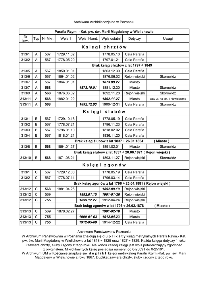 Archiwum Archidiecezjalne w Poznaniu Parafia Rzym. - Kat. pw. św. Marii Magdaleny w Wielichowie Nr inw. Typ Nr Mkr. Wpis 1 Wpis 1-kont. Wpis ostatni Dotyczy Uwagi Księgi chrztów 313/1 A 567 1729.11.02 1778.05.10 Cała Parafia 313/2 A 567 1778.05.20 1797.01.21 Cała Parafia Brak ksiąg chrztów z lat 1797 ÷ 1849 313/5 A 567 1850.01.01 1863.12.30 Cała Parafia 313/6 A 567 1864.01.02 1876.06.02 Rejon wiejski 313/7 A 567 1864.01.01 1873.09.27 Miasto 313/7 A 568 1881.12.30 Miasto Skorowidz 313/9 A 568 1876.06.02 1892.11.28 Rejon wiejski Skorowidz 313/11 A 568 1882.01.22 1892.11.27 Miasto daty ur. na str. 1 niewidoczne 313/11 A 568 1900-12-31 Cała Parafia Skorowidz 1873.10.01 1892.12.03 Skorowidz Księgi ślubów 313/1 B 567 1729.10.18 1778.05.19 Cała Parafia 313/2 B 567 1778.07.21 1796.11.23 Cała Parafia 313/3 B 567 1796.01.10 1818.02.02 Cała Parafia 313/4 B 567 1818.01.21 1836.11.20 Cała Parafia Brak ksiąg ślubów z lat 1837 ÷ 26.01.1864 313/8 B 568 1864.01.27 1891.02.01 Miasto ( Miasto ) Skorowidz Brak ksiąg ślubów z lat 1837 ÷ 20.06.1871 ( Rejon wiejski ) 313/10 B 568 1871.06.21 1893.11.27 Rejon wiejski Skorowidz Księgi zgonów 313/1 C 567 1729.12.03 1778.05.19 Cała Parafia 313/2 C 567 1778.07.14 1796.03.14 Cała Parafia Brak ksiąg zgonów z lat 1796 ÷ 25.04.1881 ( Rejon wiejski ) 313/12 C 568 313/12 C 569 313/12 C 755 1881.04.26 1892.09.19 Rejon wiejski 1892.01.15 1901-01-26 Rejon wiejski 1899.12.27 1912-04-26 Rejon wiejski Brak ksiąg zgonów z lat 1796 ÷ 26.02.1878 313/13 C 569 313/13 C 755 313/13 C 755 1878.02.27 1901-02-18 Miasto 1900-01-03 1912.04.23 Miasto 1912-05-09 1914-12-22 Cała Parafia ( Miasto ) Archiwum Państwowe w Poznaniu W Archiwum Państwowym w Poznaniu znajdują się d u p l i k a t y ksiąg metrykalnych Parafii Rzym.- Kat. pw. św. Marii Magdaleny w Wielichowie z lat 1818 ÷ 1825 oraz 1827 ÷ 1829. Każda księga dotyczy 1 roku i zawiera chrzty, śluby i zgony z tego roku. Na końcu każdej księgi jest wpis potwierdzający zgodność z oryginałem. Mikrofilmy tych ksiąg posiadają numery: od 0-25091 do 0-25101. W Archiwum UM w Kościanie znajduje się d u p l i k t księgi metrykalnej Parafii Rzym.-Kat. pw. św. Marii Magdaleny w Wielichowie z roku 1867. Duplikat zawiera chrzty, śluby i zgony z tego roku.