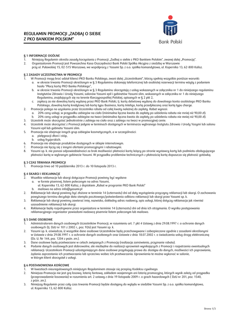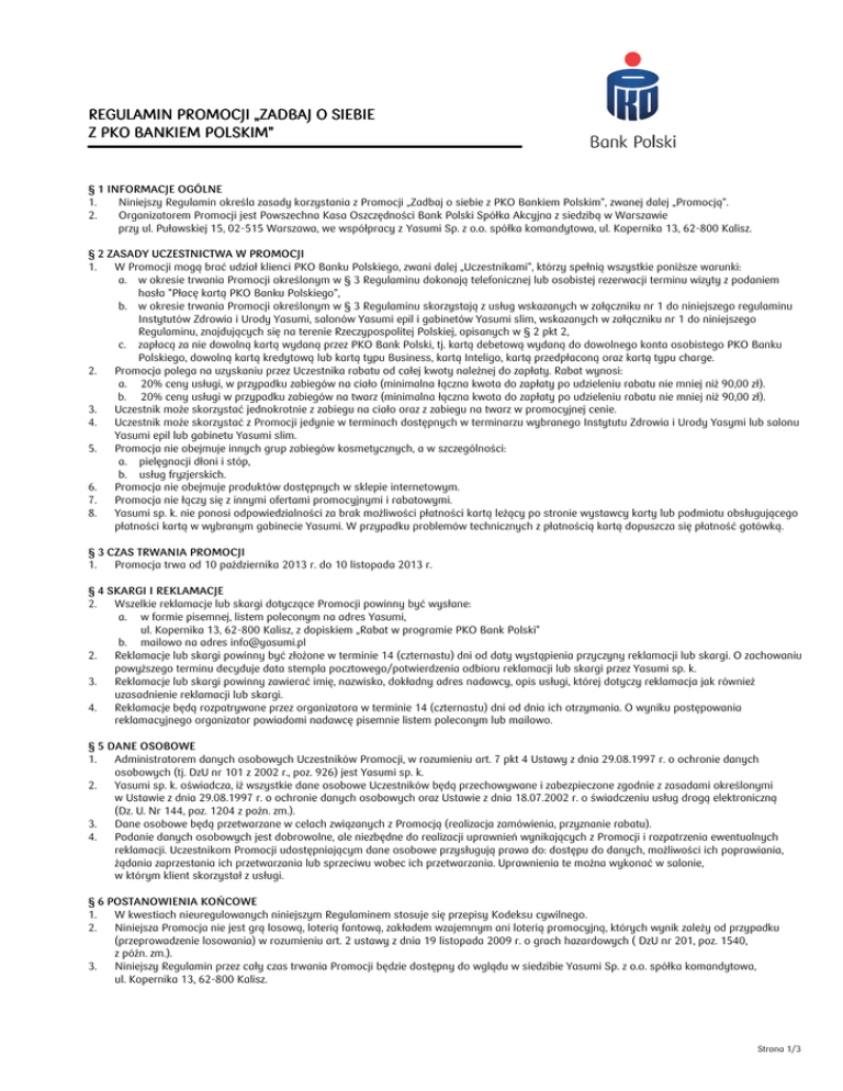 REGULAMIN PROMOCJI PROMOCJI „ZADBAJ „ZADBAJ O SIEBIE Z PKO BANKIEM POLSKIM” POLSKIM” § 1 INFORMACJE OGÓLNE 1. Niniejszy Regulamin określa zasady korzystania z Promocji „Zadbaj o siebie z PKO Bankiem Polskim”, zwanej dalej „Promocją”. 2. Organizatorem Promocji jest Powszechna Kasa Oszczędności Bank Polski Spółka Akcyjna z siedzibą w Warszawie przy ul. Puławskiej 15, 02-515 Warszawa, we współpracy z Yasumi Sp. z o.o. spółka komandytowa, ul. Kopernika 13, 62-800 Kalisz. § 2 ZASADY UCZESTNICTWA W PROMOCJI 1. W Promocji mogą brać udział klienci PKO Banku Polskiego, zwani dalej „Uczestnikami”, którzy spełnią wszystkie poniższe warunki: a. w okresie trwania Promocji określonym w § 3 Regulaminu dokonają telefonicznej lub osobistej rezerwacji terminu wizyty z podaniem hasła ”Płacę kartą PKO Banku Polskiego”, b. w okresie trwania Promocji określonym w § 3 Regulaminu skorzystają z usług wskazanych w załączniku nr 1 do niniejszego regulaminu Instytutów Zdrowia i Urody Yasumi, salonów Yasumi epil i gabinetów Yasumi slim, wskazanych w załączniku nr 1 do niniejszego Regulaminu, znajdujących się na terenie Rzeczypospolitej Polskiej, opisanych w § 2 pkt 2, c. zapłacą za nie dowolną kartą wydaną przez PKO Bank Polski, tj. kartą debetową wydaną do dowolnego konta osobistego PKO Banku Polskiego, dowolną kartą kredytową lub kartą typu Business, kartą Inteligo, kartą przedpłaconą oraz kartą typu charge. 2. Promocja polega na uzyskaniu przez Uczestnika rabatu od całej kwoty należnej do zapłaty. Rabat wynosi: a. 20% ceny usługi, w przypadku zabiegów na ciało (minimalna łączna kwota do zapłaty po udzieleniu rabatu nie mniej niż 90,00 zł). b. 20% ceny usługi w przypadku zabiegów na twarz (minimalna łączna kwota do zapłaty po udzieleniu rabatu nie mniej niż 90,00 zł). 3. Uczestnik może skorzystać jednokrotnie z zabiegu na ciało oraz z zabiegu na twarz w promocyjnej cenie. 4. Uczestnik może skorzystać z Promocji jedynie w terminach dostępnych w terminarzu wybranego Instytutu Zdrowia i Urody Yasymi lub salonu Yasumi epil lub gabinetu Yasumi slim. 5. Promocja nie obejmuje innych grup zabiegów kosmetycznych, a w szczególności: a. pielęgnacji dłoni i stóp, b. usług fryzjerskich. 6. Promocja nie obejmuje produktów dostępnych w sklepie internetowym. 7. Promocja nie łączy się z innymi ofertami promocyjnymi i rabatowymi. 8. Yasumi sp. k. nie ponosi odpowiedzialności za brak możliwości płatności kartą leżący po stronie wystawcy karty lub podmiotu obsługującego płatności kartą w wybranym gabinecie Yasumi. W przypadku problemów technicznych z płatnością kartą dopuszcza się płatność gotówką. § 3 CZAS TRWANIA PROMOCJI 1. Promocja trwa od 10 października 2013 r. do 10 listopada 2013 r. § 4 SKARGI I REKLAMACJE 2. Wszelkie reklamacje lub skargi dotyczące Promocji powinny być wysłane: a. w formie pisemnej, listem poleconym na adres Yasumi, ul. Kopernika 13, 62-800 Kalisz, z dopiskiem „Rabat w programie PKO Bank Polski” b. mailowo na adres [email protected] 2. Reklamacje lub skargi powinny być złożone w terminie 14 (czternastu) dni od daty wystąpienia przyczyny reklamacji lub skargi. O zachowaniu powyższego terminu decyduje data stempla pocztowego/potwierdzenia odbioru reklamacji lub skargi przez Yasumi sp. k. 3. Reklamacje lub skargi powinny zawierać imię, nazwisko, dokładny adres nadawcy, opis usługi, której dotyczy reklamacja jak również uzasadnienie reklamacji lub skargi. 4. Reklamacje będą rozpatrywane przez organizatora w terminie 14 (czternastu) dni od dnia ich otrzymania. O wyniku postępowania reklamacyjnego organizator powiadomi nadawcę pisemnie listem poleconym lub mailowo. § 5 DANE OSOBOWE 1. Administratorem danych osobowych Uczestników Promocji, w rozumieniu art. 7 pkt 4 Ustawy z dnia 29.08.1997 r. o ochronie danych osobowych (tj. DzU nr 101 z 2002 r., poz. 926) jest Yasumi sp. k. 2. Yasumi sp. k. oświadcza, iż wszystkie dane osobowe Uczestników będą przechowywane i zabezpieczone zgodnie z zasadami określonymi w Ustawie z dnia 29.08.1997 r. o ochronie danych osobowych oraz Ustawie z dnia 18.07.2002 r. o świadczeniu usług drogą elektroniczną (Dz. U. Nr 144, poz. 1204 z poźn. zm.). 3. Dane osobowe będą przetwarzane w celach związanych z Promocją (realizacja zamówienia, przyznanie rabatu). 4. Podanie danych osobowych jest dobrowolne, ale niezbędne do realizacji uprawnień wynikających z Promocji i rozpatrzenia ewentualnych reklamacji. Uczestnikom Promocji udostępniającym dane osobowe przysługują prawa do: dostępu do danych, możliwości ich poprawiania, żądania zaprzestania ich przetwarzania lub sprzeciwu wobec ich przetwarzania. Uprawnienia te można wykonać w salonie, w którym klient skorzystał z usługi. § 6 POSTANOWIENIA KOŃCOWE 1. W kwestiach nieuregulowanych niniejszym Regulaminem stosuje się przepisy Kodeksu cywilnego. 2. Niniejsza Promocja nie jest grą losową, loterią fantową, zakładem wzajemnym ani loterią promocyjną, których wynik zależy od przypadku (przeprowadzenie losowania) w rozumieniu art. 2 ustawy z dnia 19 listopada 2009 r. o grach hazardowych ( DzU nr 201, poz. 1540, z późn. zm.). 3. Niniejszy Regulamin przez cały czas trwania Promocji będzie dostępny do wglądu w siedzibie Yasumi Sp. z o.o. spółka komandytowa, ul. Kopernika 13, 62-800 Kalisz. Strona 1/3 Załącznik nr 1 do Regulaminu Promocji „Zadbaj o siebie z PKO Bankiem Polskim" Lista Instytutów Zdrowia i Urody Urody Yasumi Yasumi, Yasumi epil i gabinetów gabinetów Yasumi Yasumi slim asumi, salonów Yasumi miasto Białystok adres kod pocztowy Waryńskiego 3/5 15-460 Żywiecka 132 43-300 Bochnia Rynek 12 32-700 Bydgoszcz Glinki 58 85-174 Bydgoszcz Chodkiewicza 14/12 85-064 Bytom Podgórna 4 41-902 Gdynia Leopolda Staffa 16 81-597 Gliwice Świętokrzyska 1c 44-100 Gliwice Mikołowska 25 44-100 Głogów św. Mikołaja 4 67-200 Bielsko
