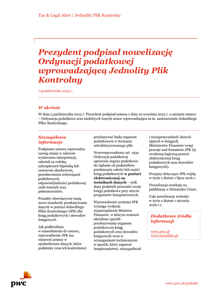 Tax & Legal Alert / Jednolity Plik Kontrolny Prezydent podpisał nowelizację Ordynacji podatkowej wprowadzającą Jednolity Plik Kontrolny 7 października 2015 r. W skrócie W dniu 5 października 2015 r. Prezydent podpisał ustawę z dnia 10 września 2015 r. o zmianie ustawy – Ordynacja podatkowa oraz niektórych innych ustaw wprowadzająca m.in. zastosowanie Jednolitego Pliku Kontrolnego. Szczegółowe informacje Podpisana ustawa wprowadza szereg zmian w zakresie wydawania interpretacji, odsetek za zwłokę, zabezpieczeń hipoteką lub zastawem skarbowym, przedawnienia zobowiązań podatkowych, odpowiedzialności podatkowej osób trzecich oraz pełnomocnictw. Ponadto obowiązywać mają nowe standardy przekazywania danych w postaci Jednolitego Pliku Kontrolnego (JPK) dla ksiąg podatkowych i dowodów księgowych. Jak podkreślano w uzasadnieniu do ustawy, wprowadzenie JPK ma stanowić pomoc w ujednoliceniu danych, które podatnicy oraz ich kontrahenci przekazywać będą organom podatkowym w formacie ustrukturyzowanego plik. Nowowprowadzony art. 193a Ordynacji podatkowej uprawnia organy podatkowe do żądania od podatników przekazania całości lub części ksiąg podatkowych w postaci elektronicznej na nośnikach danych – jeśli dany podatnik prowadzi swoje księgi podatkowe przy użyciu programów komputerowych. Wprowadzenie systemu JPK wymaga wydania rozporządzenia Ministra Finansów, w którym zostanie określony sposób przekazywania organom podatkowym ksiąg podatkowych oraz dowodów księgowych wraz w wymaganiami technicznymi w sposób, który zapewni bezpieczeństwo, wiarygodność i niezaprzeczalność danych ujętych w księgach. Ministerstw Finansów wciąż pracuje nad formatem JPK (tj. strukturą logiczną postaci elektronicznej ksiąg podatkowych oraz dowodów księgowych). Przepisy dotyczące JPK wejdą w życie z dniem 1 lipca 2016 r. Nowelizacja oczekuje na publikację w Dzienniku Ustaw. Cała nowelizacja wchodzi w życie z dniem 1 stycznia 2016 r.r. Dodatkowe źródła informacji www.pwc.pl www.taxonline.pl www.pwc.pl/podatki Tax & Legal Alert Porozmawiajmy W razie jakichkolwiek wątpliwości i pytań związanych z powyższą informacją, prosimy o kontakt z osobami wskazanymi poniżej: Marcin Sidelnik Dyrektor tel. +48 22 746 4961 [email protected] Marcin Madej Starszy menedżer + 48 502 184 296 [email protected] Zastrzeżenie prawne: Publikacja ma jedynie charakter informacyjny i nie stanowi porady podatkowej w rozumieniu polskich przepi sów, w szczególności Ustawy z dnia 5 lipca 1996 r. o doradztwie podatkowym. Nie powinni Państwo opierać swoich działań/decyzji na treści informacji zawartych w tej publikacji bez uprzedniego uzyskania profesjonalnej porady. © 2015 PricewaterhouseCoopers Sp. z o.o. Wszystkie prawa zastrzeżone. W tym dokumencie nazwa "PwC" odnosi się do PricewaterhouseCoopers Sp. z o.o., firmy wchodzącej w skład sieci PricewaterhouseCoopers International Limited, z których każda stanowi odrębny i niezależny podmiot prawny.