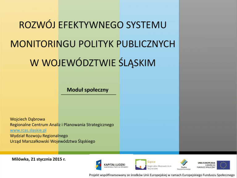 ROZWÓJ EFEKTYWNEGO SYSTEMU MONITORINGU POLITYK PUBLICZNYCH W WOJEWÓDZTWIE ŚLĄSKIM Moduł społeczny Wojciech Dąbrowa Regionalne Centrum Analiz i Planowania Strategicznego www.rcas.slaskie.pl Wydział Rozwoju Regionalnego Urząd Marszałkowski Województwa Śląskiego Milówka, 21 stycznia 2015 r. Projekt współfinansowany ze środków Unii Europejskiej w ramach Europejskiego Funduszu Społecznego Skład zespołu badawczego Zespół badawczy: Regionalne Centrum Analiz i Planowania Strategicznego Wojciech Dąbrowa Aleksandra Pitura Aleksandra Sekienda Agata Sierzchała Konsultant: Górnośląska Wyższa Szkoła Handlowa dr Aleksander Wolski Charakterystyka modułu społecznego Badania wchodzące w skład modułu społecznego mają na celu zlokalizowanie oraz zmierzenie poziomu aktywności i niedostosowania społecznego cechujących mieszkańców województwa śląskiego Naczelnym celem analizy danych jest wskazanie zróżnicowania terytorialnego działań w zakresie aktywności bądź niedostosowania społecznego. Zjawiska społeczne opisywane będą na trzech poziomach terytorialnych NTS 2 • województwa NTS 3 • podregionów NTS 4 • powiatów Tematy raportów Aktywność społeczna Niedostosowanie społeczne Definicje Aktywność społeczna: Czynny, świadomy udział jednostki lub grupy w życiu społeczeństwa, przeważnie nakierowany na realizację konkretnego celu; podejmowanie działań mających na celu nawiązanie kontaktów z innymi jednostkami lub grupą społeczną. (Krzysztof Olechnicki, Paweł Załęcki, Słownik socjologiczny, Toruń 1998) Niedostosowanie społeczne: Sytuacja, w której jednostka lub grupa nie umie odnaleźć swojego miejsca w społeczeństwie i nie ma niezbędnej kompetencji kulturowej. (Krzysztof Olechnicki, Paweł Załęcki, Słownik socjologiczny, Toruń 1998) Źródła informacji – analiza statystyczna z baz danych ROPS • • • • korzystający z pomocy świadczenia (rodzaje, odbiorcy, przyczyny przyznawania) system pieczy zastępczej ośrodki wsparcia i usługi opiekuńcze w miejscu zamieszkania KWP Katowice • przestępczość (w tym przemoc domowa) • samobójstwa PKW • aktywność polityczna (bierne prawo wyborcze, czynne prawo wyborcze) Baza REGON • aktywne NGO`s w podziale wg ich formy prawnej BDL GUS • ubóstwo • przedsiębiorczość Źródła informacji – CATI Aktywność społeczna wśród mieszkańców województwa śląskiego adresaci udzielanej pomocy, działalność charytatywna, działalność dla organizacji pozarządowych, aktywność niezorganizowana. Zaufanie społeczne wśród mieszkańców województwa śląskiego adresaci zaufania, poziom zaufania ogólnego, poziom zaufania do instytucji. Zarys raportu – aktywność społeczna 1. Wstęp. 2. Teoria aktywności społecznej. 3. Metodologia badań. 4. Aktywność polityczna jako jeden z rodzajów aktywności społecznej. 5. Aktywność NGO’s jako jeden z rodzajów aktywności społecznej. 6. Przedsiębiorczość jako jeden z rodzajów aktywności społecznej. 7. Wyniki badania CATI w zakresie aktywności społecznej mieszkańców województwa śląskiego. 8. Wyniki badania CATI w zakresie zaufania społecznego mieszkańców województwa śląskiego. 9. Mapa aktywności społecznej. 10. Podsumowanie. Zarys raportu – niedostosowanie społeczne 1. Wstęp. 2. Teoria niedostosowania społecznego. 3. Metodologia badań. 4. Ubóstwo. 5. Korzystający z pomocy społecznej. 6. Alkoholizm i narkomania. 7. Samobójstwa. 8. Przestępczość. 9. Przemoc domowa. 10. Mapa niedostosowania społecznego. 11. Podsumowanie. Wskaźnik syntetyczny Budowa wskaźnika umożliwia: Wskaźnik 2 Wskaźnik 1 Obrazowanie skomplikowanego zjawiska bez przedstawiania wielu wskaźników. Wskaźnik 3 Jasne i klarowne przedstawienie zjawiska w pojedynczym wykresie bądź mapie. Proste przedstawienie rozkładu terytorialnego na mapie. Wskaźnik syntetyczny Wskaźnik aktywności społecznej Wskaźnik przedsiębiorczości Wskaźnik aktywności politycznej Wskaźnik aktywności NGO`s Wskaźnik aktywności społecznej - stymulanty Wskaźnik przedsiębiorczości: Liczba podmiotów wpisanych do rejestru REGON przypadających na 10 tys. mieszkańców. Liczba podmiotów nowo zarejestrowanych w rejestrze REGON przypadających na 10 tys. mieszkańców. Liczba osób fizycznych prowadzących działalność gospodarczą na 100 osób w wieku produkcyjnym. Wskaźnik aktywności politycznej: Liczba kandydatów do rad powiatu i miasta przypadających na 10 tys. mieszkańców Frekwencja w pierwszym głosowaniu wyborów do samorządu terytorialnego. Wskaźnik aktywności NGO’s: Liczba aktywnych organizacji pozarządowych przypadających na 10 tys. mieszkańców. Wskaźnik niedostosowania społecznego Wskaźnik przestępczości Wskaźnik samobójstw Wskaźnik potrzebujących pomocy społecznej Wskaźnik niedostosowania społecznego - destymulanty Wskaźnik przestępczości: Przestępstwa ogółem przypadające na 10 tys. mieszkańców. Przestępstwa kryminalne przypadające na 10 tys. mieszkańców. Liczba kradzieży przypadających na 10 tys. mieszkańców. Liczba włamań przypadających na 10 tys. mieszkańców. Liczba rozbojów przypadających na 10 tys. mieszkańców. Liczba bójek i pobić przypadających na 10 tys. mieszkańców. Liczba uszkodzeń mienia przypadających na 10 tys. mieszkańców. Wskaźnik samobójstw: Liczba samobójstw przypadających na 10 tys. mieszkańców. Wskaźnik potrzebujących pomocy społecznej: Liczba osób w rodzinach pobierających świadczenia z pomocy społecznej przypadających na 10 tys. mieszkańców. Liczba osób objętych wyłącznie pomocą społeczną w postaci pracy socjalnej przypadających na 10 tys. mieszkańców. Liczba dzieci umieszczonych w pieczy zastępczej przypadających na 10 tys. mieszkańców. Tworzenie wskaźnika syntetycznego 1. Normalizacja wskaźnika a) Normalizacja stymulant 𝒁𝒋 = 𝑿𝒊𝒋 −𝑿𝒋 𝑺𝒋 czyli wskaźnik znormal