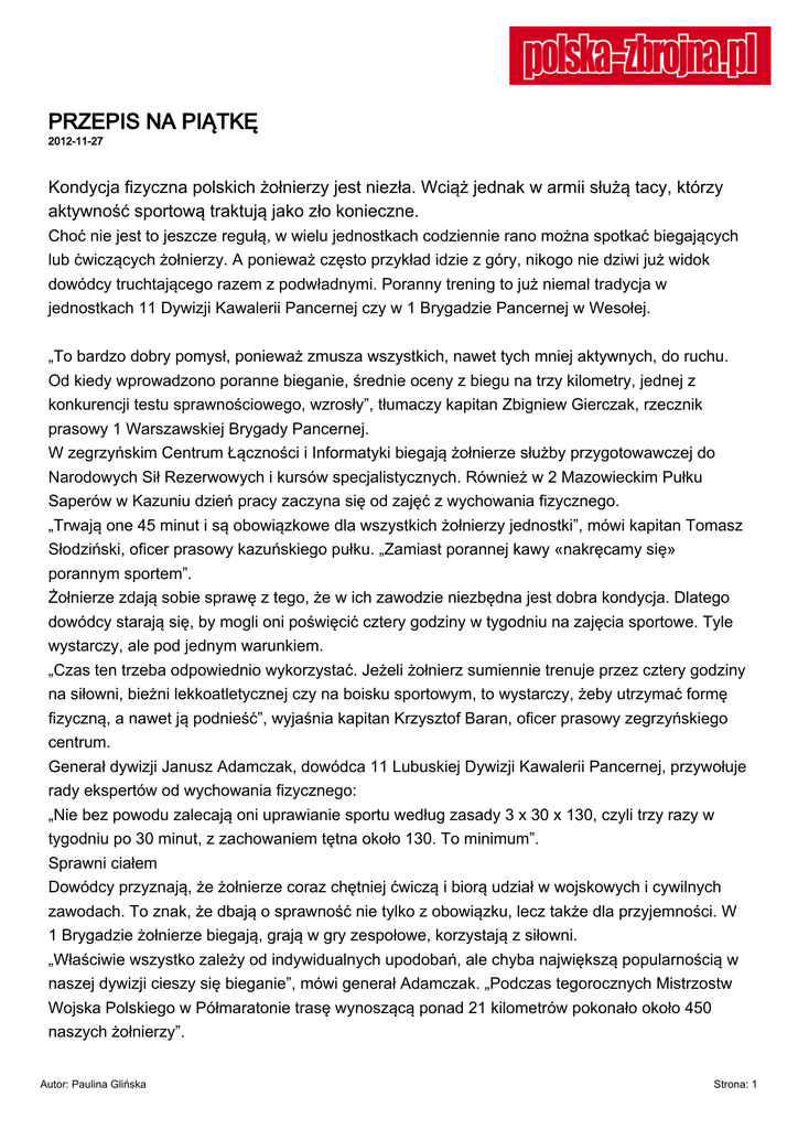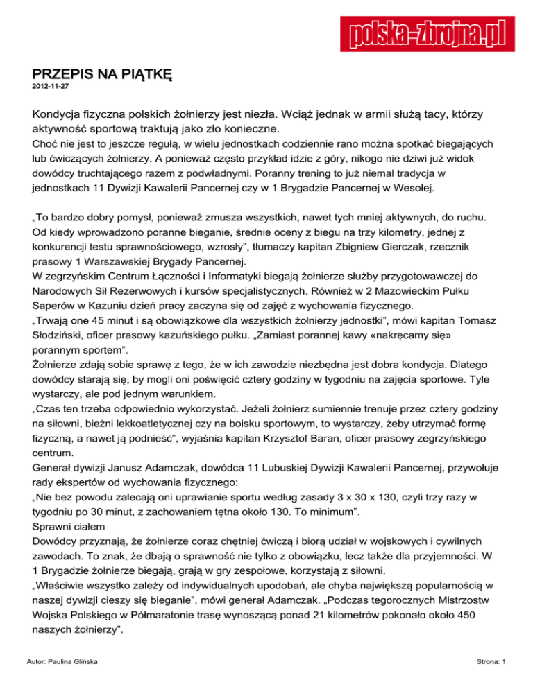PRZEPIS NA PIĄTKĘ 2012-11-27 Kondycja fizyczna polskich żołnierzy jest niezła. Wciąż jednak w armii służą tacy, którzy aktywność sportową traktują jako zło konieczne. Choć nie jest to jeszcze regułą, w wielu jednostkach codziennie rano można spotkać biegających lub ćwiczących żołnierzy. A ponieważ często przykład idzie z góry, nikogo nie dziwi już widok dowódcy truchtającego razem z podwładnymi. Poranny trening to już niemal tradycja w jednostkach 11 Dywizji Kawalerii Pancernej czy w 1 Brygadzie Pancernej w Wesołej. „To bardzo dobry pomysł, ponieważ zmusza wszystkich, nawet tych mniej aktywnych, do ruchu. Od kiedy wprowadzono poranne bieganie, średnie oceny z biegu na trzy kilometry, jednej z konkurencji testu sprawnościowego, wzrosły”, tłumaczy kapitan Zbigniew Gierczak, rzecznik prasowy 1 Warszawskiej Brygady Pancernej. W zegrzyńskim Centrum Łączności i Informatyki biegają żołnierze służby przygotowawczej do Narodowych Sił Rezerwowych i kursów specjalistycznych. Również w 2 Mazowieckim Pułku Saperów w Kazuniu dzień pracy zaczyna się od zajęć z wychowania fizycznego. „Trwają one 45 minut i są obowiązkowe dla wszystkich żołnierzy jednostki”, mówi kapitan Tomasz Słodziński, oficer prasowy kazuńskiego pułku. „Zamiast porannej kawy «nakręcamy się» porannym sportem”. Żołnierze zdają sobie sprawę z tego, że w ich zawodzie niezbędna jest dobra kondycja. Dlatego dowódcy starają się, by mogli oni poświęcić cztery godziny w tygodniu na zajęcia sportowe. Tyle wystarczy, ale pod jednym warunkiem. „Czas ten trzeba odpowiednio wykorzystać. Jeżeli żołnierz sumiennie trenuje przez cztery godziny na siłowni, bieżni lekkoatletycznej czy na boisku sportowym, to wystarczy, żeby utrzymać formę fizyczną, a nawet ją podnieść”, wyjaśnia kapitan Krzysztof Baran, oficer prasowy zegrzyńskiego centrum. Generał dywizji Janusz Adamczak, dowódca 11 Lubuskiej Dywizji Kawalerii Pancernej, przywołuje rady ekspertów od wychowania fizycznego: „Nie bez powodu zalecają oni uprawianie sportu według zasady 3 x 30 x 130, czyli trzy razy w tygodniu po 30 minut, z zachowaniem tętna około 130. To minimum”. Sprawni ciałem Dowódcy przyznają, że żołnierze coraz chętniej ćwiczą i biorą udział w wojskowych i cywilnych zawodach. To znak, że dbają o sprawność nie tylko z obowiązku, lecz także dla przyjemności. W 1 Brygadzie żołnierze biegają, grają w gry zespołowe, korzystają z siłowni. „Właściwie wszystko zależy od indywidualnych upodobań, ale chyba największą popularnością w naszej dywizji cieszy się bieganie”, mówi generał Adamczak. „Podczas tegorocznych Mistrzostw Wojska Polskiego w Półmaratonie trasę wynoszącą ponad 21 kilometrów pokonało około 450 naszych żołnierzy”. Autor: Paulina Glińska Strona: 1 Zegrzyńscy łącznościowcy trenują w sekcjach piłki koszykowej, siatkowej, tenisa ziemnego i stołowego. Grupę systematycznie ćwiczących żołnierzy tworzy około 40 osób. W 2011 roku z inicjatywy biegaczy amatorów przy Klubie Wojskowym „Centrum” powstała sekcja rekreacji ruchowej. Jej członkowie, między innymi major Adam Goździewski, kapitan Robert Gawkowski, młodszy chorąży Marian Ścibor i chorąży sztabowy Piotr Drzewiecki, nie tylko biegają, lecz także uczestniczą w regatach żeglarskich oraz startują w zawodach w kolarstwie górskim MTB organizowanych przez instytucje cywilne. Zegrze reprezentuje również Sylwia Bogacka, srebrna medalistka Igrzysk Olimpijskich w Londynie w strzelectwie sportowym. W 1 Brygadzie Pancernej grupy biegających żołnierzy widać zarówno wcześnie rano, jak i po godzinach pracy. „Mamy grupę biegaczy pod przewodnictwem starszego szeregowego Artura Błaszczyka, który swoją pasją zaraził kolegów z jednostki”, mówi kapitan Gierczak. „Nasi pancerniacy biorą udział w maratonach i biegach na krótkie dystanse. Są też u nas amatorzy siłowni czy miłośnicy walki wręcz”. Kazuńscy saperzy też chętnie angażują się w różnego rodzaju rywalizację sportową: startują w maratonach i biegach przełajowych. Kapitan Słodziński przyznaje, że grono biegających żołnierzy cały czas się powiększa. Nie mniejszą popularnością cieszy się piłka nożna. „W 2012 roku drużyna zajęła trzecie miejsce w turnieju służb mundurowych w Legionowie”, mówi rzecznik 2 Pułku. „W poprzedniej edycji zwyciężyła. Niebawem zacznie też działać zespół piłki siatkowej”. 11 Dywizja od trzech lat plasuje się w czołówce we współzawodnictwie sportowym na szczeblu Wojska Polskiego. „W 2009 roku tylko dwoma punktami przegraliśmy walkę o miejsce na podium”, mówi generał Adamczak. „Rok później zdobyliśmy już srebrny krążek, a w 2011 roku złoto. Wiele wskazuje na to, że i w tym roku będziemy najlepsi”. W szeregach Jedenastej jest wielu medalistów w różnych dyscyplinach sportowych. W 10 Brygadzie Kawalerii Pancernej służą między innymi starszy szeregowy Marcin Horbacz, dwukrotny uczestnik letnich igrzysk olimpijskich startujący w pięcioboju nowoczesnym, starszy chorąży Mariusz Plesiński, medalista mistrzostw Wojska Polskiego w maratonie, półmaratonie, biegach na orientację i innych cywilnych zawodach. Starszy szeregowy Łukasz Szostak z 17 Wielkopolskiej Brygady Zmechanizowanej to mistrz w strzelaniu z karabinka kbk AK. Złej baletnicy… Coraz więcej jednostek ma do dyspozycji zmodernizowane hale i obiekty sportowe: siłownie, bieżnie, tory przeszkód. Żołnierze mają zatem możliwość, żeby dbać o kondycję, i jeśli naprawdę chcą ćwiczyć, zawsze znajdą czas. Gorzej z tymi, którzy ze sportem są nieco na bakier. Dowódca 11 Dywizji podkreśla, że u młodego człowieka wyrobienie nawyku dbałości o swoje zdrowie, sprawność i kondycję jest warunkiem koniecznym dla żołnierza: „To powinno odbywać się na wszystkich etapach r