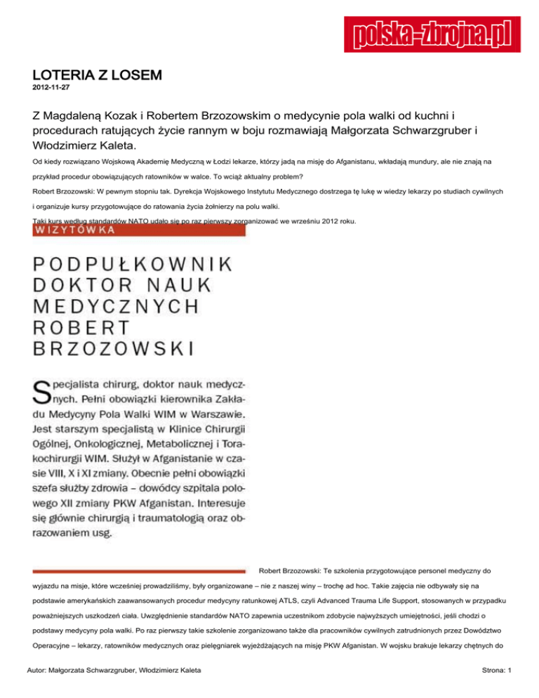 LOTERIA Z LOSEM 2012-11-27 Z Magdaleną Kozak i Robertem Brzozowskim o medycynie pola walki od kuchni i procedurach ratujących życie rannym w boju rozmawiają Małgorzata Schwarzgruber i Włodzimierz Kaleta. Od kiedy rozwiązano Wojskową Akademię Medyczną w Łodzi lekarze, którzy jadą na misję do Afganistanu, wkładają mundury, ale nie znają na przykład procedur obowiązujących ratowników w walce. To wciąż aktualny problem? Robert Brzozowski: W pewnym stopniu tak. Dyrekcja Wojskowego Instytutu Medycznego dostrzega tę lukę w wiedzy lekarzy po studiach cywilnych i organizuje kursy przygotowujące do ratowania życia żołnierzy na polu walki. Taki kurs według standardów NATO udało się po raz pierwszy zorganizować we wrześniu 2012 roku. Robert Brzozowski: Te szkolenia przygotowujące personel medyczny do wyjazdu na misje, które wcześniej prowadziliśmy, były organizowane – nie z naszej winy – trochę ad hoc. Takie zajęcia nie odbywały się na podstawie amerykańskich zaawansowanych procedur medycyny ratunkowej ATLS, czyli Advanced Trauma Life Support, stosowanych w przypadku poważniejszych uszkodzeń ciała. Uwzględnienie standardów NATO zapewnia uczestnikom zdobycie najwyższych umiejętności, jeśli chodzi o podstawy medycyny pola walki. Po raz pierwszy takie szkolenie zorganizowano także dla pracowników cywilnych zatrudnionych przez Dowództwo Operacyjne – lekarzy, ratowników medycznych oraz pielęgniarek wyjeżdżających na misję PKW Afganistan. W wojsku brakuje lekarzy chętnych do Autor: Małgorzata Schwarzgruber, Włodzimierz Kaleta Strona: 1 pracy za granicą i armia zatrudnia ochotników z cywila. Na tym kursie personel medyczny poznawał doktrynę medyczną NATO, strukturę wojskowej służby zdrowia, sposoby działania medyków w warunkach wojennych oraz ratowania życia żołnierzy w razie zagrożenia. Procedur można się nauczyć na szkoleniach. To teoria. A co z praktyką? Robert Brzozowski: Uczestnicy kursu mieli dyżury medyczne w wybranych klinikach WIM oraz szpitalnym oddziale ratunkowym. Odbyli także tygodniowe warsztaty, na których zdobywali umiejętności praktycznego ratownictwa medycznego; wykorzystywano do tego celu fantomy oraz tkanki zwierzęce. Te ćwiczenia opierały się na realnych scenariuszach wybranych problemów klinicznych, najbardziej typowych na misji. Wykonywano w ich trakcie drenaże jamy opłucnej, tracheostomie na świńskich tchawicach, opatrywano rany. W przyszłości chcemy poszerzyć szkolenia dla chirurgów – będą oni uczyć się technik operacyjnych najpierw w prosektorium, na zwłokach, a następnie w czasie asysty przy prawdziwych zabiegach podczas ostrych dyżurów. W naszym centrum urazowym w WIM jest sporo ciężkich przypadków, choć obrażenia doznane w Afganistanie mają nieco inną specyfikę. Ważna jest właściwa taktyka postępowania i sprawna kwalifikacja pacjenta tylko na podstawie prostych badań ultrasonograficznych według procedury e-FAST i radiologicznych, oceny chirurga, a następnie szybkie przewiezienie go na salę operacyjną i wykonanie zabiegów ratujących życie w trybie damage control. W Afganistanie tomograf komputerowy jest dostępny dopiero w szpitalu wyższego poziomu, w Bagram. Możemy się jednak pochwalić tym, że nasze laboratorium działa sprawniej niż w Polsce, oznaczenie grupy krwi i wykonanie podstawowych badań trwa dwie, trzy minuty. Jedna jaskółka nie czyni wiosny. Czy kurs jest początkiem zmian w systemie przygotowywania personelu medycznego do pracy na misjach? Robert Brzozowski: Dobra współpraca z Dowództwem Operacyjnym, które rozumie wagę profesjonalnego przygotowania personelu medycznego do służby poza granicami kraju, pozwala z optymizmem patrzeć w przyszłość. Na podstawie wrześniowego kursu zamierzamy opracować standardy takich szkoleń; zarówno dla medyków umundurowanych, jak i cywilnych. Będziemy przekazywać kursantom teoretyczną i praktyczną wiedzę z przedmiotu nazywanego medycyną pola walki. Jakie wiedza i umiejętności potrzebne są medykom na misji? Autor: Małgorzata Schwarzgruber, Włodzimierz Kaleta Strona: 2 Magdalena Kozak: Opowiem na własnym przykładzie. Wyjechałam do Afganistanu jako cywil. Kiedy zdecydowałam się na ten wyjazd, pierwsze kroki skierowałam do Wojskowego Instytutu Medycznego. Nie organizowano tu wówczas żadnych szkoleń, ale generał Grzegorz Gielerak, dyrektor instytutu, pozwolił na bezpłatną praktykę w szpitalnym oddziale ratunkowym. Przez kilka miesięcy podpatrywałam pracę lekarzy, a oni chętnie dzielili się swoimi doświadczeniami. Do Afganistanu wyjechałam na VII zmianę PKW. Odczuwałam brak wojskowego przeszkolenia. Nie znałam na przykład procedur medycyny pola walki. Czułam, że jestem niedostatecznie przygotowana do pracy na misji i to mnie niepokoiło. Sprawdziły się Pani obawy? Magdalena Kozak: Miałam do czynienia z wieloma drastycznymi przypadkami, na które nie byłam przygotowana. Pomagaliśmy bowiem nie tylko naszym żołnierzom, lecz także wojskowym i policjantom afgańskim. Często trafiali oni do szpitala bez kończyn, z rozległymi ranami klatki piersiowej – takie obrażenia wyjątkowo zdarzają się podczas dyżurów w naszych szpitalach wojskowych w kraju. Zastanawiałam się, czy cała wrócę do kraju. Medycy w Afganistanie pracują zazwyczaj w pewnym oddaleniu od rejonu walk. Czy mają mniej powodów do obaw o życie? Robert Brzozowski: Ratownicy medyczni, wojskowi i cywilni są zawsze z żołnierzami na pierwszej linii – w każdym konwoju, na każdym patrolu. Autor: Małgorzata Schwarzgruber, Włodzimierz Kaleta Strona: 3 Narażają życie podobnie jak żołnierze. Lekarze natomiast rzadko opuszczają bazę. Pomagają rannym w szpitalu polowym. Magdalena Kozak: Zostałam ranna w wyniku wybuchu talibskiej rakiety, kiedy byłam w „bezpiecznym” oddaleniu od pierwszej linii. Zdarza się, że alarmy przeciwrakietowe są ogłaszane w momenc