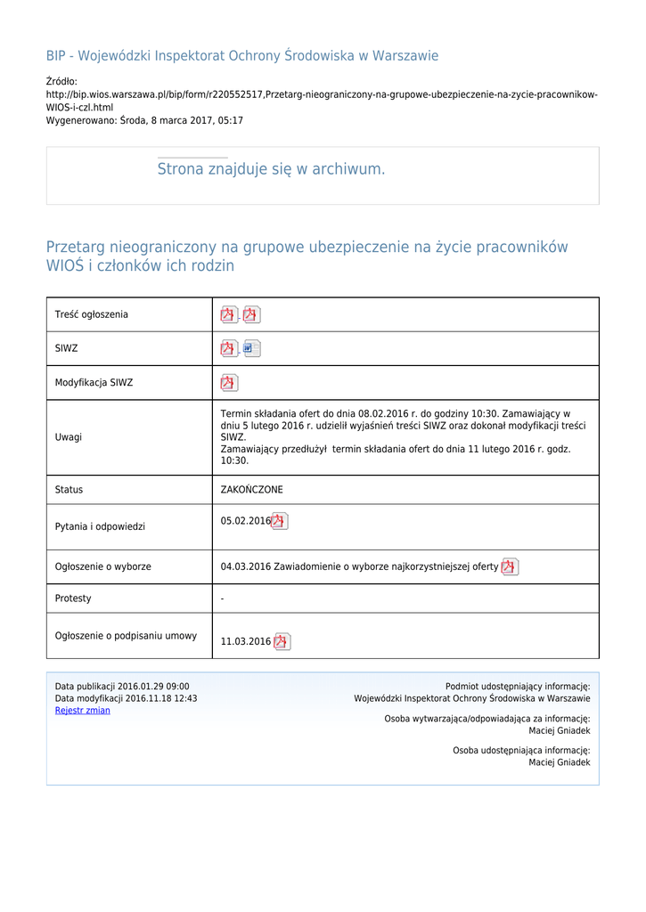 BIP - Wojewódzki Inspektorat Ochrony Środowiska w Warszawie Źródło: http://bip.wios.warszawa.pl/bip/form/r220552517,Przetarg-nieograniczony-na-grupowe-ubezpieczenie-na-zycie-pracownikowWIOS-i-czl.html Wygenerowano: Środa, 8 marca 2017, 05:17 Strona znajduje się w archiwum. Przetarg nieograniczony na grupowe ubezpieczenie na życie pracowników WIOŚ i członków ich rodzin Treść ogłoszenia SIWZ Modyfikacja SIWZ Uwagi Termin składania ofert do dnia 08.02.2016 r. do godziny 10:30. Zamawiający w dniu 5 lutego 2016 r. udzielił wyjaśnień treści SIWZ oraz dokonał modyfikacji treści SIWZ. Zamawiający przedłużył termin składania ofert do dnia 11 lutego 2016 r. godz. 10:30. Status ZAKOŃCZONE Pytania i odpowiedzi 05.02.2016 Ogłoszenie o wyborze 04.03.2016 Zawiadomienie o wyborze najkorzystniejszej oferty Protesty - Ogłoszenie o podpisaniu umowy Data publikacji 2016.01.29 09:00 Data modyfikacji 2016.11.18 12:43 Rejestr zmian 11.03.2016 Podmiot udostępniający informację: Wojewódzki Inspektorat Ochrony Środowiska w Warszawie Osoba wytwarzająca/odpowiadająca za informację: Maciej Gniadek Osoba udostępniająca informację: Maciej Gniadek