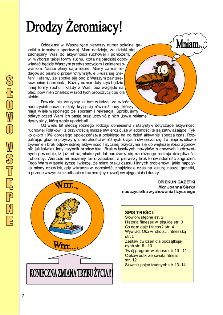 Oddajemy w Wasze ręce pierwszy numer szkolnej gazetki o tematyce sportow ej. Mam nadzieję, że dzięki niej zachęcimy Was do aktyw ności ruchowej i pomożemy w wyborze takiej formy ruchu, która najbardziej odpowiadać będzie Waszym predyspozycjom i zainteresowaniom. Nasze plany są ambitne. Mamy zamiar redagow ać pismo o przew rotnym tytule „Rusz się Stefan” i ufamy, że spotka się ono z Waszym zainteresow aniem i aprobatą. Każdy numer dotyczyć będzie innej formy ruchu i każdy z Was, bez względu na płeć, pow inien znaleźć w śród tych propozycji coś dla siebie. Pew nie nie wszyscy o tym w iedzą, że wśród nauczycieli naszej szkoły kryją się rów nież tacy, którzy mają w iele wspólnego ze sportem i rekreacją. Spróbujemy odkryć przed Wami ich pasję oraz uczynić z nich „żyw ą reklamę” dyscypliny, którą sobie upodobali. Od w ielu lat śledzę różnego rodzaju doniesienia i statystyki dotyczące aktywności ruchow ej Polaków i z przykrością muszę stw ierdzić, że w iadomości te są zatrw ażające. Tylko około 10% dorosłego społeczeństwa polskiego na co dzień aktyw nie spędza czas. Rozpatrując głów ne przyczyny umieralności w różnych krajach stw ierdza się, że niepraw idłow e żywienie i brak odpow iedniej aktyw ności fizycznej przyczynia się do większej ilości zgonów niż jakikolw iek inny czynnik środow is ka. Brak w łaściw ych nawyków ruchowych i zdrowotnych pow oduje, iż już od najmłodszych lat narażamy się na różnego rodzaju dolegliw ości i choroby. Wierzcie mi możemy temu zapobiec, a pierw szy krok to św iadomość zagrożeń. Tego Wam w łaśnie życzę i wierzę, że mimo braku czasu i innych problemów , jakie napotyka młody człow iek, gdy w kracza w dorosłość, znajdziecie czas na lekturę naszej gazetki, a przede wszystkim zadbacie o harmonijny rozwój sw ojego ciała i duszy. OPIEKUN GAZ ETKI Mgr Joanna Sierka nauczycielka w ychow ania fizycznego SPIS TREŚCI: Słow o wstępne str. 2 Historia fitnessu w pigułce str. 3 Co nam daje fitness? str. 4 Wyw iad: Oko w oko z… fitnesską str. 5 Zestaw ćwiczeń dla początkujących str. 6– 10 Tw ój program w ellness str.10 –11 Ciekaw ostki ze świata fitness str. 12 Słow nik pojęć trudnych str.13–14 2 Oprócz niew ątpliwych korzyści dla naszego organizmu, trening fizyczny czy jakikolw iek przejaw aktywności ruchow ej jest wspaniałą formą odpoczynku psychicznego. W trakcie ćw iczeń zapominamy o całym św iecie i sw oją uw agę pośw ięcamy wyłącznie treningow i. Wszelkie problemy dnia codziennego odsuw amy na dalszy plan, na parę chw il możemy oderw ać się od rzeczywis tości. . "W zdrow ym ciele zdrow y duch" Znana już w starożytności prawda znajduje potw ierdzenie w badaniach współczesnyc h medy ków . Jednak nie samy m samopoczuciem żyje człow iek ćw ic ząc, sprawiamy, że nasze życie staje się lepsze, bo lepszy staje się nasz organizm. Najistotniejsze zmiany pod w pływ em aktyw ności fizycznej zachodzą w czynnościach układu oddechow ego, kr ąż enia, mec haniz mac h kontroli metaboliz mu oraz mięś niac h sz kieletow ych. Wpływ ruchu na Twój organizm Trening - zw łaszcza aerobow y - powoduje, że zw iększa się pojemność życiow a płuc, wzrasta maksymalna w entylacja, w ięcej tlenu z pow ietrza w trakcie oddychania przenika do krw iobiegu. To z kolei w pływ a na zw iększenie ogólnej w ytrzymałości, mniej męczymy się przy standardowym obciążeniu organiz mu, dłużej zachowujemy siły podczas intensywnego treningu. Regular- 4 nie ćw icząc, zw ię ks z a my ob jęt o ś ć k r w i k r ąż ącej w ustroju, ob jęt o ś ć w y rz ut ow ą serca, jednocześnie zmniejszając częstość skurczów serca w spoczynku, jak i w czasie wysiłku, niezależnie od jego intensyw ności. Organizm znacznie lepiej wykorzystuje tlen dostarczany przez krew , przez co mniejsze jest obciążenie ustroju przy wysiłku. Zw iększenie przepływ u krw i pow oduje szybsze usuwanie szkodliwych substancji i produktów przemiany materii, a co się z tym w iąże, szybszą odnow ę biologiczną. W w yniku treningu podw aja się, a naw et potraja objętość naczyń krw ionośnych, serce staje się mocne i ma znacznie bogatszą sieć naczyń wieńcowych, tzn. przystosowuje się do w iększych obciążeń. Spalanie tłuszczu Pod w pływem regularnego treningu rośnie zużycie w olnych kw asów tłuszczowych (FFA) - zaczynamy tracić nadmiar tkanki tłuszczowej w naszym organizmie, co w pływa na zlikw idow anie nadwagi. Zmniejsza się poziom cholesterolu w surowicy, a także poziom cukru we krw i, oddalając ryzyko wystąpienia zaw ału serca. Niew ątpliw ie najbardziej pożądanym efektem ćw iczeń fizycznych jest piękna, wysportow ana sylw etka. Nie można jednak zapominać, że mocne mięśnie, które uzyskujemy podczas treningu, ochraniają nasze kości i stawy przed kontuzjami. Opracowanie: Asia Sawulska klasa II b Ćwiczenia prezentują nasze koleżanki: Kasia Mocherek, Natalia Brojerska i Magda Maj 1. Usiądź na podłodze. Ustaw stopy na szerokość bioder. Podeprzyj się na prostych ramionach z tyłu. Unieś biodra do góry, wciągnij brzuch 2. We ź głęboki wdech i powoli ugnij ręce w łokciach, nie siadając na podłodze. Zrób wydech i wróć do pozycji wyjściowej. 1. Stań, rozstaw nogi na szerokość bioder, lekko uginając kolana , zepnij brzuch i pośladki. Hantle trzymaj w rękach opuszczonych wzdłuż tułowia. Dociśnij lekko ugięte łokcie do boków. 2. Robiąc wydech, zegnij łokcie, przywodząc dłonie do klatki. Pamiętaj o nie uginaniu nadgarstków. Wróć do pozycji wyjściowej robiąc wdech. 6 1. Połóż się na plecach tak, aby cały czas przylegały do podłoża. Unieś nogi ugięte w kolanach, zepnij brzuch, oprzyj dłonie na karku, kierując łokcie na zewnątrz. Skieruj wzrok w górę. 2. Robiąc wydech, wolno opuszczaj ugięte nogi, do momentu kiedy plecy zaczynają traci
