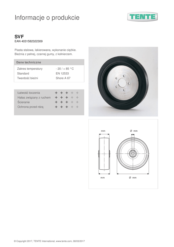 Informacje o produkcie SVF EAN 4031582322309 Piasta stalowa, lakierowana, wykonanie ciężkie. Bieżnia z pełnej, czarnej gumy, z kołnierzem. Dane techniczne Zakres temperatury - 20 / + 85 °C Twardość bieżni Shore A 67 Standard Łatwość toczenia Hałas związany z ruchem Ścieranie Ochrona przed rdzą EN 12533 + + + + + + + + + + + + + + + + + + + + © Copyright 2017, TENTE International, www.tente.com, 08/03/2017
