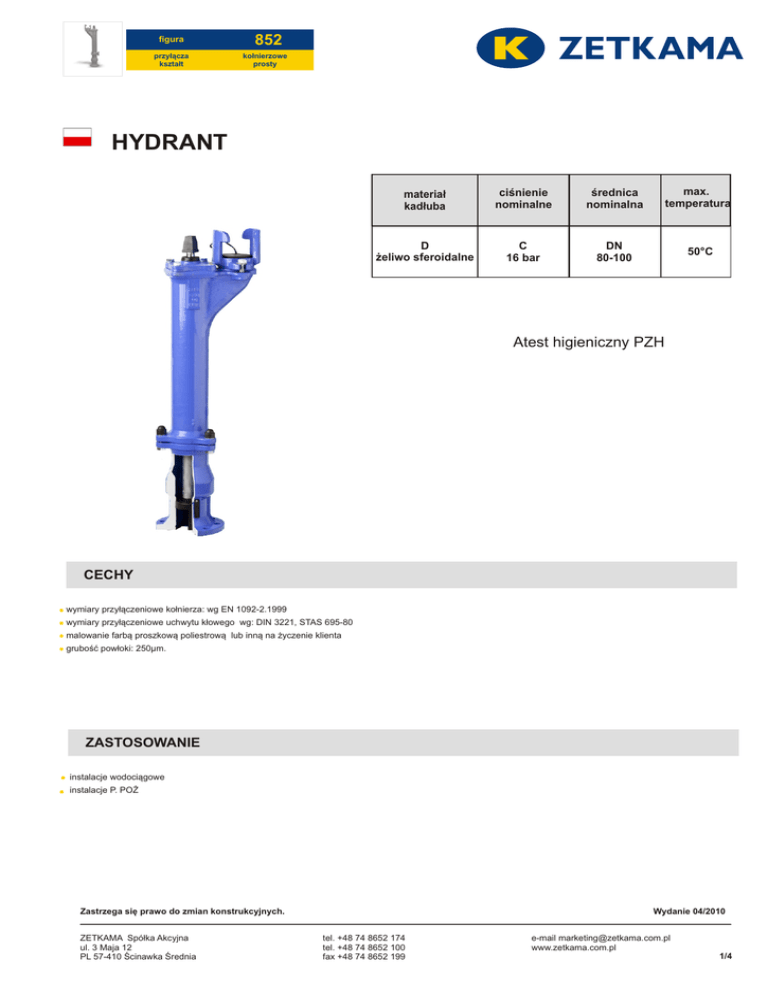 figura przyłącza kształt 852 kołnierzowe prosty HYDRANT materiał kadłuba ciśnienie nominalne średnica nominalna max. temperatura D żeliwo sferoidalne C 16 bar DN 80-100 50°C Atest higieniczny PZH CECHY wymiary przyłączeniowe kołnierza: wg EN 1092-2.1999 wymiary przyłączeniowe uchwytu kłowego wg: DIN 3221, STAS 695-80 malowanie farbą proszkową poliestrową lub inną na życzenie klienta grubość powłoki: 250µm. ZASTOSOWANIE instalacje wodociągowe instalacje P. POŻ Zastrzega się prawo do zmian konstrukcyjnych. ZETKAMA Spółka Akcyjna ul. 3 Maja 12 PL 57-410 Ścinawka Średnia Wydanie 04/2010 tel. +48 74 8652 174 tel. +48 74 8652 100 fax +48 74 8652 199 e-mail [email protected] www.zetkama.com.pl 1/4 852 figura przyłącza kształt kołnierzowe prosty MATERIAŁY DN 80 DN 100 5 4 15 4 17 10 14 16 8 6 5 11 3 13 17 15 9 11 10 14 16 13 3 6 1 8 9 1 12 16 17 16 12 2 7 18 7 17 D materiał kadłuba 1 kadłub EN- GJS-500-7 2 podstawa EN- GJS-500-7 3 dławnica EN- GJS-500-7 4 uchwyt kłowy EN- GJS-500-7 5 kaptur EN- GJS-500-7 6 oprawa nakrętki wrzeciona EN- GJS-500-7 7 grzybek ogumowany 8 wrzeciono monolityczne z gwintem trapezowym symetrycznym 9 nakrętka wrzeciona CuZn39Pb2 10 tuleja z gwintem CuZn39Pb2 11 kapturek ochronny 12 rura wewnętrzna 13 pierścienie ślizgowe 14 uszczelnienie wrzeciona NBR 15 pokrywka uchwytu kłowego NBR 16 uszczelnienie pomiędzy częściami hydrantu NBR 17 śruby 18 osłona odwodnienia EN- GJS-500-7/NBR X20Cr13 NBR stal węglowa ocynkowana CuZnPb2 stal cynkowa NBR 50°C max.temperatura Zastrzega się prawo do zmian konstrukcyjnych. ZETKAMA Spółka Akcyjna ul. 3 Maja 12 PL 57-410 Ścinawka Średnia 2 18 Wydanie 04/2010 tel. +48 74 8652 174 tel. +48 74 8652 100 fax +48 74 8652 199 e-mail [email protected] www.zetkama.com.pl 2/4 852 figura przyłącza kształt kołnierzowe prosty WYMIARY DN 80 DN DN 100 Głębokość zabudowy (wkop) HB Wysokość hydrantu H mm kg 80 750 500 24 80 1000 700 30,7 80 1250 950 35,7 80 1500 1200 40,2 100 1000 732 40 100 1250 982 45 100 1500 1232 55 Zastrzega się prawo do zmian konstrukcyjnych. ZETKAMA Spółka Akcyjna ul. 3 Maja 12 PL 57-410 Ścinawka Średnia Wydanie 04/2010 tel. +48 74 8652 174 tel. +48 74 8652 100 fax +48 74 8652 199 e-mail [email protected] www.zetkama.com.pl 3/4 852 figura przyłącza kształt kołnierzowe prosty WYKONANIA materiał kadłuba średnica nominalna DN D 80-100 C żeliwo sferoidalne EN-GJS-500-7 mm 16bar figura 852 ciśnienie nominalne PN wykonanie 05 Tmax 50 °C podziemny z automatycznym odwadnianiem głębokość zabudowy 750 mm podziemny z automatycznym odwadnianiem głębokość zabudowy 1000 mm podziemny z automatycznym odwadnianiem głębokość zabudowy 1250 mm podziemny z automatycznym odwadnianiem głębokość zabudowy 1500 mm podziemny z automatycznym odwadnianiem głębokość zabudowy 1000 mm z podwójnym zamknięciem podziemny z automatycznym odwadnianiem głębokość zabudowy 1250 mm z podwójnym zamknięciem podziemny z automatycznym odwadnianiem głębokość zabudowy 1500 mm z podwójnym zamknięciem 15 Tmax 50 °C 25 Tmax 50 °C 35 Tmax 50 °C 12 Tmax 50 °C 22 Tmax 50 °C 32 Tmax 50 °C ZAMAWIANIE Uprasza się o zamawianie produktu wg indeksu figura materiał kadłuba średnica nominalna DN ciśnienie nominalne PN wykonanie 852 D 080 C 05 852 PRZYKŁAD ZAMÓWIENIA 080 C 05 852 hydrant, przyłącze kołnierzowe, kształt prosty D żeliwo sferoidalne EN-GJS-500-7 080 średnica nominalna DN80 C ciśnienie nominalne PN16 podziemny z automatycznym odwadnianiem głębokość zabudowy 750 mm Zastrzega się prawo do zmian konstrukcyjnych. ZETKAMA Spółka Akcyjna ul. 3 Maja 12 PL 57-410 Ścinawka Średnia D 05 Wydanie 04/2010 tel. +48 74 8652 174 tel. +48 74 8652 100 fax +48 74 8652 199 e-mail [email protected] www.zetkama.com.pl 4/4