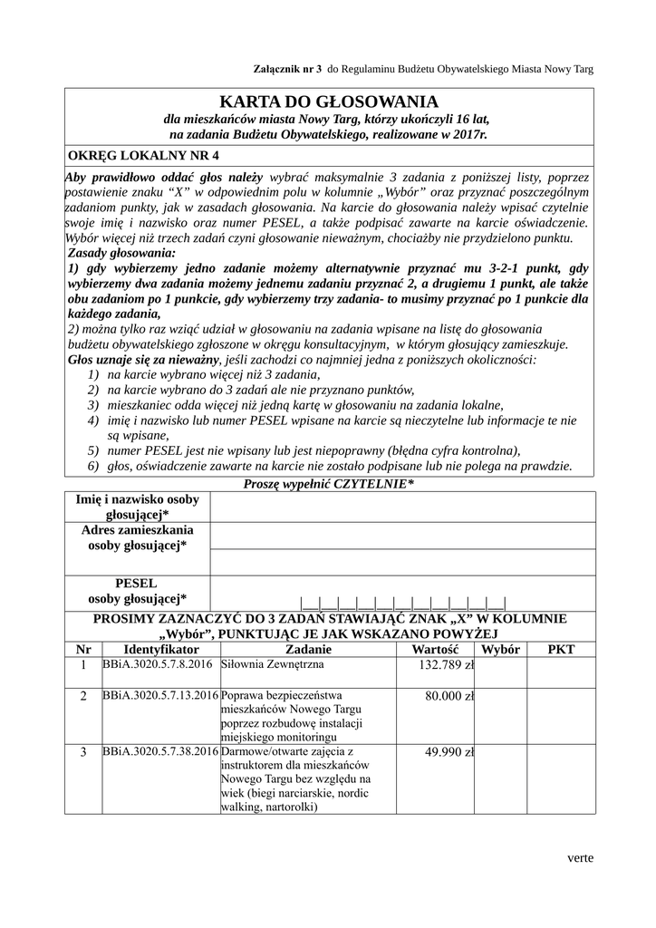 Załącznik nr 3 do Regulaminu Budżetu Obywatelskiego Miasta Nowy Targ KARTA DO GŁOSOWANIA dla mieszkańców miasta Nowy Targ, którzy ukończyli 16 lat, na zadania Budżetu Obywatelskiego, realizowane w 2017r. OKRĘG LOKALNY NR 4 Aby prawidłowo oddać głos należy wybrać maksymalnie 3 zadania z poniższej listy, poprzez postawienie znaku “X” w odpowiednim polu w kolumnie „Wybór” oraz przyznać poszczególnym zadaniom punkty, jak w zasadach głosowania. Na karcie do głosowania należy wpisać czytelnie swoje imię i nazwisko oraz numer PESEL, a także podpisać zawarte na karcie oświadczenie. Wybór więcej niż trzech zadań czyni głosowanie nieważnym, chociażby nie przydzielono punktu. Zasady głosowania: 1) gdy wybierzemy jedno zadanie możemy alternatywnie przyznać mu 3-2-1 punkt, gdy wybierzemy dwa zadania możemy jednemu zadaniu przyznać 2, a drugiemu 1 punkt, ale także obu zadaniom po 1 punkcie, gdy wybierzemy trzy zadania- to musimy przyznać po 1 punkcie dla każdego zadania, 2) można tylko raz wziąć udział w głosowaniu na zadania wpisane na listę do głosowania budżetu obywatelskiego zgłoszone w okręgu konsultacyjnym, w którym głosujący zamieszkuje. Głos uznaje się za nieważny, jeśli zachodzi co najmniej jedna z poniższych okoliczności: 1) na karcie wybrano więcej niż 3 zadania, 2) na karcie wybrano do 3 zadań ale nie przyznano punktów, 3) mieszkaniec odda więcej niż jedną kartę w głosowaniu na zadania lokalne, 4) imię i nazwisko lub numer PESEL wpisane na karcie są nieczytelne lub informacje te nie są wpisane, 5) numer PESEL jest nie wpisany lub jest niepoprawny (błędna cyfra kontrolna), 6) głos, oświadczenie zawarte na karcie nie zostało podpisane lub nie polega na prawdzie. Proszę wypełnić CZYTELNIE* Imię i nazwisko osoby głosującej* Adres zamieszkania osoby głosującej* PESEL osoby głosującej* |__|__|__|__|__|__|__|__|__|__|__| PROSIMY ZAZNACZYĆ DO 3 ZADAŃ STAWIAJĄĆ ZNAK „X” W KOLUMNIE „Wybór”, PUNKTUJĄC JE JAK WSKAZANO POWYŻEJ Nr Identyfikator Zadanie Wartość Wybór PKT 1 BBiA.3020.5.7.8.2016 Siłownia Zewnętrzna 132.789 zł 2 3 BBiA.3020.5.7.13.2016 Poprawa bezpieczeństwa mieszkańców Nowego Targu poprzez rozbudowę instalacji miejskiego monitoringu BBiA.3020.5.7.38.2016 Darmowe/otwarte zajęcia z instruktorem dla mieszkańców Nowego Targu bez względu na wiek (biegi narciarskie, nordic walking, nartorolki) 80.000 zł 49.990 zł verte 4 BBiA.3020.5.7.39.2016 GOPR bezpieczeństwo w górach. Cykl prelekcji dla dzieci i młodzieży oraz zakup sprzętu do ratownictwa 49.900 zł W przypadku, gdy projekt okaże się zwycięski jego realizacja przebiegać będzie zgodnie z obowiązującymi przepisami prawa w tym: ustawy Prawo zamówień publicznych oraz z wewnętrznymi procedurami Urzędu Miasta. OŚWIADCZENIE * 1) Oświadczam, że jestem mieszkańcem/mieszkanką miasta Nowy Targ, który/a ukończył/a w dniu głosowania 16 lat i zamieszkuje w okręgu właściwym dla aktu głosowania. 2) Oświadczam, iż jednokrotnie oddałem/am głos w trakcie niniejszego głosowania. 3) Wyrażam zgodę na przetwarzanie moich danych osobowych dla potrzeb niezbędnych do wdrożenia Budżetu Obywatelskiego na 2017 rok, zgodnie z ustawą z dnia 29 sierpnia 1997r. o ochronie danych osobowych (tekst jedn. Dz. U. z 2016 r. poz. 922 z późn. zm.) Wiem, że podanie danych jest dobrowolne oraz że mam prawo kontroli przetwarzania danych, które mnie dotyczą, prawo dostępu do treści swoich danych i ich poprawiania. Administratorem danych osobowych jest wyłącznie Burmistrz Miasta Nowy Targ. Data …………………………… .................................................................................. czytelny podpis * * - Wypełnienie lub oświadczenie obowiązkowe.