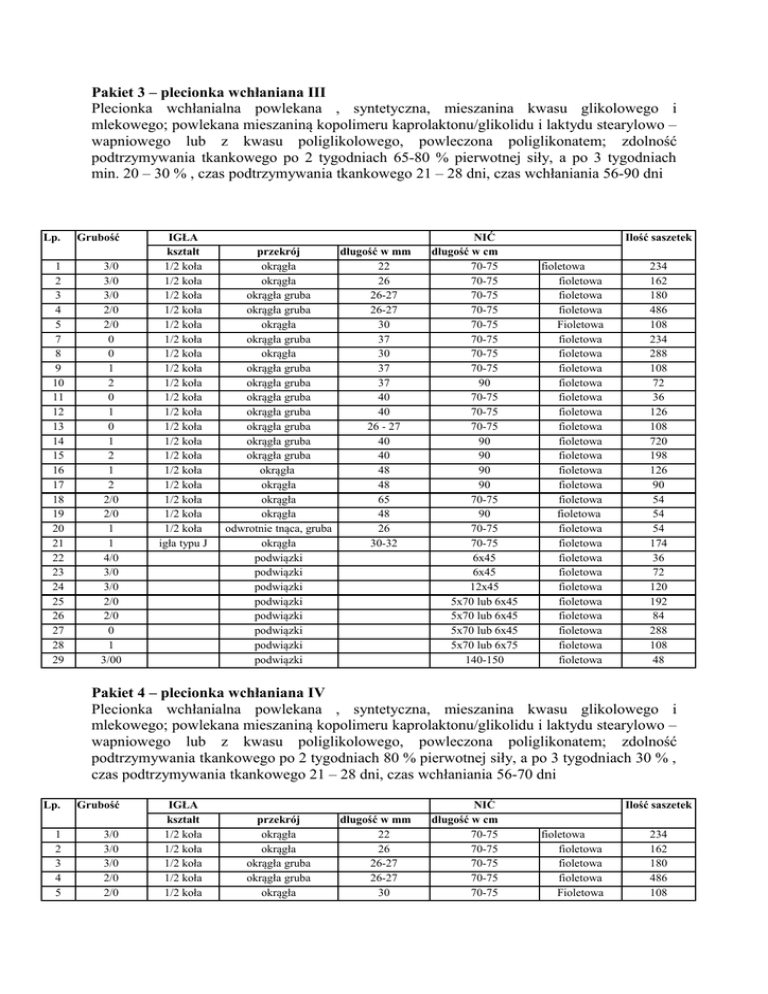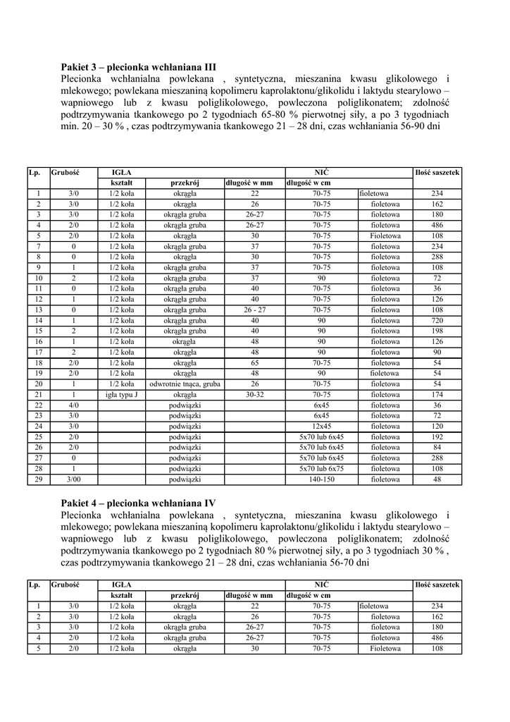 Pakiet 3 – plecionka wchłaniana III Plecionka wchłanialna powlekana , syntetyczna, mieszanina kwasu glikolowego i mlekowego; powlekana mieszaniną kopolimeru kaprolaktonu/glikolidu i laktydu stearylowo – wapniowego lub z kwasu poliglikolowego, powleczona poliglikonatem; zdolność podtrzymywania tkankowego po 2 tygodniach 65-80 % pierwotnej siły, a po 3 tygodniach min. 20 – 30 % , czas podtrzymywania tkankowego 21 – 28 dni, czas wchłaniania 56-90 dni Lp. 1 2 3 4 5 7 8 9 10 11 12 13 14 15 16 17 18 19 20 21 22 23 24 25 26 27 28 29 Grubość 3/0 3/0 3/0 2/0 2/0 0 0 1 2 0 1 0 1 2 1 2 2/0 2/0 1 1 4/0 3/0 3/0 2/0 2/0 0 1 3/00 IGŁA kształt 1/2 koła 1/2 koła 1/2 koła 1/2 koła 1/2 koła 1/2 koła 1/2 koła 1/2 koła 1/2 koła 1/2 koła 1/2 koła 1/2 koła 1/2 koła 1/2 koła 1/2 koła 1/2 koła 1/2 koła 1/2 koła 1/2 koła igła typu J przekrój długość w mm okrągła 22 okrągła 26 okrągła gruba 26-27 okrągła gruba 26-27 okrągła 30 okrągła gruba 37 okrągła 30 okrągła gruba 37 okrągła gruba 37 okrągła gruba 40 okrągła gruba 40 okrągła gruba 26 - 27 okrągła gruba 40 okrągła gruba 40 okrągła 48 okrągła 48 okrągła 65 okrągła 48 odwrotnie tnąca, gruba 26 okrągła 30-32 podwiązki podwiązki podwiązki podwiązki podwiązki podwiązki podwiązki podwiązki NIĆ długość w cm 70-75 70-75 70-75 70-75 70-75 70-75 70-75 70-75 90 70-75 70-75 70-75 90 90 90 90 70-75 90 70-75 70-75 6x45 6x45 12x45 5x70 lub 6x45 5x70 lub 6x45 5x70 lub 6x45 5x70 lub 6x75 140-150 Ilość saszetek fioletowa fioletowa fioletowa fioletowa Fioletowa fioletowa fioletowa fioletowa fioletowa fioletowa fioletowa fioletowa fioletowa fioletowa fioletowa fioletowa fioletowa fioletowa fioletowa fioletowa fioletowa fioletowa fioletowa fioletowa fioletowa fioletowa fioletowa fioletowa 234 162 180 486 108 234 288 108 72 36 126 108 720 198 126 90 54 54 54 174 36 72 120 192 84 288 108 48 Pakiet 4 – plecionka wchłaniana IV Plecionka wchłanialna powlekana , syntetyczna, mieszanina kwasu glikolowego i mlekowego; powlekana mieszaniną kopolimeru kaprolaktonu/glikolidu i laktydu stearylowo – wapniowego lub z kwasu poliglikolowego, powleczona poliglikonatem; zdolność podtrzymywania tkankowego po 2 tygodniach 80 % pierwotnej siły, a po 3 tygodniach 30 % , czas podtrzymywania tkankowego 21 – 28 dni, czas wchłaniania 56-70 dni Lp. 1 2 3 4 5 Grubość 3/0 3/0 3/0 2/0 2/0 IGŁA kształt 1/2 koła 1/2 koła 1/2 koła 1/2 koła 1/2 koła przekrój okrągła okrągła okrągła gruba okrągła gruba okrągła długość w mm 22 26 26-27 26-27 30 NIĆ długość w cm 70-75 70-75 70-75 70-75 70-75 Ilość saszetek fioletowa fioletowa fioletowa fioletowa Fioletowa 234 162 180 486 108 7 8 9 10 11 12 13 14 15 16 17 18 19 20 21 22 23 24 25 26 27 28 29 0 0 1 2 0 1 0 1 2 1 2 2/0 2/0 1 1 4/0 3/0 3/0 2/0 2/0 0 1 3/00 1/2 koła 1/2 koła 1/2 koła 1/2 koła 1/2 koła 1/2 koła 1/2 koła 1/2 koła 1/2 koła 1/2 koła 1/2 koła 1/2 koła 1/2 koła 1/2 koła igła typu J okrągła gruba okrągła okrągła gruba okrągła gruba okrągła gruba okrągła gruba okrągła gruba okrągła gruba okrągła gruba okrągła okrągła okrągła okrągła odwrotnie tnąca, gruba okrągła podwiązki podwiązki podwiązki podwiązki podwiązki podwiązki podwiązki podwiązki 37 30 37 37 40 40 26 - 27 40 40 48 48 65 48 26 30-32 70-75 70-75 70-75 90 70-75 70-75 70-75 90 90 90 90 70-75 90 70-75 70-75 6x45 6x45 12x45 5x70 lub 6x45 5x70 lub 6x45 5x70 lub 6x45 5x70 lub 6x75 140-150 fioletowa fioletowa fioletowa fioletowa fioletowa fioletowa fioletowa fioletowa fioletowa fioletowa fioletowa bezbarwna fioletowa fioletowa fioletowa fioletowa fioletowa fioletowa fioletowa fioletowa fioletowa fioletowa fioletowa 234 288 108 72 36 126 108 720 198 126 90 54 54 54 174 36 72 120 192 84 288 108 48 Pakiet 5 – plecionka wchłanialna V Plecionka wchłanialna, powlekana, syntetyczna, mieszanina kwasu glikolowego i mlekowego; powlekana mieszaniną kopolimeru kaprolaktonu/glikolidu i laktydu stearylowo – wapniowego lub z kwasu poliglikolowego, powleczona poliglikonatem; zdolność podtrzymywania tkankowego po 2 tygodniach 65-80 % pierwotnej siły, a po 3 tygodniach min 20 – 30 % , czas podtrzymywania tkankowego 21 – 28 dni, czas wchłaniania 56 – 90 dni . Lp. Grubość 1 2/0 2 0 kształt Petla endoskopowa Petla endoskopowa IGŁA przekrój Dł w mm Pętla podwiązkowa z aplika torem Pętla podwiązkowa z aplika torem NIĆ Ilość saszetek Dł. w cm 52 fioletowa 30 52 fioletowa 24 Pakiet 6 – monofilament wchłanialny Monofilament wchłanialny, syntetyczny , glycomer, czas podtrzymywania tkankowego 21 – 28 dni, zdolność podtrzymywania tkankowego po 2 tygodniach min. 75 % i min. 40 % po 3 tygodniach pierwotnej siły, czas całkowitego wchłaniania 90 – 100 dni. Lp. 1 2 3 Grubość 3/0 4/0 2/0 kształt ½ koła ½ koła ½ koła IGŁA przekrój okrągła okrągła okrągła NIĆ Dł w mm 22 22 48 Pakiet 8 – monofilament wchłanialny III Dł. w cm 70-75 70-75 90 Ilość saszetek fioletowa fioletowa fioletowa 324 288 108 Monofilament wchłanialny, syntetyczny, poliglikonat lub Poli-p-dioksanon, czas podtrzymywania tkankowego min. 42 dni, zdolność podtrzymywania tkankowego po 2 tygodniach min. 75 % pierwotnej siły, po 3 tygodniach 65 % a po 4 tygodniach 50 % pierwotnej siły, czas wchłaniania 180 – 210 dni. Lp. 1 Grubość 2/0 kształt prosta IGŁA przekrój Odwrotnie tnąca NIĆ Dł w mm 2 x 250 Dł. w cm 75 Ilość saszetek 36