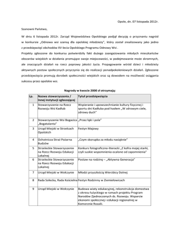 Opole, dn. 07 listopada 2012r. Szanowni Państwo, W dniu 6 listopada 2012r. Zarząd Województwa Opolskiego podjął decyzję o przyznaniu nagród w konkursie „Odnowa wsi szansą dla opolskiej młodzieży”, który został zrealizowany jako jedno z przedsięwzięć obchodów XV-lecia Opolskiego Programu Odnowy Wsi . Projekty zgłoszone do konkursu potwierdziły fakt dużego zaangażowania młodych mieszkańców obszarów wiejskich w działania promujące swoje miejscowości, w podejmowanie może skromnych, ale znaczących działań na rzecz poprawy jakości życia. Propagowanie wśród dzieci i młodzieży aktywnych postaw społecznych przyczynia się do realizacji ponadpokoleniowych działań. Zgłoszone przedsięwzięcia promują dorobek społeczności wiejskich oraz są dowodem na możliwość osiągania sukcesu przez opolskie wsi. Nagrody w kwocie 2000 zł otrzymają: Lp. Nazwa stowarzyszenia / Tytuł przedsięwzięcia Innej instytucji zgłaszającej 1 Stowarzyszenie na Rzecz Rozwoju Wsi Kadłub 2 Stowarzyszenie Wsi Bogacica „Przez łąki i pola” „Bogatalanta” 3 Urząd Miejski w Strzelcach Opolskich Festyn Majowy 4 Ochotnicza Straż Pożarna Budzów „Czym skorupka za młodu nasiąknie” 5 Strzeleckie Stowarzyszenie na Rzecz Rozwoju Edukacji Lokalnej Strzeleckie Stowarzyszenie na Rzecz Rozwoju Edukacji Lokalnej Konkurs fotograficzno-literacki „Z kofra mojej starki, czyli suskie wspomnienia ocalone od zapomnienia” 7 Urząd Miejski w Wołczynie Młodzi przyszłością Wierzbicy Dolnej 8 Rada Sołecka, Rada Kościelna Festyn Rodzinny w Ziemiełowicach 9 Urząd Miejski w Wołczynie 6 Wspieranie i upowszechnianie kultury fizycznej i sportu dni Kadłuba pod hasłem „W zdrowym ciele, zdrowy duch” Postaw na rodzinę – „Aktywna Generacja” Budowa wiaty edukacyjnej, rekonstrukcja domostwa z okresu łużyckiego w ramach projektu Program Narodów Zjednoczonych ds. Rozwoju. Wsparcie ekonomi społecznej i edukacji regionalnej w Komorznie Rozalii. 10 Stowarzyszenie Rozwoju Wsi Na Miodowej Drodze Maciejów „Miodowa Kraina” 11 Stowarzyszenie Przyjaciół Kantorowic Zagospodarowanie działki nr 176 położonej w Kantorowicach z przeznaczeniem na plac zabaw dla dzieci i miejsca spotkań dla mieszkańców 12 Stowarzyszenie Odnowy Wsi Zielony zakątek pod starą jabłonią i Ochrony Dziedzictwa Kulturowego Rozmierz 13 Gmina Krapkowice „Letnie Party w Rogowie Opolskim – zabawa w klimatach hawajskich” 14 Gminny Ośrodek Kultury w Lubszy „Jak dbamy tak mamy-nasze zielone Eldorado” 15 Stowarzyszenie Kalejdoskop Gminny Konkurs Talentów „Gwiazdy są nie tylko w telewizji – My też mamy talent” 16 ZHP Hufiec Niemodlin 17 Stowarzyszenie na Rzecz Rozwoju Wsi Winów Rajd „Q-Horyzontom. Magia wsi” Winowskie Winnice 18 Stowarzyszenie „Tarnowiec Wystawa fotograficzna pt.: ”Sami Swoi o sobie” wczoraj, dzisiaj i jutro” 19 Stowarzyszenie Wsi Bogacica „Czy z zachodu czy ze wschodu byle razem i do „Bogatalanta” przodu” – część projektu „Żywiołowe inspiracje na wakacje” 20 Stowarzyszenie Odnowy Wsi „Budowa boiska do piłki plażowej” Nowe Siołkowice Gratulujemy wszystkim laureatom. Jednocześnie informujemy, iż w najbliższym czasie na adres korespondencyjny organizacji zostaną przesłane dyplomy uznania, zaś na konta bankowe - środki pieniężne, które powinny zostać przeznaczone na inicjatywy promujące odnowę wsi w sołectwie. Konkurs jest współfinansowany ze środków Unii Europejskiej, Europejskiego Funduszu Rolnego na rzecz Rozwoju Obszarów Wiejskich w ramach Schematu III Pomocy Technicznej Programu Rozwoju Obszarów Wiejskich na lata 2007-2013. Instytucja Zarządzająca PROW na lata 2007-2013: Minister Rolnictwa i Rozwoju Wsi. Konkurs stanowi realizację Planu działania Sekretariatu Regionalnego Krajowej Sieci Obszarów Wiejskich Województwa Opolskiego na lata 2012-2013. Antoni Konopka Przewodniczący Komisji Konkursowej, Członek Opolskiego Zarządu Województwa