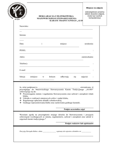 Miejsce na zdjęcie (obowiązkowo prosimy wkleić dowolne zdjęcie, może być wydruk komputerowy) DEKLARACJA CZŁONKOWSKA MAZOWIECKIEGO STOWARZYSZENIA KARATE TRADYCYJNEGO „AI-DO” Nazwisko: ______________________________________________________________________ __ Imiona: ______________________________________________________________________ ____ Data i miejsce _________________________________________________________ urodzenia: PESEL ____________________________________________________________________ : Adres zamieszkania: _____________________________________________________________ Telefon/y ___________________________________________________________________ : E-mail ____________________________________________________________________ : Sekcja (miejsce w którym _________________________________ : odbywają się zajęcia) Ja, niżej podpisany\a ________________________________________ oświadczam, iż przystępując do Mazowieckiego Stowarzyszenia Karate Tradycyjnego „AI-DO” zobowiązuję się do: Przestrzegania statutu i regulaminu Stowarzyszenia oraz uchwał i zarządzeń władz klubu, Udziału w realizacji statutowych celów i zadań klubu, Regularnego opłacania składki członkowskiej, Godnego reprezentowania klubu oraz zachowania godnego karateki. ____________________________________ Podpis uczestnika zajęć Wyrażam zgodę na przystąpienie mojego dziecka do Stowarzyszenia i przyjęcia zobowiązań wynikających ze statutu, regulaminów, uchwał i zarządzeń oraz udział w zajęciach karate tradycyjnego.* ____________________________________ Podpis rodziców lub opiekunów Decyzją Zarządu klubu z dnia ______________ wpisany do rejestru członków nr __________ ____________________________________ za zarząd Decyzją Zarządu klubu z dnia ______________________ skreślony z rejestru członków. ____________________________________ za zarząd * Dotyczy osób niepełnoletnich WAŻNE: Do deklaracji należy dołączyć podpisany regulamin, badania lekarskie i zdjęcie.