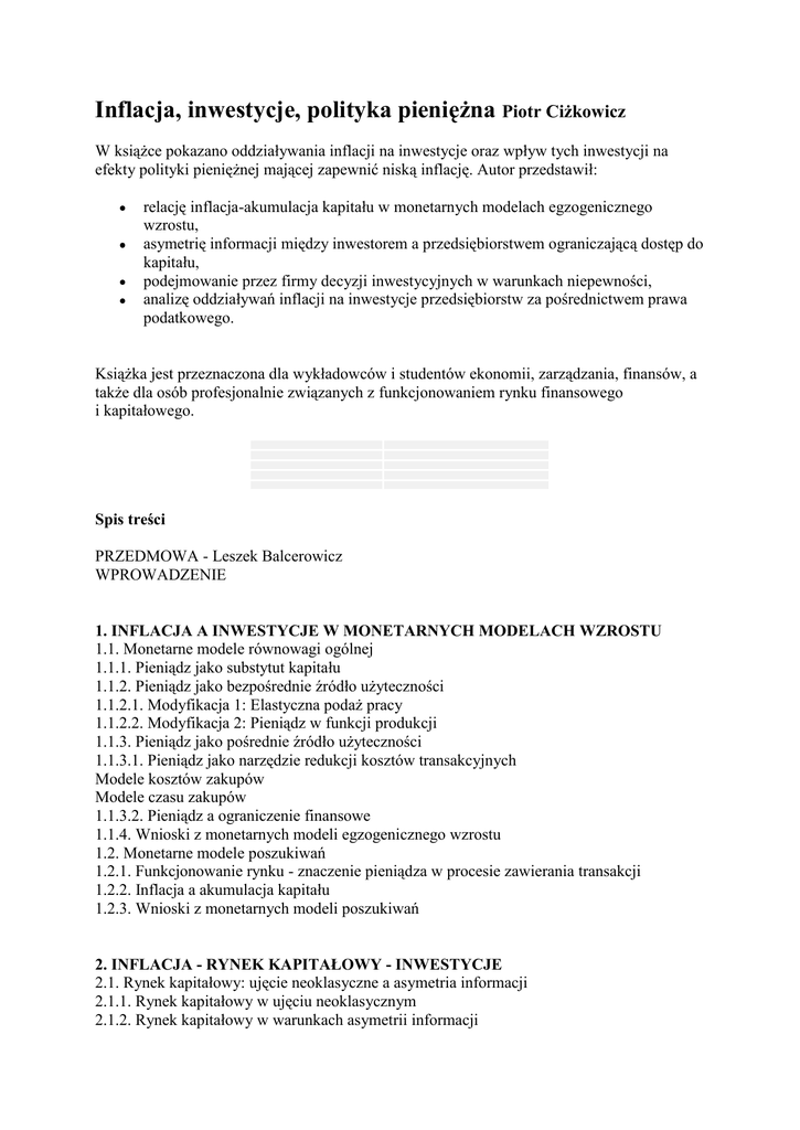 Inflacja, inwestycje, polityka pieniężna Piotr Ciżkowicz