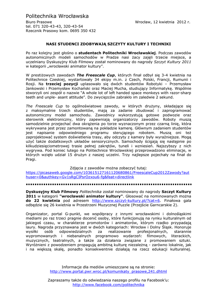 Politechnika Wrocławska Biuro Prasowe tel. 071 320-43-43, 320-43-54 Rzecznik Prasowy kom. 0695 350 432 Wrocław, 12 kwietnia 2012 r. NASI STUDENCI ZDOBYWAJĄ SZCZYTY KULTURY I TECHNIKI Po raz kolejny jest głośno o studentach Politechniki Wrocławskiej. Podczas zawodów autonomicznych modeli samochodów w Pradze nasi żacy zajęli trzecie miejsce, a uczelniany Dyskusyjny Klub Filmowy został nominowany do nagrody Szczyt Kultury 2011 w kategorii „wrocławski animator kultury”. W prestiżowych zawodach The Freescale Cup, których finał odbył się 3-4 kwietnia na Politechnice Czeskiej, wystartowały 34 ekipy m.in. z Czech, Polski, Francji, Rumunii i Rosji. Na trzeciej pozycji uplasowało się dwóch studentów Robotyki – Przemysław Jankowski i Przemysław Kochański oraz Maciej Mucha, studiujący Informatykę. Wspólnie stworzyli oni zespół o nazwie “A whole lot of left handed space monkeys with razor-sharp teeth and unple- asant attitude”. Do zwycięzców zabrakło im zaledwie 2 sekund. The Freescale Cup to ogólnoświatowe zawody, w których drużyny, składające się z maksymalnie trzech studentów, mają za zadanie zbudować i zaprogramować autonomiczny model samochodu. Zawodnicy wykorzystują gotowe podwozie oraz sterownik elektroniczny, który zapewniają organizatorzy zawodów. Roboty muszą samodzielnie przejechać dwa okrążenia po torze wyznaczonym przez czarną linię, która wykrywana jest przez zamontowaną na pokładzie kamerę. Głównym zadaniem studentów jest napisanie odpowiedniego programu sterującego robotem. Muszą oni też zaprojektować system doświetlenia trasy, aby odczyty z kamery były wyraźniejsze. Mogą użyć także dodatkowych układów sensorycznych. Samochody ścigają się następnie po kilkudziesięciometrowej trasie pełnej zakrętów, tuneli i wzniesień. Najszybszy z nich wygrywa. Pod koniec lutego na Politechnice Wrocławskiej przeprowadzono eliminacje, w których wzięło udział 15 drużyn z naszej uczelni. Trzy najlepsze pojechały na finał do Pragi. Zdjęcia z zawodów można zobaczyć tutaj: https://picasaweb.google.com/103615127161120680861/FreescaleCup2012Zawody?aut huser=0&authkey=Gv1sRgCIPsrOzxou6-fg&feat=directlink Dyskusyjny Klub Filmowy Politechnika został nominowany do nagrody Szczyt Kultury 2011 w kategorii "wrocławski animator kultury". Głosować na nominowanych można do 22 kwietnia pod adresem http://www.szczyt-kultury.pl/?cat=6. Finałowa gala odbędzie się 26 kwietnia w Przestrzeni Muzycznej Puzzle (Przejście Garncarskie 2). Organizator, portal G-punkt, we współpracy z innymi wrocławskimi i dolnośląskimi mediami po raz trzeci pragnie docenić osoby, które funkcjonują na rynku kulturalnym od jakiegoś czasu, w charakterze promotorów i animatorów, którym rzadko przypadają laury. Nagroda przyznawana jest w dwóch kategoriach: Wrocław i Dolny Śląsk. Honoruje wysiłki osób odpowiedzialnych za realizowanie profesjonalnych, starannie wypromowanych i niebanalnych programowo wydarzeń: filmowych, literackich, muzycznych, teatralnych, a także za działania związane z promowaniem sztuki. Wyróżnieni z powodzeniem propagują ambitną kulturę niezależną - zarówno lokalnie, jak i na większą skalę, ponadto konsekwentnie działają na rzecz edukacji kulturalnej. Informacje dla mediów umieszczane są na stronie: http://www.portal.pwr.wroc.pl/komunikaty_prasowe,241.dhtml Zapraszamy także do odwiedzania naszego profilu na Facebook’u: http://www.facebook.com/politechnika