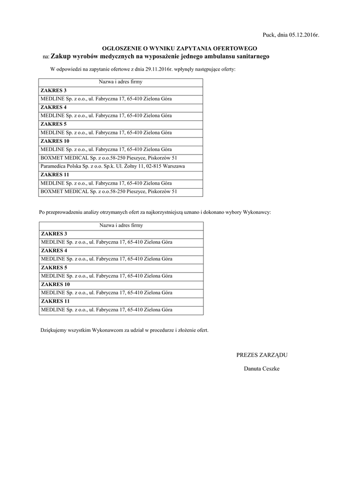 Puck, dnia 05.12.2016r. OGŁOSZENIE O WYNIKU ZAPYTANIA OFERTOWEGO na: Zakup wyrobów medycznych na wyposażenie jednego ambulansu sanitarnego W odpowiedzi na zapytanie ofertowe z dnia 29.11.2016r. wpłynęły następujące oferty: Nazwa i adres firmy ZAKRES 3 MEDLINE Sp. z o.o., ul. Fabryczna 17, 65-410 Zielona Góra ZAKRES 4 MEDLINE Sp. z o.o., ul. Fabryczna 17, 65-410 Zielona Góra ZAKRES 5 MEDLINE Sp. z o.o., ul. Fabryczna 17, 65-410 Zielona Góra ZAKRES 10 MEDLINE Sp. z o.o., ul. Fabryczna 17, 65-410 Zielona Góra BOXMET MEDICAL Sp. z o.o.58-250 Pieszyce, Piskorzów 51 Paramedica Polska Sp. z o.o. Sp.k. Ul. Żołny 11, 02-815 Warszawa ZAKRES 11 MEDLINE Sp. z o.o., ul. Fabryczna 17, 65-410 Zielona Góra BOXMET MEDICAL Sp. z o.o.58-250 Pieszyce, Piskorzów 51 Po przeprowadzeniu analizy otrzymanych ofert za najkorzystniejszą uznano i dokonano wybory Wykonawcy: Nazwa i adres firmy ZAKRES 3 MEDLINE Sp. z o.o., ul. Fabryczna 17, 65-410 Zielona Góra ZAKRES 4 MEDLINE Sp. z o.o., ul. Fabryczna 17, 65-410 Zielona Góra ZAKRES 5 MEDLINE Sp. z o.o., ul. Fabryczna 17, 65-410 Zielona Góra ZAKRES 10 MEDLINE Sp. z o.o., ul. Fabryczna 17, 65-410 Zielona Góra ZAKRES 11 MEDLINE Sp. z o.o., ul. Fabryczna 17, 65-410 Zielona Góra Dziękujemy wszystkim Wykonawcom za udział w procedurze i złożenie ofert. PREZES ZARZĄDU Danuta Ceszke