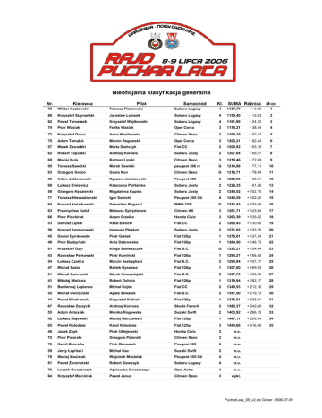 Nieoficjalna klasyfikacja generalna Nr. Kierowca Pilot Samochód Kl. SUMA Różnica M-ce 79 Wiktor Kozłowski Tomasz Piotrowski Subaru Legacy 4 1137,77 + 0,00 1 80 Krzysztof Szymański Jarosław Latosek Subaru Legacy 4 1150,40 + 12,63 2 82 Paweł Tomaszek Krzysztof Wojtkowski Subaru Legacy 4 1161,99 + 24,22 3 74 Piotr Wasiak Feliks Wasiak Opel Corsa 3 1176,21 + 38,44 4 73 Krzysztof Oracz Anna Wasilewska Citroen Saxo 3 1190,19 + 52,42 5 75 Adam Tomalak Marcin Rogowski Opel Corsa 3 1200,21 + 62,44 6 57 Marek Zawadzki Marta Stańczyk Fiat CC 2 1200,92 + 63,15 7 62 Robert Topolski Andrzej Kornela Subaru Justy 2 1207,04 + 69,27 8 69 Maciej Kula Bartosz Lipski Citroen Saxo 3 1210,46 + 72,69 9 95 Tomasz Sawicki Marek Sawicki peugeot 206 rc G 1214,88 + 77,11 10 93 Grzegorz Grono Gosia Kun Citroen Saxo G 1216,71 + 78,94 11 68 Adam Jabłonowski Ryszard Janiszewski Peugeot 206 3 1228,08 + 90,31 12 60 Łukasz Kiniewicz Katarzyna Politalska Subaru Justy 2 1229,35 + 91,58 13 58 Grzegorz Kędzierski Magdalena Kupiec Subaru Justy 2 1240,52 + 102,75 14 77 Tomasz Niewiadomski Igor Sawicki Peugeot 205 Gti 4 1240,59 + 102,82 15 94 Konrad Kwiatkowski Sebastian Bogacki BMW 325i G 1243,45 + 105,68 16 63 Przemysław Sułek Mateusz Spirydonow Citroen AX 3 1261,71 + 123,94 17 66 Piotr Pinchinat Adam Grzelka Honda Civic 3 1263,39 + 125,62 18 53 Dariusz Lipski Rafał Bielicki Fiat CC 2 1268,43 + 130,66 19 56 Konrad Komorowski Ireneusz Pleskot Subaru Justy 2 1271,02 + 133,25 20 45 Daniel Dymkowski Piotr Grelak Fiat 126p 1 1275,01 + 137,24 21 46 Piotr Budzyński Ania Dąbrowska Fiat 126p 1 1284,50 + 146,73 22 91 Krzysztof Dzyr Kinga Sobieszczuk Fiat S.C. G 1292,21 + 154,44 23 43 Radosław Perkowski Piotr Kamiński Fiat 126p 1 1294,27 + 156,50 24 54 Łukasz Czańka Marcin Jastrzębski Fiat S.C. 2 1294,94 + 157,17 25 47 Michał Szala Bartek Ryszawa Fiat 126p 1 1307,60 + 169,83 26 61 Michał Czarnocki Marek Nowowiejski Fiat S.C. 2 1307,73 + 169,96 27 41 Mikołaj Mielcarz Robert Ochnio Fiat 126p 1 1319,94 + 182,17 28 51 Bartłomiej Lepianka Michał Kojda Fiat CC 2 1349,93 + 212,16 29 52 Michał Owczarzak Agata Skwarek Fiat S.C. 2 1357,50 + 219,73 30 44 Paweł Klimkowski Krzysztof Kubicki Fiat 126p 1 1375,81 + 238,04 31 67 Radosław Zarzycki Andrzej Korkosz Skoda Favorit 2 1380,37 + 242,60 32 55 Adam Antosiak Monika Rogowska Suzuki Swift 2 1403,92 + 266,15 33 42 Łukasz Majewski Maciej Marczewski Fiat 126p 1 1447,11 + 309,34 34 65 Paweł Kołodziej Karol Kołodziej Fiat 125p 3 1454,66 + 316,89 35 48 Jacek Znyk Piotr Uklejewski Honda Civic 3 n.s. 72 Piotr Potorski Grzegorz Potorski Citroen Saxo 3 n.u. 70 Kamil Zaremba Piotr Banaszek Peugeot 205 3 n.u. 59 Jerzy Łapiński Michał Gac Suzuki Swift 2 n.u. 78 Maciej Musielak Wojciech Musielak Peugeot 205 Gti 4 n.u. 81 Paweł deromiński Robert Siewczyk Subaru Legacy 4 n.u. 76 Leszek Owczarczyk Agnieszka Owczarczyk Opel Astra 4 n.u. 64 Krzysztof Marciniak Paweł Janus Citroen Saxo 3 wykl. PucharLata_06_v2.xls Gener. 2006>07>09