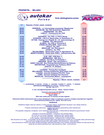 PRZEMYŚL - MILANO linia obsługiwana przez 5,7 Wyjazdy z Polski: piątek, niedziela 08:00 08:45 09:05 09:30 14:30 14:40 15:00 15:15 15:30 16:15 16:45 18:00 19:15 20:00 20:45 04:00 04:30 05:15 05:35 06:15 07:00 07:30 08:15 10:00 10:30 11:00 12:00 PRZEMYŚL - ul. Czarneckiego przystanek 'Wagabunda' JAROSŁAW - Dw. PKP przystanek 'Wgabunda' PRZEWORSK - Dw. PKS ŁAŃCUT - Parking przy Dw. PKS ------------------------------------KATOWICE - Dw. PKS, ul. Piotra Skargi CHORZÓW - LDS S.A. Stacja paliw, ul. Racławicka 32 BYTOM - Parking C.H. 'Plejada' Al. J.N. Jeziorańskiego 25 ZABRZE - Plac Warszawski GLIWICE - Dw. PKS ul. Pionierów 8 STRZELCE OPOLSKIE - Hotel Leśny OPOLE - Dw. PKS WROCŁAW - Dw. PKS peron 5 LEGNICA - Dw. PKS BOLESŁAWIEC - Stacja paliw Lotos ul. Zgorzelecka 16 JĘDRZYCHOWICE - Stacja paliw SHELL, Jędrzychowice 98b ------------------------------------ULM - HBF / ZOB Stan. 5 MEMMINGEN - HBF Stan. 1 LINDAU - Karl Baver Pl./Parkplatz 3 BREGENZ - Busbf. / Hbf. stanowisko C SANKT GALLEN - Bus Parking/ Bahnhofstrasse bei Rathaus WINTERTHUR - Przystanek przy Parkhaus ARCH ZURYCH - Pl. Sihlquai ------------------------------------LUCERNA - Parking Bus Inselipark BELLINZONA - Parking autobusowy obok hotelu Union LUGANO - Dworzec Kolejowy FFS PTE. Tresa COMO - Dworzec Kolejowy San Giovanni MEDIOLAN - Terminal Bus Milano - Lampugnano -----------------------------------------Wyjazdy z Włoch: wtorek, niedziela 12:45 12:00 11:40 11:20 07:00 06:50 06:30 06:15 06:00 05:15 04:30 03:00 02:00 01:15 00:15 17:30 16:45 16:00 15:30 14:30 13:30 12:30 11:30 10:00 09:30 08:45 08:00 2,7 1 – poniedziałek, 2- wtorek, 3 środa, 4 – czwartek, 5-piątek, 6 – sobota , 7- niedziela CENTRALNA REZERWACJA w Polsce Autokar Polska Tel. 032 / 222 14 71 e- mail [email protected] Skype : Autokar Polska Centralna rezerwacja GG 8885284 WAŻNE INFORMACJE BILET OPEN Bilet open ważny jest 12 miesięcy od daty wyjazdu. Datowanie biletów dokonywane jest w miarę dostępnych miejsc w autokarze i powinno nastąpić przynajmniej 2 tygodnie przed planowaną datą powrotu. Opłata: 20 zł lub 5 euro. NADBAGAŻ Dodatkowy bagaż maże być zabrany w miarę wolnego miejsca, każdorazowo decyduje o tym załoga autobusu. PRZEWÓZ ZWIERZĄT Przewóz zwierząt jest zabroniony – wyjątek stanowią psy przewodnicy osób niewidomych. ZWROT BILETU W przypadku rezygnacji z przejazdu, zwrot należności dokonuje kasa, w której bilet był zakupiony wg poniższych zasad: bilet jednostronny : powyżej 14 dni przed wyjazdem - potrącenie 10% wartości biletu, od 14 dni do 3 dni przed wyjazdem - potrącenie 25% wartości biletu, od 3 dni do 1 dnia przed wyjazdem - potrącenie 50% wartości biletu, w dniu wyjazdu, przed godziną odjazdu - potrącenie 90 % wartości biletu, bilet dwustronny lub Open : w przypadku zwrotu biletu dwustronnego mają zastosowanie zasady jak w przypadku biletu jednostronnego, przy czym pod uwagę brana jest tylko data wyjazdu, bilet dwustronny - zwrot powrotu : zwrot dla klienta to różnica ceny biletu dwukierunkowego i jednokierunkowego minus wartość potrącenia zależna od daty powrotu wg zasad jak przy bilecie jednostronnym, bilet dwustronny Open - zwrot powrotu : zwrot dla klienta to różnica ceny biletu dwukierunkowego i jednokierunkowego minus 10 % wartości tej kwoty. Nie wystawia się duplikatów biletów i nie zwraca się należności za bilet zagubiony. Przy zwrotach biletów zakupionych przez moduł Euroticket www Oferent biletu / Autokar Polska /pobiera opłatę manipulacyjną w wysokości 10 % zgodnie z Regulaminem korzystania z modułu Euroticket www. Osoby nieletnie winny posiadać upoważnienie do przewozu osoby nieletniej /druk na stronie www.autokarpolska .com.pl w dziale dla agentów / Uwaga: Pasażer proszony jest o stawienie się 15 min przed planowanym odjazdem autokaru.
