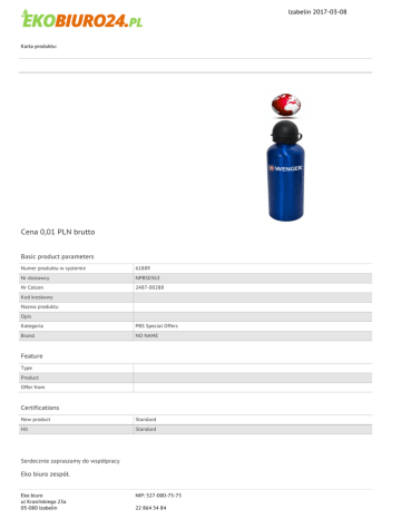Izabelin 2017-03-08 Karta produktu: Cena 0,01 PLN brutto Basic product parameters Numer produktu w systemie 61889 Nr dostawcy NPBS0363 Nr Celcen 2487-00288 Kod kreskowy Nazwa produktu Opis Kategoria PBS Special Offers Brand NO NAME Feature Type Product Offer from Certifications New product Standard Hit Standard Serdecznie zapraszamy do współpracy Eko biuro zespół. Eko biuro ul Krasińskiego 23a 05-080 Izabelin NIP: 527-000-75-75 22 864 54 84