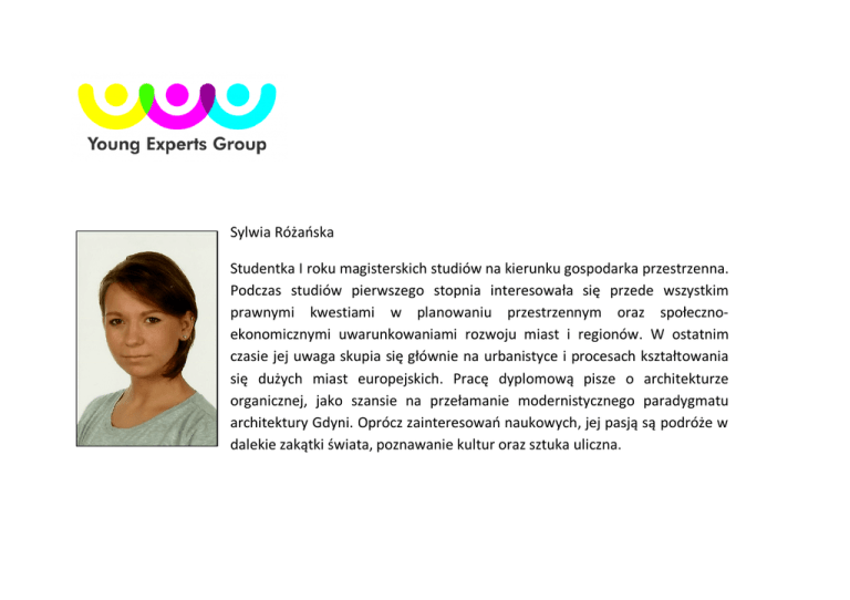 Sylwia Różańska Studentka I roku magisterskich studiów na kierunku gospodarka przestrzenna. Podczas studiów pierwszego stopnia interesowała się przede wszystkim prawnymi kwestiami w planowaniu przestrzennym oraz społecznoekonomicznymi uwarunkowaniami rozwoju miast i regionów. W ostatnim czasie jej uwaga skupia się głównie na urbanistyce i procesach kształtowania się dużych miast europejskich. Pracę dyplomową pisze o architekturze organicznej, jako szansie na przełamanie modernistycznego paradygmatu architektury Gdyni. Oprócz zainteresowań naukowych, jej pasją są podróże w dalekie zakątki świata, poznawanie kultur oraz sztuka uliczna.