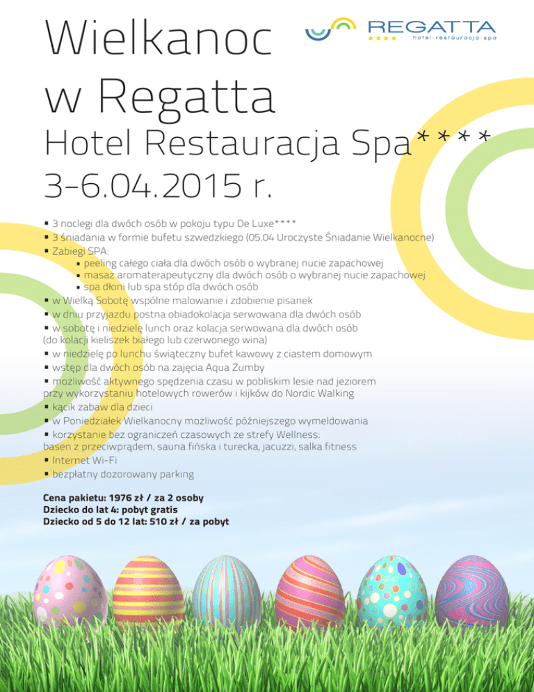 Wielkanoc w Regatta Hotel Restauracja Spa**** 3-6.04.2015 r. • 3 noclegi dla dwóch osób w pokoju typu De Luxe**** • 3 śniadania w formie bufetu szwedzkiego (05.04 Uroczyste Śniadanie Wielkanocne) • Zabiegi SPA: • peeling całego ciała dla dwóch osób o wybranej nucie zapachowej • masaż aromaterapeutyczny dla dwóch osób o wybranej nucie zapachowej • spa dłoni lub spa stóp dla dwóch osób • w Wielką Sobotę wspólne malowanie i zdobienie pisanek • w dniu przyjazdu postna obiadokolacja serwowana dla dwóch osób • w sobotę i niedzielę lunch oraz kolacja serwowana dla dwóch osób (do kolacji kieliszek białego lub czerwonego wina) • w niedzielę po lunchu świąteczny bufet kawowy z ciastem domowym • wstęp dla dwóch osób na zajęcia Aqua Zumby • możliwość aktywnego spędzenia czasu w pobliskim lesie nad jeziorem przy wykorzystaniu hotelowych rowerów i kijków do Nordic Walking • kącik zabaw dla dzieci • w Poniedziałek Wielkanocny możliwość późniejszego wymeldowania • korzystanie bez ograniczeń czasowych ze strefy Wellness: basen z przeciwprądem, sauna fińska i turecka, jacuzzi, salka fitness • Internet Wi-Fi • bezpłatny dozorowany parking Cena pakietu: 1976 zł / za 2 osoby Dziecko do lat 4: pobyt gratis Dziecko od 5 do 12 lat: 510 zł / za pobyt