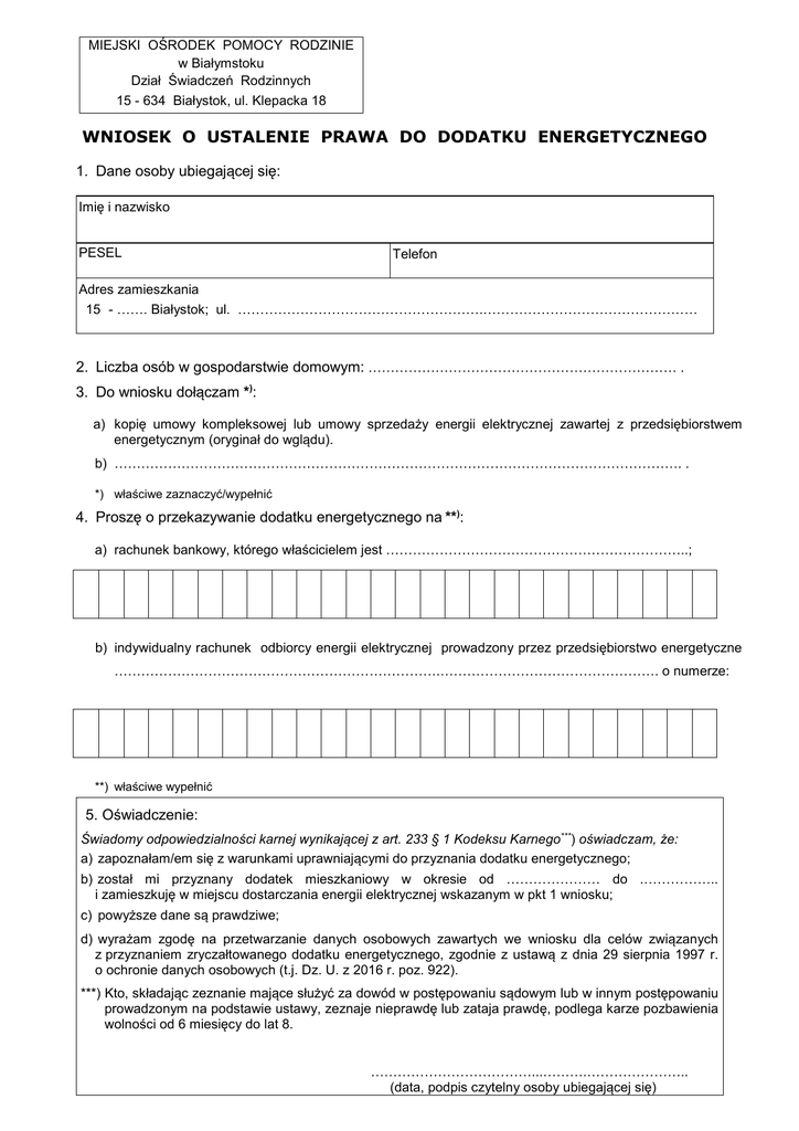 MIEJSKI OŚRODEK POMOCY RODZINIE w Białymstoku Dział Świadczeń Rodzinnych 15 - 634 Białystok, ul. Klepacka 18 WNIOSEK O USTALENIE PRAWA DO DODATKU ENERGETYCZNEGO 1. Dane osoby ubiegającej się: Imię i nazwisko PESEL Telefon Adres zamieszkania 15 - %%. Białystok; ul. %%%%%%%%%%%%%%%%%%.%%%%%%%%%%%%%%%% 2. Liczba osób w gospodarstwie domowym: %%%%%%%%%%%%%%%%%%%%%%% . 3. Do wniosku dołączam *): a) kopię umowy kompleksowej lub umowy sprzedaży energii elektrycznej zawartej z przedsiębiorstwem energetycznym (oryginał do wglądu). b) %%%%%%%%%%%%%%%%%%%%%%%%%%%%%%%%%%%%%%%%%%. . *) właściwe zaznaczyć/wypełnić 4. Proszę o przekazywanie dodatku energetycznego na **): a) rachunek bankowy, którego właścicielem jest %%%%%%%%%%%%%%%%%%%%%%..; b) indywidualny rachunek odbiorcy energii elektrycznej prowadzony przez przedsiębiorstwo energetyczne %%%%%%%%%%%%%%%%%%%%%%%%.%%%%%%%%%%%%%%%%. o numerze: **) właściwe wypełnić 5. Oświadczenie: Świadomy odpowiedzialności karnej wynikającej z art. 233 § 1 Kodeksu Karnego***) oświadczam, że: a) zapoznałam/em się z warunkami uprawniającymi do przyznania dodatku energetycznego; b) został mi przyznany dodatek mieszkaniowy w okresie od %%%%%%% do .%%%%%.. i zamieszkuję w miejscu dostarczania energii elektrycznej wskazanym w pkt 1 wniosku; c) powyższe dane są prawdziwe; d) wyrażam zgodę na przetwarzanie danych osobowych zawartych we wniosku dla celów związanych z przyznaniem zryczałtowanego dodatku energetycznego, zgodnie z ustawą z dnia 29 sierpnia 1997 r. o ochronie danych osobowych (t.j. Dz. U. z 2016 r. poz. 922). ***) Kto, składając zeznanie mające służyć za dowód w postępowaniu sądowym lub w innym postępowaniu prowadzonym na podstawie ustawy, zeznaje nieprawdę lub zataja prawdę, podlega karze pozbawienia wolności od 6 miesięcy do lat 8. %%%%%%%%%%%%...%%%.%%%%%%%.. (data, podpis czytelny osoby ubiegającej się) Pouczenie 1. Dodatek energetyczny przysługuje odbiorcy wrażliwemu energii elektrycznej tj. osobie, której przyznano dodatek mieszkaniowy w rozumieniu art. 2 ust. 1 ustawy z dnia 21 czerwca 2001 r. o dodatkach mieszkaniowych (t.j. Dz. U. z 2017 r., poz. 180), która jest stroną umowy kompleksowej lub umowy sprzedaży energii elektrycznej zawartej z przedsiębiorstwem energetycznym i zamieszkuje w miejscu dostarczania energii elektrycznej. 2. Dodatek energetyczny wynosi rocznie nie więcej niż 30% iloczynu limitu zużycia energii elektrycznej oraz średniej ceny energii elektrycznej dla odbiorcy energii elektrycznej w gospodarstwie domowym, ogłaszanej na podstawie art. 23 ust. 2 pkt 18 lit. d., ustawy z dnia 10 kwietnia 1997 r. - Prawo energetyczne (Dz. U. z 2012 r. poz.1059 z póź. zm.). 3. Wysokość limitu, o którym mowa w pkt 2 wynosi: a) 900 kWh w roku kalendarzowym – dla gospodarstwa domowego prowadzonego przez osobę samotną; b) 1250 kWh w roku kalendarzowym – dla gospodarstwa domowego składającego się z 2 do 4 osób; c) 1500 kWh w roku kalendarzowym – dla gospodarstwa domowego składającego się z co najmniej 5 osób. 4. Dodatek energetyczny wynosi miesięcznie 1/12 kwoty rocznej dodatku energetycznego ogłaszanej przez ministra właściwego do spraw gospodarki, na podstawie art.5c ust. 4 ustawy – Prawo energetyczne. %%%%%%%%%%%%%%%%%%%%%%%%%%%%%%%%%%%%%%%%%%%%%%% %%%%%%%%%%%%...%%%.%%%%%%%.. (data, podpis czytelny osoby ubiegającej się) Wypełnia organ przyjmujący wniosek: Nr decyzji przyznającej prawo do dodatku mieszkaniowego Okres przyznania dodatku mieszkaniowego Liczba osób w gospodarstwie domowym Okres przyznania dodatku energetycznego %%%%%%%%%%%%%%...%%%.%%%%%%%.. (data, podpis czytelny osoby rozpatrującej wniosek)