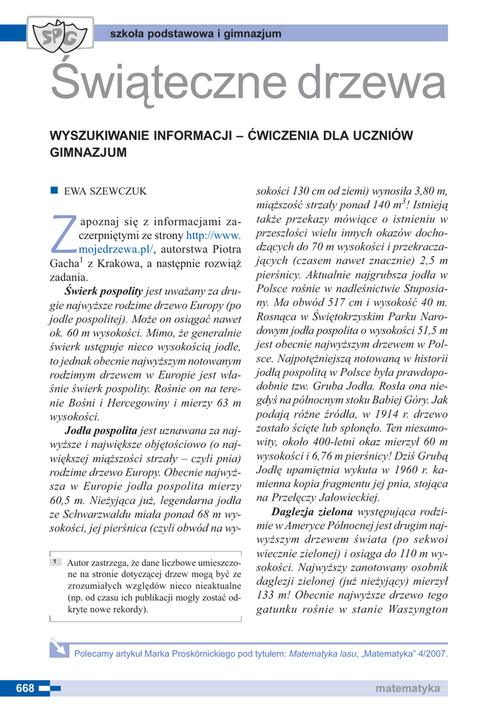 matematyka dawniej ii gimnazjum dzi szko³a podstawowa wi¹teczne drzewa WYSZUKIWANIE INFORMACJI ÆWICZENIA DLA UCZNIÓW GIMNAZJUM n EWA SZEWCZUK Z apoznaj siê z informacjami zaczerpniêtymi ze strony http://www. mojedrzewa.pl/, autorstwa Piotra Gacha1 z Krakowa, a nastêpnie rozwi¹¿ zadania. wierk pospolity jest uwa¿any za drugie najwy¿sze rodzime drzewo Europy (po jodle pospolitej). Mo¿e on osi¹gaæ nawet ok. 60 m wysokoci. Mimo, ¿e generalnie wierk ustêpuje nieco wysokoci¹ jodle, to jednak obecnie najwy¿szym notowanym rodzimym drzewem w Europie jest w³anie wierk pospolity. Ronie on na terenie Boni i Hercegowiny i mierzy 63 m wysokoci. Jod³a pospolita jest uznawana za najwy¿sze i najwiêksze objêtociowo (o najwiêkszej mi¹¿szoci strza³y czyli pnia) rodzime drzewo Europy. Obecnie najwy¿sza w Europie jod³a pospolita mierzy 60,5 m. Nie¿yj¹ca ju¿, legendarna jod³a ze Schwarzwaldu mia³a ponad 68 m wysokoci, jej piernica (czyli obwód na wy1 Autor zastrzega, ¿e dane liczbowe umieszczone na stronie dotycz¹cej drzew mog¹ byæ ze zrozumia³ych wzglêdów nieco nieaktualne (np. od czasu ich publikacji mog³y zostaæ odkryte nowe rekordy). sokoci 130 cm od ziemi) wynosi³a 3,80 m, mi¹¿szoæ strza³y ponad 140 m3! Istniej¹ tak¿e przekazy mówi¹ce o istnieniu w przesz³oci wielu innych okazów dochodz¹cych do 70 m wysokoci i przekraczaj¹cych (czasem nawet znacznie) 2,5 m piernicy. Aktualnie najgrubsza jod³a w Polsce ronie w nadlenictwie Stuposiany. Ma obwód 517 cm i wysokoæ 40 m. Rosn¹ca w wiêtokrzyskim Parku Narodowym jod³a pospolita o wysokoci 51,5 m jest obecnie najwy¿szym drzewem w Polsce. Najpotê¿niejsz¹ notowan¹ w historii jod³¹ pospolit¹ w Polsce by³a prawdopodobnie tzw. Gruba Jod³a. Ros³a ona niegdy na pó³nocnym stoku Babiej Góry. Jak podaj¹ ró¿ne ród³a, w 1914 r. drzewo zosta³o ciête lub sp³onê³o. Ten niesamowity, oko³o 400-letni okaz mierzy³ 60 m wysokoci i 6,76 m piernicy! Dzi Grub¹ Jod³ê upamiêtnia wykuta w 1960 r. kamienna kopia fragmentu jej pnia, stoj¹ca na Prze³êczy Ja³owieckiej. Daglezja zielona wystêpuj¹ca rodzimie w Ameryce Pó³nocnej jest drugim najwy¿szym drzewem wiata (po sekwoi wiecznie zielonej) i osi¹ga do 110 m wysokoci. Najwy¿szy zanotowany osobnik daglezji zielonej (ju¿ nie¿yj¹cy) mierzy³ 133 m! Obecnie najwy¿sze drzewo tego gatunku ronie w stanie Waszyngton Polecamy artyku³ Marka Proskórnickiego pod tytu³em: Matematyka lasu, Matematyka 4/2007. 668 matematyka matematyka dawniej i dzi szko³a podstawowa i gimnazjum w USA i ma wysokoæ 99,4 m. Rosn¹ca w Argyll w Szkocji daglezja o nazwie Stronardron mierzy 63,79 m i jest prawdopodobnie czwartym (po dwóch eukaliptusach i jodle olbrzymiej) najwy¿szym drzewem w Europie. Jak podaje Wikipedia, najgrubszy i jeden z najwy¿szych okazów daglezji w Polsce (na terenie Lasów Pañstwowych) ronie w Wierciszewie (powiat Koszalin). Drzewo ma ponad 470 cm obwodu i 48 metrów wysokoci. Jego wiek szacowany jest na 170 lat. Pomiarami i obliczaniem wielkoci drzew (nie tylko ich pni) zajmuje siê dendrologia. W teoretycznych badaniach dendrometrycznych stosuje siê modele geometryczne. Rzeczywisty wygl¹d drzewa przybli¿a siê kszta³tami bry³ obrotowych. Niektóre parametry elementów drzew nosz¹ inn¹ nazwê ni¿ analogiczne parametry w odniesieniu do bry³ geometrycznych np. rednica to w przypadku drzew gruboæ, objêtoæ to mi¹¿szoæ. Do oszacowania mi¹¿szoci drzewa stosuje siê wiele ró¿nych, czasami skomplikowanych metod. Bierze siê pod uwagê miêdzy innymi kszta³t drzewa i jego wymiary. S¹ te¿ metody okrelania mi¹¿szoci ca³ego drzewostanu (lasu). Jednym z doæ prostych sposobów szacowania mi¹¿szoci (v) strza³y drzewa stoj¹cego jest tzw. wzór Denzina: v = 0,001 × d 2[m3], gdzie liczba d oznacza piernicê wyra¿on¹ w centymetrach. Ka¿dego roku w Bo¿e Narodzenie stolica Norwegii Oslo przesy³a do Londynu, Nowego Jorku i Waszyngtonu drzewko wierka pospolitego. Jest to symbol wdziêcznoci za pomoc, jak¹ Anglia i USA udzieli³y Norwegii w czasie II wojny wiatowej. 11/2010 Daglezja zielona Zadania do tekstu: Jakim pojêciom matematycznym (geometrycznym) odpowiadaæ mog¹ terminy: pieñ jod³y czyli tzw. strza³a, piernica, mi¹¿szoæ strza³y? Stosuj¹c wzór Denzina sprawd dane dotycz¹ce mi¹¿szoci strza³y legendarnej jod³y ze Schwarzwaldu. Na podstawie tekstu okrel, jaki zakres mog¹ mieæ piernice najbardziej okaza³ych znanych jode³ pospolitych. Wyznacz zakres mo¿liwych rednic przekrojów poprzecznych dla tych okazów. Oszacuj mi¹¿szoæ strza³y: a) Grubej Jod³y, ¿yj¹cej przed 100 laty w Górach wiêtokrzyskich; b) okazu najgrubszej ¿yj¹cej obecnie jod³y pospolitej. 669 matematyka dawniej ii gimnazjum dzi szko³a podstawowa a) Oblicz jaki procent mi¹¿szoci strza³y legendarnej jod³y ze Schwarzwaldu stanowi oszacowana mi¹¿szoæ Grubej Jod³y. b) Oblicz jaki procent mi¹¿szoci strza³y Grubej Jod³y stanowi mi¹¿szoæ pnia jod³y ze Schwarzwaldu. a) Oblicz jaki procent mi¹¿szoci strza³y Grubej Jod³y stanowi mi¹¿szoæ pnia najgrubszej jod³y pospolitej ¿yj¹cej obecnie w Polsce. b) Oblicz jaki procent mi¹¿szoci strza³y najgrubszej jod³y pospolitej ¿yj¹cej obecnie w Polsce stanowi mi¹¿szoæ pnia Grubej Jod³y. a) O ile procent najwy¿sza ¿yj¹ca polska jod³a pospolita jest ni¿sza od najwy¿szego okazu ¿yj¹cej obecnie daglezji zielonej? b) O ile procent najwy¿sza ¿yj¹ca obecnie daglezja jest wy¿sza od najwy¿szego okazu ¿yj¹cej polskiej jod³y? a) O ile metrów wy¿sza od najwy¿szej w Polsce daglezji zielonej jest najwy¿sza ze znanych daglezji zielonych? b) Ile razy wy¿sza od najwy¿szej w Polsce daglezji zielonej jest najwy¿sza ze znanych daglezji. c) O ile procent wy¿sza od najwy¿szej w Polsce daglezji zielonej jest najwy¿sza ze znanych daglezji? Okrel (w odniesieniu do przedstawionego tekstu), czy podane stwierdzenie jest prawdziwe czy fa³szywe? Uzasadnij wskazuj¹c 