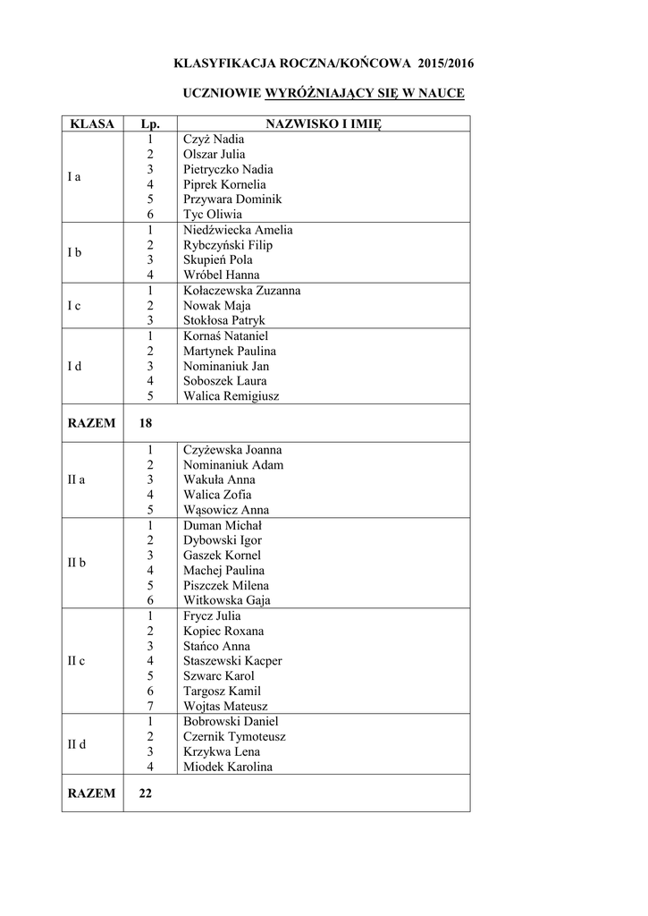KLASYFIKACJA ROCZNA/KOŃCOWA 2015/2016 UCZNIOWIE WYRÓŻNIAJĄCY SIĘ W NAUCE KLASA Ia Ib Ic Id RAZEM II a II b II c II d RAZEM Lp. 1 2 3 4 5 6 1 2 3 4 1 2 3 1 2 3 4 5 NAZWISKO I IMIĘ Czyż Nadia Olszar Julia Pietryczko Nadia Piprek Kornelia Przywara Dominik Tyc Oliwia Niedźwiecka Amelia Rybczyński Filip Skupień Pola Wróbel Hanna Kołaczewska Zuzanna Nowak Maja Stokłosa Patryk Kornaś Nataniel Martynek Paulina Nominaniuk Jan Soboszek Laura Walica Remigiusz 18 1 2 3 4 5 1 2 3 4 5 6 1 2 3 4 5 6 7 1 2 3 4 22 Czyżewska Joanna Nominaniuk Adam Wakuła Anna Walica Zofia Wąsowicz Anna Duman Michał Dybowski Igor Gaszek Kornel Machej Paulina Piszczek Milena Witkowska Gaja Frycz Julia Kopiec Roxana Stańco Anna Staszewski Kacper Szwarc Karol Targosz Kamil Wojtas Mateusz Bobrowski Daniel Czernik Tymoteusz Krzykwa Lena Miodek Karolina III a III b III c III d RAZEM IV a IV b IV c RAZEM 1 2 3 4 5 6 1 2 3 4 5 Babik Wiktor Bochenek Igor Kądziałka Gabriela Machej Mateusz Piszczek Jan Stoszek Maksymilian Hintz Viktoria Kuchejda Adam Kusy Jan Skalska Angelika Zawadzka Emilia 1 2 3 4 5 6 1 2 3 4 Czarnojan Mateusz Gęborska Nikola Jordan Izabela Ogierman Dominik Umański Michał Zdejszy Mart Faruga Oliwia Hornik Karolina Szypuła Julian Trela Tomasz 21 1 2 3 4 5 6 7 8 9 10 11 1 2 3 4 5 1 2 18 Bieniek Kacper Budzińska-Lipka Amelia Królak Szymon Matuszek Amelia Nikiel Wiktoria Panak Martyna Polok Julia Szucio Martyna Uznański Damian Wałga Stanisław Wąsowicz Michał Dębińska Patrycja Król Maja Rzymanek Grzegorz Rybczyński Dawid Wójcik Marta Królewska Angela Zawada Sebastian Va Vb Vc RAZEM VI a VI b VI c RAZEM 1 2 3 4 1 2 3 4 1 2 3 4 5 6 7 8 9 10 11 Bojarska Anna Brzóska Amelia Fiedor Barbara Herok Kacper Dal Joanna Król Natalia Krzywoń Łucja Niedoba Paulina Bajda Dominika Biegun Nadia Cieślar Kamila Gęborski Oliwier Hankus Marek Iwaniec Laura Kajstura Aleksander Rymanowska Maja Szlachta Krzysztof Wajner Julia Wróbel Filip 19 1 2 3 4 5 6 1 2 3 4 1 2 3 4 5 6 Nowakowska Michalina Stoszek Hanna Szczepańska Iga Uznański Seweryn Walica Emilia Wawrzacz Justyna Gojniczek Katarzyna Furmaniuk Zofia Panak Anna Skoneczny Karolina Antecka Emilia Burzywoda Małgorzata Koper Justyna Lizak Oliwia Madzia Szymon Walica Emilia 16 RAZEM I - III 61 RAZEM IV - VI 53