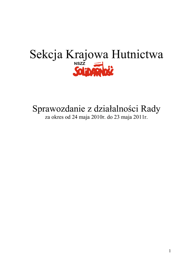 Sekcja Krajowa Hutnictwa Sprawozdanie z działalności Rady za okres od 24 maja 2010r. do 23 maja 2011r. 1 Drogie Koleżanki i Koledzy 1. Wybory Rok 2010 był rokiem wyborczym w NSZZ „Solidarność”. W wyniku wyborów dokonanych na Walnym Zebraniu Delegatów Sekcji Krajowej Hutnictwa, które miało miejsce 24 maja 2010r. dokonano wyboru: Adama Ditmera na Przewodniczącego Rady, członków Rady: BROSZKIEWICZ Stanisław CIEŚLIK Zbigniew CZARNECKI Mieczysław FORMA Janusz GĘBARA Andrzej - wiceprzewodniczący, skarbnik JAKUBIEC Wiesław JONKISZ Bolesław KAROL Andrzej - wiceprzewodniczący, sekretarz KAWKA Ireneusz 10. KORZENIEWICZ Lesław - członek Prezydium 11. KOZŁOWSKI Marek 12. KRASUSKI Wojciech 13. NOWAK Mirosław - członek Prezydium 14. NOWICKA Danuta 15. PŁOCHA Ireneusz 16. PRZYBYSZ Irena 17. STRĄCZYŃSKI Jacek – członek Prezydium 18. STYPUŁA Krzysztof 19. SYNOWSKI Mieczysław 20. SZREK Stanisław 21. WĘGRZYN Roman 22. WOŹNICA Zbigniew 1. 2. 3. 4. 5. 6. 7. 8. 9. Komisji Rewizyjnej: 1. 2. 3. 4. 5. 6. BALICKA Joanna KRZYWY Krzysztof SKRUCHA Kazimierz WIERZBA Rafał WÓJCIK Zdzisław ZIELEZIŃSKA Renata oraz Delegatów na Kongres Sekretariatu: 1. 2. 3. 4. 5. 6. 7. 8. BROSZKIEWICZ Stanisław CIEŚLIK Zbigniew CZARNECKI Mieczysław FORMA Janusz GĘBARA Andrzej JONKISZ Bolesław KAROL Andrzej KIELIAN Władysław 2 9. KORZENIEWICZ Lesław 10. KRASUSKI Wojciech 11. NOWAK Mirosław 12. NOWAKOWSKI Zdzisław 13. NOWICKA Danuta 14. PENKAŁA Stefania 15. PŁOCHA Ireneusz 16. PRZYBYSZ Irena 17. SMOŁA Jerzy 18. STRĄCZYŃSKI Jacek 19. STYPUŁA Krzysztof 20. SYNOWSKI Mieczysław 21. SZREK Stanisław 22. WOŹNICA Zbigniew 23. WÓJCIK Zdzisław 40 Walne Zebranie Delegatów podjęło 6 Uchwał i Stanowisko. Na XX Kongresie Sekretariatu Metalowców, który odbył się w Katowicach w dniu 28 czerwca 2010r. Przewodniczącym Rady Sekretariatu został wybrany Bogdan Szozda – Przewodniczący Sekcji Krajowej Przemysłu Motoryzacyjnego. W skład Rady Sekretariatu z Sekcji Krajowej Hutnictwa NSZZ „Solidarność” zostali wybrani: Adam DITMER – Zastępca Przewodniczącego Rady Andrzej GĘBARA - członek Andrzej KAROL - członek Mirosław NOWAK – członek Do Komisji Rewizyjnej wybrany został Zdzisław WÓJCIK. W październiku ubiegłego roku na Krajowym Zjeździe Delegatów na Przewodniczącego Komisji Krajowej NSZZ „Solidarność wybrany został Piotr Duda, w konsekwencji Komisja Krajowa dokonała wyboru nowego Prezydium. W dniu wyborów Sekcja Krajowa Hutnictwa zrzeszała 32 KZ/MKZ i liczyła 14.038 członków. Po weryfikacji dokonanej na koniec 2010 roku Sekcja zrzesza 31 KZ/MKZ oraz 13.404 członków. Rejestr organizacji zakładowych Sekcji Krajowej Hutnictwa NSZZ „Solidarność” - stan na maj 2011r. 1 2 3 4 5 6 7 8 9 10 11 12 13 14 Aluminium Konin SA Arcelor Mittal Huta Warszawa Sp. z o.o. Arcelor Mittal Poland SA - Dąbrowa Górnicza Arcelor Mittal Poland SA - Kraków Arcelor Mittal Poland SA - Sosnowiec Arcelor Mittal Poland SA - Świętochłowice CELSA Huta Ostrowiec Sp. z o.o. CMC Zawiercie SA HPR Kraków Sp. z o.o. Huta Baildon Huta Batory Sp. z o.o. Huta Kościuszko SA - Królewska Sp. z o.o. Huta Łabędy SA Huta Łaziska SA 3 15 16 17 18 19 20 21 22 23 24 25 26 27 28 29 30 31 Huta Metali Nieżelaznych Szopienice SA Huta Oława SA Huta Pokój SA Hutmen SA ISD Huta Częstochowa SA Kombinat Koksochemiczny Zabrze SA Orzeł Biały SA PMO, KOMEX Sp. z o.o./MAXBUD sp. z o.o. PP I OZM HK-Cutiron Sp. z o.o. PUM Pumech Orzeł Sp. z o.o. Scrapena SA SGL Carbon Polska SA (Racibórz) Silesia Sp. z o.o. (Buczek) Stalprodukt SA Walcownia Metali Dziedzice SA Walcownia Metali Nieżelaznych Sp. z o.o. Zakłady Metalurgiczne Silesia SA W trakcie pierwszego roku kadencji Rada odbyła 5 posiedzeń i podjęła następujące Uchwały i Stanowiska: Stanowisko 1/2010 ws. kandydata Sekcji na Przewodniczącego Rady Sekretariatu Metalowców Uchwała 6/2010 ws. złożenia wzorów podpisów w celu dysponowania środkami na rachunku Sekcji Uchwała nr 7/2010 ws. dysponowania środkami na rachunku Sekcji Uchwała nr 8/2010 ws. ustalenia liczebności SKH Uchwała nr 1/2011 ws. zatwierdzenia Preliminarza za 2010r. Uchwała nr 2/12011 ws. przyjęcia prowizorium Preliminarza na 2011r. 2. Sytuacja w branży W czasie okresu sprawozdawczego nastąpiło powolne złagodzenie skutków kryzysu. Zdaniem prelegentów Europejskiego Kongresu Gospodarczego tendencja ta będzie się utrzymywać i wg przedstawianych prognoz, rok 2011 powinien zakończyć się wyprodukowaniem stali surowej na poziomie 8,7 mln. ton, podobnie powinna wzrosnąć produkcja koksu. Zakłady Metali Nieżelaznych przeżywają bardzo trudny okres, szczególnie dotyczy to Grupy Hutmen. Wg opublikowanych danych GUS za 4 miesiące 2011r. średnia płaca w przemyśle kształtuje się na poziomie 3.600 zł, obserwuje się nieznaczny spadek stopy bezrobocia. Wyniki badań, jakie na zlecenie Sekcji prowadzone są przez CIBEH, a dotyczące zatrudnienia, czasu pracy i produktywności przedstawione są poniżej w tabelach i wykresach. 4 Produkcja stali surowej w latach 2006-2010 lata 2006 2007 2008 2009 2010 w tys. ton 9 991 10 630 9 727 7 129 7 993 źródła: HIPH, CIBEH 11 000 10 000 9 000 8 000 7 000 6 000 2006 2007 2008 2009 2010 Produkcja koksu w latach 2006-2010 lata mln. ton 2006 2007 2008 2009 2010 9,6 10,3 9,8 7,0 9,5 źródło: HIPH 11 10 9 8 7 6 5 2006 2007 2008 2009 2010 5 Zatrudnienie w przemyśle stalowym na dzień 31.12 w latach 2006-2010 i I kw. 2011r. lata 2006 2007 2008 2009 2010 I kw 2011 liczba pracowników 30 388 28 959 29 443 26 293 25475 25 770 źródło: CIBEH 31000 30000 29000 28000 27000 26000 25000 2006 2007 2008 2009 2010 2011 Wynagrodzenia średniomiesięczne za 12 miesięcy w hutnictwie żelaza i stali w latach 2006-2010 i I kw. 2011 2006 2007 2008 2009 2010 I kw. 2011 wynagrodzenie 3 525,8 4 103,6 4 200,9 4 480 4978 4956 świadczenia pracodawcy na rzecz pracowników 1 034,3 1 153,1 1 115,9 977 1356 1518 4978 4956 zł/1 za