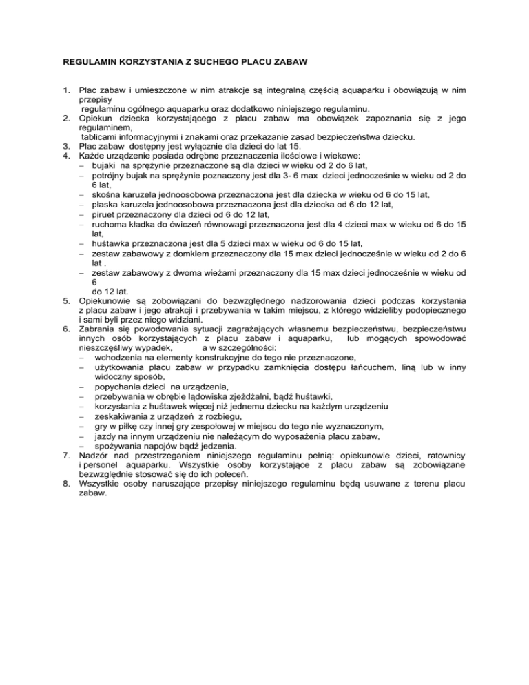 REGULAMIN KORZYSTANIA Z SUCHEGO PLACU ZABAW 1. Plac zabaw i umieszczone w nim atrakcje są integralną częścią aquaparku i obowiązują w nim przepisy regulaminu ogólnego aquaparku oraz dodatkowo niniejszego regulaminu. 2. Opiekun dziecka korzystającego z placu zabaw ma obowiązek zapoznania się z jego regulaminem, tablicami informacyjnymi i znakami oraz przekazanie zasad bezpieczeństwa dziecku. 3. Plac zabaw dostępny jest wyłącznie dla dzieci do lat 15. 4. Każde urządzenie posiada odrębne przeznaczenia ilościowe i wiekowe: bujaki na sprężynie przeznaczone są dla dzieci w wieku od 2 do 6 lat, potrójny bujak na sprężynie poznaczony jest dla 3- 6 max dzieci jednocześnie w wieku od 2 do 6 lat, skośna karuzela jednoosobowa przeznaczona jest dla dziecka w wieku od 6 do 15 lat, płaska karuzela jednoosobowa przeznaczona jest dla dziecka od 6 do 12 lat, piruet przeznaczony dla dzieci od 6 do 12 lat, ruchoma kładka do ćwiczeń równowagi przeznaczona jest dla 4 dzieci max w wieku od 6 do 15 lat, huśtawka przeznaczona jest dla 5 dzieci max w wieku od 6 do 15 lat, zestaw zabawowy z domkiem przeznaczony dla 15 max dzieci jednocześnie w wieku od 2 do 6 lat . zestaw zabawowy z dwoma wieżami przeznaczony dla 15 max dzieci jednocześnie w wieku od 6 do 12 lat. 5. Opiekunowie są zobowiązani do bezwzględnego nadzorowania dzieci podczas korzystania z placu zabaw i jego atrakcji i przebywania w takim miejscu, z którego widzieliby podopiecznego i sami byli przez niego widziani. 6. Zabrania się powodowania sytuacji zagrażających własnemu bezpieczeństwu, bezpieczeństwu innych osób korzystających z placu zabaw i aquaparku, lub mogących spowodować nieszczęśliwy wypadek, a w szczególności: wchodzenia na elementy konstrukcyjne do tego nie przeznaczone, użytkowania placu zabaw w przypadku zamknięcia dostępu łańcuchem, liną lub w inny widoczny sposób, popychania dzieci na urządzenia, przebywania w obrębie lądowiska zjeżdżalni, bądź huśtawki, korzystania z huśtawek więcej niż jednemu dziecku na każdym urządzeniu zeskakiwania z urządzeń z rozbiegu, gry w piłkę czy innej gry zespołowej w miejscu do tego nie wyznaczonym, jazdy na innym urządzeniu nie należącym do wyposażenia placu zabaw, spożywania napojów bądź jedzenia. 7. Nadzór nad przestrzeganiem niniejszego regulaminu pełnią: opiekunowie dzieci, ratownicy i personel aquaparku. Wszystkie osoby korzystające z placu zabaw są zobowiązane bezwzględnie stosować się do ich poleceń. 8. Wszystkie osoby naruszające przepisy niniejszego regulaminu będą usuwane z terenu placu zabaw.