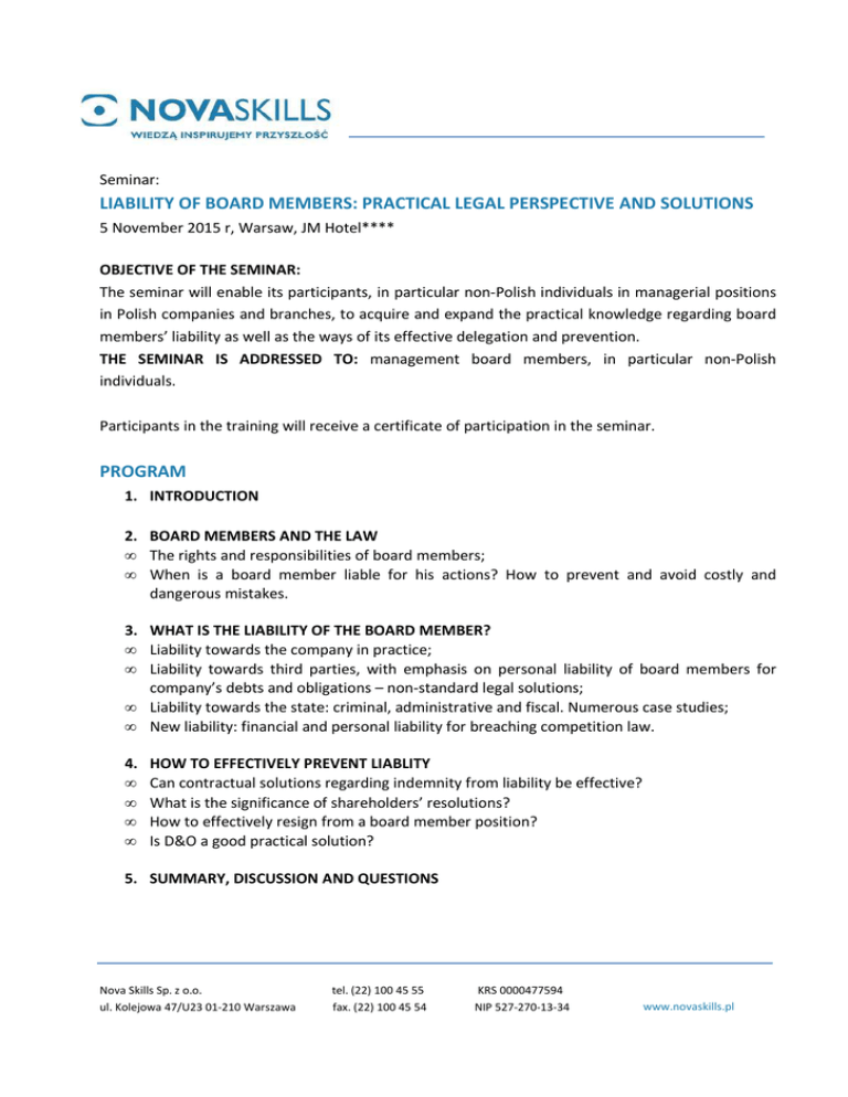 Seminar: LIABILITY OF BOARD MEMBERS: PRACTICAL LEGAL PERSPECTIVE AND SOLUTIONS 5 November 2015 r, Warsaw, JM Hotel**** OBJECTIVE OF THE SEMINAR: The seminar will enable its participants, in particular non-Polish individuals in managerial positions in Polish companies and branches, to acquire and expand the practical knowledge regarding board members’ liability as well as the ways of its effective delegation and prevention. THE SEMINAR IS ADDRESSED TO: management board members, in particular non-Polish individuals. Participants in the training will receive a certificate of participation in the seminar. PROGRAM 1. INTRODUCTION 2. BOARD MEMBERS AND THE LAW • The rights and responsibilities of board members; • When is a board member liable for his actions? How to prevent and avoid costly and dangerous mistakes. 3. WHAT IS THE LIABILITY OF THE BOARD MEMBER? • Liability towards the company in practice; • Liability towards third parties, with emphasis on personal liability of board members for company’s debts and obligations – non-standard legal solutions; • Liability towards the state: criminal, administrative and fiscal. Numerous case studies; • New liability: financial and personal liability for breaching competition law. 4. • • • • HOW TO EFFECTIVELY PREVENT LIABLITY Can contractual solutions regarding indemnity from liability be effective? What is the significance of shareholders’ resolutions? How to effectively resign from a board member position? Is D&O a good practical solution? 5. SUMMARY, DISCUSSION AND QUESTIONS Nova Skills Sp. z o.o. ul. Kolejowa 47/U23 01-210 Warszawa tel. (22) 100 45 55 fax. (22) 100 45 54 KRS 0000477594 NIP 527-270-13-34 www.novaskills.pl EKSPERT: Marcin Paczewski, legal adviser, head of the Competition Department at Chałas & Partners. Marcin Paczewski is an expert in antitrust and competition law, complex litigation and corporate issues. He has significant experience gained at Magic Circle law firms. Clients describe Marcin as a highly effective lawyer, with non-standard solutions. He perfectly understands the business objectives of his Clients. Marcin has advised entities from a variety of sectors, including high-profile financial, pharmaceutical and FMCG organisations. He has extensive experience in providing comprehensive legal services to international and domestic businesses. He creates tailor-made practical competition compliance programs and liability prevention schemes for Board Members and regularly provides training in this area. Marcin represents clients in administrative proceedings (explanatory and antimonopoly) before the president of the Office of Competition and Customer Protection, before the European Commission and in court proceedings before the District and Regional Courts, Courts of Appeal as well as the Supreme Court. Marcin advises on a number of complex legal proceedings related to unfair competition. Marcin’s practice also includes representing clients during dawn-raids by the European Commission and the Office of Competition and Consumer Protection. Marcin has completed Postgraduate Studies in Competition Law INP PAN in Warsaw and lectures for Competition Law Organisation at the Warsaw University. He is a member of the Bar Council in Warsaw. He speaks fluent English and German. Nova Skills Sp. z o.o. ul. Kolejowa 47/U23 01-210 Warszawa tel. (22) 100 45 55 fax. (22) 100 45 54 KRS 0000477594 NIP 527-270-13-34 www.novaskills.pl Warsztaty: ODPOWIEDZIALNOŚĆ CZŁONKÓW ZARZĄDU SPÓŁEK KAPITAŁOWYCH 5 listopada 2015 r, Warszawa, JM Hotel **** CEL SEMINARIUM: Seminarium umożliwi uczestnikom, w szczególności obcokrajowcom pełniącym w polskich spółkach lub oddziałach przedsiębiorców zagranicznych funkcje kierownicze, zdobycie i poszerzenie praktycznej wiedzy dotyczącej odpowiedzialności członków zarządów, możliwości jej delegowania oraz sposobów zabezpieczenia. SEMINARIUM SKIEROWANE JEST DO: kadry zarządzającej, przede wszystkim do obcokrajowców prezesów i członków zarządu. Uczestnicy szkolenia otrzymają certyfikat uczestnictwa w seminarium. Program Seminarium: 1. WPROWADZENIE 2. CZŁONEK ZARZĄDU A PRAWO: • Prawa i obowiązki członka zarządu; • Kiedy członek zarządu pełni funkcję w świetle przepisów o odpowiedzialności? Jak uniknąć kosztownych i niebezpiecznych błędów? 3. ZA CO I WOBEC KOGO MOŻE ODPOWIADAĆ CZŁONEK ZARZĄDU • Odpowiedzialność wobec spółki w praktyce; • Odpowiedzialności wobec osób trzecich, ze szczególnym uwzględnieniem odpowiedzialności osobistej członków zarządów za zobowiązania spółki – niestandardowe rozwiązania prawne; • Odpowiedzialność wobec państwa: karna, administracyjna i skarbowa. Liczne case studies; • Szczególny rodzaj odpowiedzialności: finansowa i osobista za naruszenie prawa konkurencji. 4. • • • • MECHANIZMY OGRANICZENIA RYZYKA: Czy umowa dot. odpowiedzialności będzie skuteczna? Jakie znaczenie ma absolutorium? Kiedy i jak złożyć rezygnację? Czy ubezpieczenie jest rozwiązaniem? 5. PODSUMOWANIE SEMINARIUM, DYSKUSJA, PYTANIA, INDYWIDUALNE KONSULTACJE Nova Skills Sp. z o.o. ul. Kolejowa 47/U23 01-210 Warszawa tel. (22) 100 45 55 fax. (22) 100 45 54 KRS 0000477594 NIP 527-270-13-34 www.novaskills.pl EKSPERT: Marcin Paczewski, radca prawny, szef Departamentu Prawa Konkurencji i Antymonopolowego w Kancelarii Prawnej Chałas i Wspólnicy. Mecenas Marcin Paczewski jest doświadczonym specjalistą w dziedzinie prawa antymonopolowego i prawa konkurencji, a także sporów sądowych i korporacyjnego. Posiada wieloletnie doświadczenie zdobyte w oddziałach renomowanych, zagranicznych kancelarii prawnych. Charakteryzuje się niestandardowym podejściem, wysoką skutecznością w rozwiązywaniu skomplikowanych sporów i pełnym zrozumieniem aktualnych potrzeb biznesowych Klientów. W swojej dotychczasowej praktyce doradzał podmiotom z wielu sektorów, w szczególności finansowego, FMCG oraz farmac