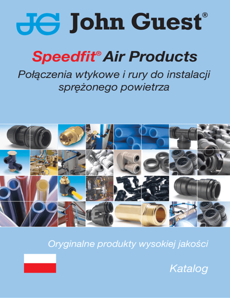 John Guest ® Speedfit Air Products ® Połączenia wtykowe i rury do instalacji sprężonego powietrza Oryginalne produkty wysokiej jakości Katalog John Guest ® Speedfit® – “Jakość, która łączy” Technika połączeń Przykłady instalacji • prosty i szybki montaż, “right first time” • idealne do sprężonego powietrza oraz cieczy jakość produkcji BS-5750 część I, • najwyższa ISO 9001, EN 29001 • montaż bez użycia narzędzi • szybkie rozłączanie połączeń • bez dodatkowego uszczelniania do większości rur • stosowane z metalu lub tworzywa sztucznego • możliwość wielokrotnego łączenia i rozłączania • bardzo dobre właściwości przepływowe • szeroka gama produktów • nakrętki ochronne do zabezpieczenia instalacji lub oznaczenia kolorystycznego 2 Wszystkie informacje zawarte w niniejszym katalogu są bez gwarancji. Zastrzegamy sobie wprowadzanie wszelkiego rodzaju zmian bez zapowiedzi. John Guest ® System modułowy John Guest Ø 12 mm - Ø 28 mm Produkty Speedfit® można rozszerzyć poprzez zwykłe łączenie ze sobą produktów z danej serii. + + + = = = Rury z tworzywa sztucznego, miedzi i aluminium Pomimo tego, że zaleca się stosowanie rur z tworzywa sztucznego lub aluminium John Guest, możliwe jest także stosowanie innych rur (miedź, mosiądz, itp.) w połączeniu z naszymi złączami (prosimy o zgłaszanie pytań). 3 John Guest ® Właściwości techniczne przewodów sprężonego powietrza ø 12-28 mm Ciśnienie robocze i zakresy temperatur Złączki Speedfit® można stosować przy następujących ciśnieniach i temperaturach: Chemikalia płynne Temperatura powietrza* Ciśnienie** - 20 °C 10 bar Złączy Speedfit® nie zaleca się stosować z gazami wybuchowymi, paliwami, czystym tlenem oraz innymi niebezpiecznymi substancjami. W przypadku stosowania chemikaliów lub innych potencjalnie agresywnych płynów takich jak uszczelniacze płynne (loctite) prosimy o kontakt z naszym działem technicznym. + 1 °C 10 bar Nakrętki ochronne + 23 °C 10 bar + 70 °C 7 bar Stosuje się je jako dodatkowe zabezpieczenie zapobiegające wysunięciu się przewodu elastycznego lub do ochrony (oznaczenie) jako rozróżnienie kolorystyczne (patrz Osprzęt strona 8 niniejszego katalogu). *dla temperatury poniżej 0ºC prosimy o kontakt **dane dotyczące ciśnień zależą również od materiału, z którego wykonane są rury. W/w dane dotyczą wyłącznie powietrza. Dla zastosowań z cieczami w połączeniu z temperaturą oraz ciśnieniem, prosimy o kontakt. Złącza Speedfit® można także stosować do próżni oraz głębokiej próżni. W zależności od stosowanych przewodów elastycznych względnie sztywnych prętów przy zachowaniu określonych warunków, złącza mogą być stosowane także do wyższych ciśnień i temperatur. Rodzaje rur Rury z tworzywa sztucznego Rury z polietylenu, poliamidu lub poliuretanu, odpowiadające tolerancjom (patrz poniżej). W przypadku rur o miękkich lub cienkich ściankach zalecamy zasadniczo zastosowanie tulei, a także sprawdzenie zakresów ciśnienia, w jakich rury mogą być używane. (Prosimy o zgłaszanie pytań). Rury z metalu Rury z mosiądzu, miedzi oraz aluminium, odpo(miękkiego) wiadające tolerancjom (patrz poniżej). Rury z metalu (twardego) Należy wcześniej sprawdzić możliwość zastolub poddane obróbce sowania złączek wtykowych. Prosimy o zgłapowierzchniowej szanie pytań. Tolerancje dla rur Złączki Speedfit® można zastosować do rur o następujących wymiarach i tolerancjach. śr. zewn. rury (mm) tolerancje (mm) Ø 12 mm - 28 mm +0.05/-0.10 Montaż i testowanie instalacji Wszystkie przewody elastyczne i złączki używane do montażu powinny być czyste i bez uszkodzeń. Instalacja Wszystkie rury i złącza powinny być czyste i bez uszkodzeń. Należy koniecznie zwrócić uwagę aby powierzchnia zewnętrzna rur nie miała rys wzdłużnych, wygięć lub innych uszkodzeń. Test ciśnieniowy instalacji Po zakończeniu montażu należy przeprowadzić próbę ciśnieniową wszystkich zainstalowanych rur i złączy w celu stwierdzenia szczelności instalacji jeszcze przed przekazaniem jej klientowi. Zalecamy przetestowanie instalacji zarówno nowo wykonanej jak i już istniejącej przed włączeniem do użytku w następujący sposób: - sprawdzić system pod ciśnieniem roboczym 10 bar przez 10 minut. - zredukować ciśnienie do 0 bar - następnie powtórnie sprawdzić instalację pod ciśnieniem 2 bar przez kolejne 10 minut W tym czasie nie mogą wystąpić żadne nieszczelności w miejscach połączeń. Przy sprawdzaniu szczelności instalacji mogą być przydatne zaślepki oraz końcówki rurowe aby w prosty sposób zaślepić otwory odpływowe i stworzyć szczelne połączenie. Przy montowaniu naszych produktów do już istniejących instalacji zalecamy przeprowadzenie niezależnych testów (kontroli działania, kontroli wartości przepływu. Następnie zalecamy sporządzenie odpowiedniej dokumentacji technicznej aby w przyszłości uniknąć ewentualnych usterek montażowych. 4 Przeznaczenie do kontaktu z żywnością Wszystkie złączki, których ilustracje znajdują się w tym katalogu, są zgodne z przepisami rozporządzenia o produktach spożywczych i mogą być bez problemu stosowane w branży spożywczej. Maksymalne wartości momentu dokręcenia dla gwintu BSP, BSPT & NPT 1/8“ - 1/4“ 3/8“ - 1/2“ 3/4“ 1“ MAX. MOMENT DOKRĘCENIA gwint z tworzywa 1,5 Nm 3,0 Nm 4,0 Nm 5,0 Nm MAX. MOMENT DOKRĘCENIA gwint z metalu 4,0 Nm 5,0 Nm 6,0 Nm 7,0 Nm WYMIAR GWINTU Wartości te mogą się zmieniać. Jest to zależne od materiału uszczelniającego gwint. W celu stwierdzenia poprawności przeprowadzonego montażu zaleca się sprawdzenie wszystkich instalacji przed ich użyciem. Należy również sprawdzić szczelność układu. Maksymalny moment dokręcenia ma zastosowanie do złączek Speedfit i odnosi się do wykonania przedstawionego w katalogu według specyfika