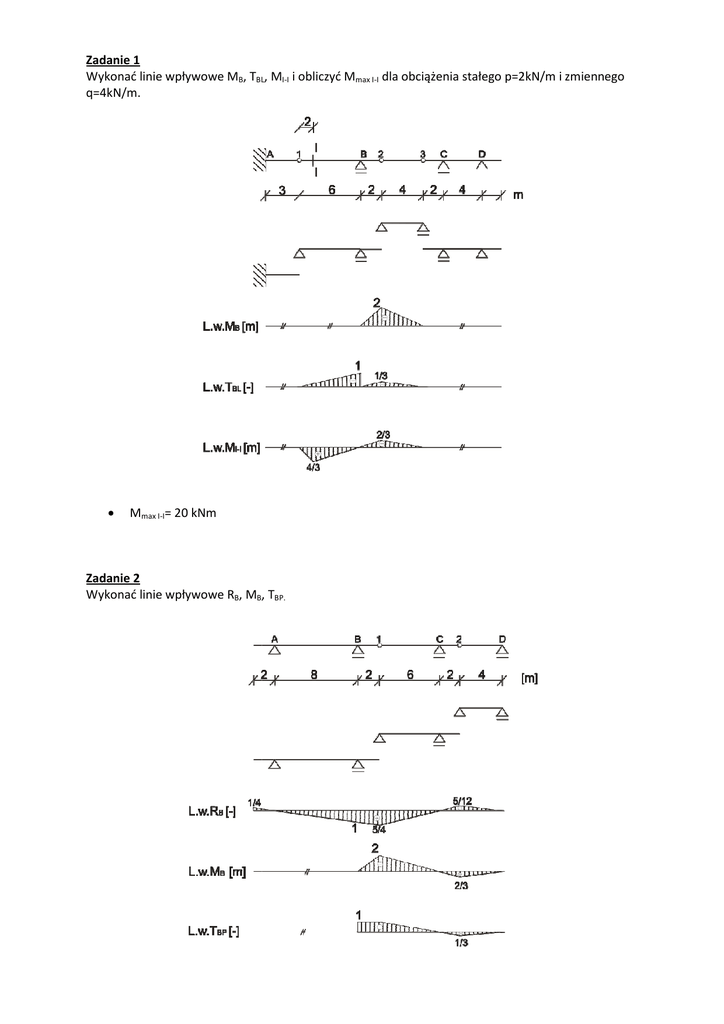 Zadanie 1 Wykonać linie wpływowe MB, TBL q=4kN/m. • Mmax I
