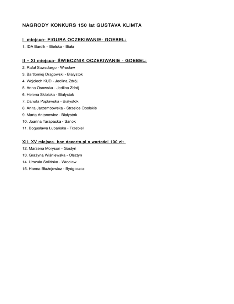 NAGRODY KONKURS 150 lat GUSTAVA KLIMTA I miejsce- FIGURA OCZEKIWANIE- GOEBEL: 1. IDA Barcik – Bielsko - Biała II – XI miejsca- ŚWIECZNIK OCZEKIWANIE - GOEBEL: 2. Rafał Sawzdargo - Wrocław 3. Bartłomiej Drągowski - Białystok 4. Wojciech KUD - Jedlina Zdrój 5. Anna Osowska - Jedlina Zdrój 6. Helena Skibicka - Białystok 7. Danuta Popławska - Białystok 8. Anita Jarzembowska - Strzelce Opolskie 9. Marta Antonowicz - Białystok 10. Joanna Tarapacka - Sanok 11. Bogusława Lubańska - Trzebiel XII- XV miejsca- bon decorto.pl o wartości 100 zł: 12. Marzena Moryson - Gostyń 13. Grażyna Wiśniewska - Olsztyn 14. Urszula Solińska - Wrocław 15. Hanna Błażejewicz - Bydgoszcz