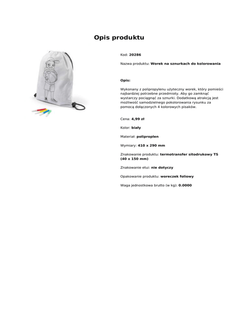 Opis produktu Kod: 20286 Nazwa produktu: Worek na sznurkach do kolorowania Opis: Wykonany z polipropylenu użyteczny worek, który pomieści najbardziej potrzebne przedmioty. Aby go zamknąć wystarczy pociągnąć za sznurki. Dodatkową atrakcją jest możliwość samodzielnego pokolorowania rysunku za pomocą dołączonych 4 kolorowych pisaków. Cena: 4,99 zł Kolor: biały Materiał: poliproplen Wymiary: 410 x 290 mm Znakowanie produktu: termotransfer sitodrukowy TS (40 x 150 mm) Znakowanie etui: nie dotyczy Opakowanie produktu: woreczek foliowy Waga jednostkowa brutto (w kg): 0.0000 Powered by TCPDF (www.tcpdf.org)