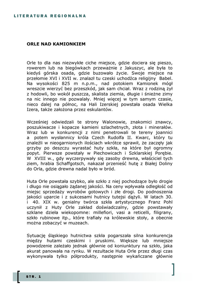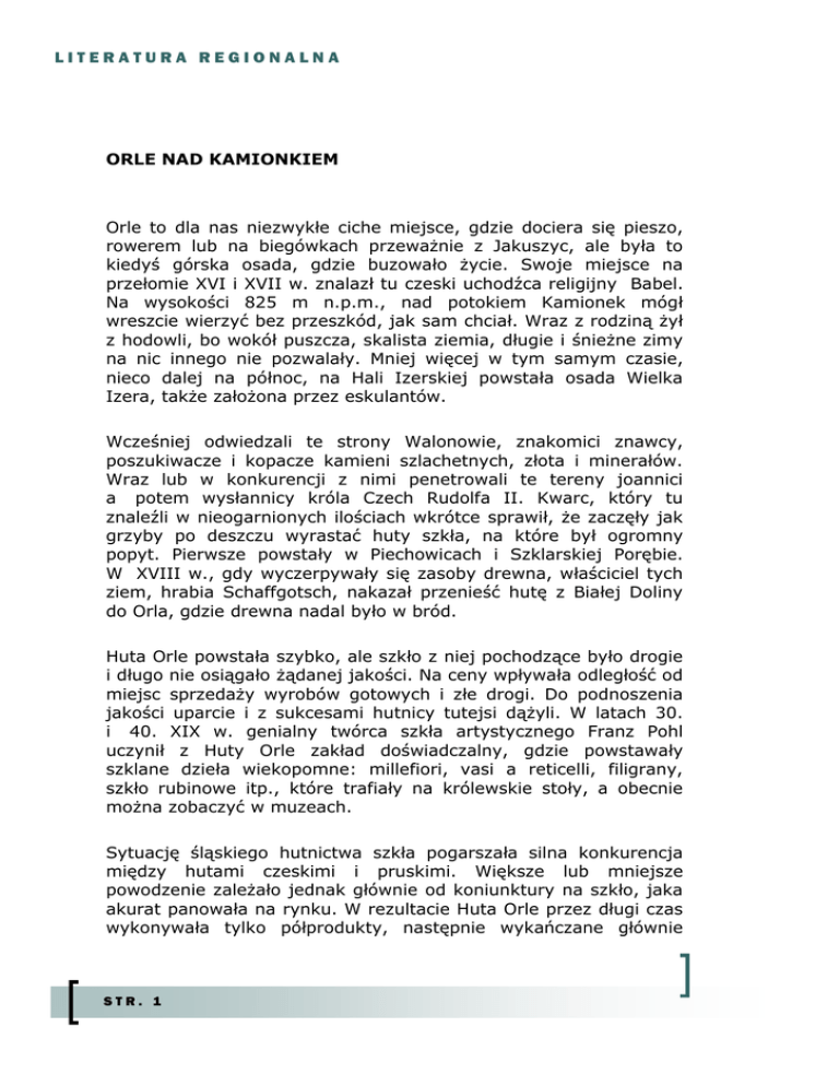 LITERATURA REGIONALNA ORLE NAD KAMIONKIEM Orle to dla nas niezwykłe ciche miejsce, gdzie dociera się pieszo, rowerem lub na biegówkach przeważnie z Jakuszyc, ale była to kiedyś górska osada, gdzie buzowało życie. Swoje miejsce na przełomie XVI i XVII w. znalazł tu czeski uchodźca religijny Babel. Na wysokości 825 m n.p.m., nad potokiem Kamionek mógł wreszcie wierzyć bez przeszkód, jak sam chciał. Wraz z rodziną żył z hodowli, bo wokół puszcza, skalista ziemia, długie i śnieżne zimy na nic innego nie pozwalały. Mniej więcej w tym samym czasie, nieco dalej na północ, na Hali Izerskiej powstała osada Wielka Izera, także założona przez eskulantów. Wcześniej odwiedzali te strony Walonowie, znakomici znawcy, poszukiwacze i kopacze kamieni szlachetnych, złota i minerałów. Wraz lub w konkurencji z nimi penetrowali te tereny joannici a potem wysłannicy króla Czech Rudolfa II. Kwarc, który tu znaleźli w nieogarnionych ilościach wkrótce sprawił, że zaczęły jak grzyby po deszczu wyrastać huty szkła, na które był ogromny popyt. Pierwsze powstały w Piechowicach i Szklarskiej Porębie. W XVIII w., gdy wyczerpywały się zasoby drewna, właściciel tych ziem, hrabia Schaffgotsch, nakazał przenieść hutę z Białej Doliny do Orla, gdzie drewna nadal było w bród. Huta Orle powstała szybko, ale szkło z niej pochodzące było drogie i długo nie osiągało żądanej jakości. Na ceny wpływała odległość od miejsc sprzedaży wyrobów gotowych i złe drogi. Do podnoszenia jakości uparcie i z sukcesami hutnicy tutejsi dążyli. W latach 30. i 40. XIX w. genialny twórca szkła artystycznego Franz Pohl uczynił z Huty Orle zakład doświadczalny, gdzie powstawały szklane dzieła wiekopomne: millefiori, vasi a reticelli, filigrany, szkło rubinowe itp., które trafiały na królewskie stoły, a obecnie można zobaczyć w muzeach. Sytuację śląskiego hutnictwa szkła pogarszała silna konkurencja między hutami czeskimi i pruskimi. Większe lub mniejsze powodzenie zależało jednak głównie od koniunktury na szkło, jaka akurat panowała na rynku. W rezultacie Huta Orle przez długi czas wykonywała tylko półprodukty, następnie wykańczane głównie STR. 1 LITERATURA REGIONALNA w Szklarskiej Porębie. W r. 1885 została ostatecznie zamknięta. Przyczyniła się do tego przede wszystkim przestarzała technologia i brak zbytu, do którego walnie przyczyniła się wojna celna z Austrią. W ten sposób zakończył się długi epizod szklarski Orla. To nie była wielka huta – w latach 70. XIX w. zatrudniała 100 pracowników. W 1903 r. w Jakuszycach, czyli w odległości 4 km od Orla – na wysokości 871 m n.p.m. – zbudowano stację kolei, która połączyła Szklarską Porębę z Tanwaldem. Teraz zaczęła się turystyczna kariera tej ziemi. Do popularyzacji Orla przyczynił się filozof, myśliciel, mistyk, badacz Śląska –Will Erich Peuckert, który został nauczycielem w pobliskiej Wielkiej Izerze. Gerhart Hauptmann osadził akcję swego dramatu „A Pippa tańczy” w gospodzie w Orlem. Drewnianą kładkę na Izerze, pozwalającą na kontakty z Czechami, zastąpiono w 1901 r. żelbetowym rozporowym mostem, ówczesnym wielkim osiągnięciem techniki budowlanej. To wszystko przyczyniło się do turystycznej popularności osady. Czasy III Rzeszy przyniosły Orlu zupełnie inną rolę. W 1935 r. zbudowano tu 3 baraki dla paramilitarnej organizacji RAD, której zadaniem było budowanie Drogi Sudeckiej. W 1937 r. oddano odcinek Świeradów Zdrój – Szklarska Poręba. Podczas wojny baraki służyły jako magazyny żywnościowe. W r. 1945 Orle stanowiło 8 budynków. W części z nich znalazła miejsce strażnica WOP. W następnych latach tak w Orlem, jak i w Wielkiej Izerze większość domów została zniszczona. Po Wielkiej Izerze został tylko budynek Chatki Górzystów. Turystyka została całkowicie wstrzymana. Poruszanie się po tym terenie jako strefie przygranicznej zakazane. W r. 1982 ktoś, nie wiadomo kto, wysadził żelbetonowy most na Izerze. Przywracanie funkcji turystycznej tych terenów zaczęło się w 1976 r. pierwszym Biegiem Piastów. Lata 80. zaznaczyły się klęską ekologiczną Gór Izerskich. W latach 90. wytyczono trasy rowerowe. W r. 1992 w Orlu powstała w byłym biurowo-administracyjnym budynku huty – baza turystyczna. Od początku zyskały sławę organizowane tam imprezy sportowo-rekreacyjne. 15 lipca 2005 r. wspólnym polsko-czeskim wysiłkiem przywrócono przejście turystyczne budując i otwierając na Izerze drewniany mostek. W r. 2009 został odnowiony budynek szlifierni z pokojami gościnnymi i małym muzeum szklanych przycisków do papieru. STR. 2 LITERATURA REGIONALNA * Książka Przemysława Wiatera – wielkiego znawcy spraw Gór Izerskich – ma charakter monografii tej osady. Została napisana z myślą o licznych miłośnikach tych surowych i pięknych gór. Zawiera ogromną ilość szczegółów historycznych i współczesnych. Wymienia i opisuje fakty i ludzi związanych z Orlem i okolicą. Przytacza ogromną literaturę przedmiotu. Nie podejmuje tak bliskiego, a jednak zupełnie osobnego i wielkiego tematu narciarskich tras biegowych. Na załączonej płycie czytelnik znajdzie wszystkie zawarte w książce ilustracje plus jeszcze wiele innych, poszerzających historyczny obraz faktograficzny. ROMUALD WITCZAK Przemysław Wiater: Osada Szklarska Poręba-Orle w Górach Izerskich. Agencja Wydawnicza CB, Warszawa 2012, ss. 136 + płyta CD. STR. 3