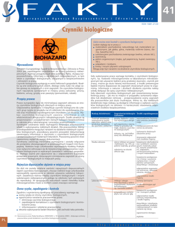 41 E u r o p e j s k a A g e n c j a B e z p i e c z e ƒ s t w a i Z d r o w i a w P r a c y ISSN 1681-2123 Czynniki biologiczne Gdzie mo˝na mieç kontakt z czynnikami biologicznymi Wprowadzenie Tematem Europejskiego Tygodnia Bezpieczeƒstwa i Zdrowia w Pracy 2003 jest zapobieganie zagro˝eniom ze strony substancji niebezpiecznych. Agencja przygotowuje seri´ publikacji Fakty, s∏u˝àcà rozpowszechnianiu informacji o substancjach niebezpiecznych, w tym tak˝e o czynnikach biologicznych, zwiàzanych z bezpieczeƒstwem i zdrowiem w pracy. Czynniki biologiczne wyst´pujà w wielu sektorach gospodarki. Rzadko sà one widoczne go∏ym okiem, dlatego wielu ludzi nie zdaje sobie sprawy ze zwiàzanych z nimi zagro˝eƒ. Do czynników biologicznych najcz´Êciej spotykanych w miejscu pracy zaliczamy: priony, bakterie, wirusy, grzyby oraz paso˝yty (pierwotniaki, robaki). Przepisy prawne Prawo europejskie dà˝y do minimalizacji zagro˝eƒ zdrowia ze strony czynników biologicznych obecnych w miejscu pracy. Odpowiednia dyrektywa (1) klasyfikuje czynniki biologiczne do czterech grup ryzyka ze wzgl´du na ich zdolnoÊci do wywo∏ywania chorób oraz mo˝liwoÊci zapobiegania tym chorobom i ich leczenia. Wykaz czynników biologicznych zawiera informacje o ich w∏aÊciwoÊciach alergicznych i toksykologicznych. Ârodki zaradcze sà proponowane z uwzgl´dnieniem ró˝nych kategorii bezpieczeƒstwa w zakresie pracy laboratoryjnej i procesów przemys∏owych. Dyrektywa ustanawia tak˝e wymagania dotyczàce informowania w∏adz o wykonywaniu niektórych dzia∏aƒ. Dla pracowników, którzy prawdopodobnie mogà byç nara˝eni na dzia∏anie niektórych czynników biologicznych, pracodawcy powinni prowadziç dokumentacj´ zawierajàcà informacje o stycznoÊci z czynnikami biologicznymi i przeprowadzonych badaniach lekarskich. Pracownicy powinni mieç zapewniony wglàd do swojej dokumentacji. Dyrektywy zawierajà minimalne wymagania i zosta∏y w∏àczone do przepisów obowiàzujàcych w poszczególnych krajach Unii Europejskiej. Niektóre kraje cz∏onkowskie wprowadzi∏y Kodeksy Praktyki oraz wytyczne odnoszàce si´ do bezpiecznego post´powania z czynnikami biologicznymi w wybranych zawodach i sektorach gospodarki. Dlatego wa˝ne jest zapoznanie si´ z odpowiednimi krajowymi przepisami prawnymi, dotyczàcymi zmniejszania zagro˝eƒ ze strony czynników biologicznych w miejscach pracy. Ludzie stykajà si´ w pracy z: ■ materia∏ami pochodzenia naturalnego lub materia∏ami organicznymi, jak gleba, glina, materia∏y roÊlinne (siano, s∏oma, bawe∏na itd.), ■ substancjami pochodzenia zwierz´cego (we∏na, w∏osie itd.), ■ ˝ywnoÊcià, ■ py∏em organicznym (màka, py∏ papierniczy, ∏upie˝ zwierz´cy itd.), ■ odpadami i Êciekami, ■ krwià i innymi p∏ynami ustrojowymi. Mogà wi´c byç nara˝eni na dzia∏anie czynników biologicznych. Gdy wykonywana praca wymaga kontaktu z czynnikami biologicznymi, np. hodowla mikroorganizmów w laboratorium mikrobiologicznym lub u˝ywanie bakterii przy produkcji ˝ywnoÊci, czynnik jest znany, mo˝na go du˝o ∏atwiej monitorowaç, a Êrodki prewencyjne b´dzie mo˝na dopasowaç do zagro˝eƒ stwarzanych przez te organizmy. Informacje o naturze i skutkach dzia∏ania czynnika nale˝y wtedy do∏àczyç do spisu czynników niebezpiecznych. Gdy obecnoÊç czynników biologicznych jest niezamierzonà konsekwencjà pracy – jak ma to miejsce w przypadku sortowania odpadów lub dzia∏alnoÊci rolniczej – przeprowadzenie oceny zagro˝eƒ dla pracowników jest du˝o trudniejsze. Mimo to, dla niektórych dzia∏alnoÊci tego rodzaju sà dost´pne informacje o wp∏ywie czynników biologicznych na zdrowie i o koniecznoÊci stosowania odpowiednich Êrodków bezpieczeƒstwa. Rodzaj dzia∏alnoÊci Zagro˝enia/niebezpie- Ârodki zapobiegawcze czeƒstwo Przemys∏ spo˝ywczy (wytwarzanie serów, jogurtów, salami) oraz produkcja dodatków do ˝ywnoÊci, piekarnie grzyby, bakterie i rozto- wprowadzenie hermetycza wywo∏ujàce alergie zacji procesu produkcyjnego py∏ organiczny z ziarna, mleka w proszku lub niedopuszczanie do twomàki, ska˝ony czynnika- rzenia si´ aerozolu mi biologicznymi izolowanie ska˝onych toksyny, np. jad kie∏ba- obszarów pracy siany lub aflatoksyna stosowanie odpowiednich Êrodków higieny S∏u˝ba zdrowia ró˝ne infekcje wirusowe bezpieczne obchodzenie i bakteryjne, np. HIV, za- si´ z próbkami zawierapalenie wàtroby, gruêlica jàcymi materia∏y zakaêne, ostrymi przedmiotami, odpadami, zaka˝enia na skutek zanieczyszczonà bieliznà uk∏ucia ig∏à i innymi materia∏ami bezpieczne post´powanie z krwià i usuwanie rozlanej krwi i innych p∏ynów ustrojowych, dezynfekcja i sterylizacja Najwy˝sze dopuszczalne st´˝enie w miejscu pracy Do dziÊ nie zosta∏y ustalone wartoÊci najwy˝szych dopuszczalnych st´˝eƒ czynników biologicznych, chocia˝ niektóre kraje cz∏onkowskie wprowadzi∏y ograniczenia w zakresie u˝ywania substancji toksycznych. Zasadnicza ró˝nica mi´dzy czynnikami biologicznymi i innymi substancjami niebezpiecznymi polega na zdolnoÊci tych pierwszych do reprodukcji. W sprzyjajàcych warunkach nawet niewielka liczba mikroorganizmów mo˝e w krótkim czasie znaczàco wzrosnàç. Ocena ryzyka, zapobieganie i kontrola Zgodnie z wymienionà dyrektywà od pracodawcy wymaga si´: ■ oceny ryzyka ze strony czynników biologicznych, ■ ograniczania nara˝enia pracowników przez: • eliminacj´ czynnika biologicznego • zapobieganie kontaktowi z czynnikami biologicznymi i kontrolowanie pracy • informowanie i szkolenie pracowników ■ zlecania wykonywania badaƒ lekarskich, jeÊli zachodzi taka potrzeba. odpowiednie wyposa˝enie ochronne, r´kawice, ubrania, okulary odpowiednie Êrodki higieny Laboratoria komory laminarne infekcje i alergie przy stycznoÊci z mikroorganizmami i kulturami Êrodki eliminujàce py∏ i aerozol komórkowymi, np. komórek ludzkich bezpieczne post´powanie 