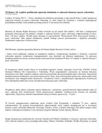 Artykuł pobrany ze strony http://www.ekonsument.pl/news-show-66879.php 94 firmy i 41 rządów publicznie ujawnia działania w zakresie biznesu i praw człowieka 04.03.2015, Maciej Londyn, 25 lutego 2015 r. - Nowe, interaktywne platformy prezentują, w jaki sposób firmy i rządy zajmują się wpływem biznesu na prawa człowieka. Pokazują, iż, choć mamy do czynienia z wieloma inspirującymi przykładami działań, wiele jednak pozostaje jeszcze w tej mierze do zrobienia. Business & Human Rights Resource Centre zwróciło się do ponad 100 rządów i 180 firm z konkretnymi pytaniami dotyczącymi ich polityki i działań w zakresie biznesu i praw człowieka. Odpowiedziało 52 proc. firm i 40 proc. rządów. Wyniki jasno ukazują, iż zatwierdzenie "Wytycznych ONZ dotyczących biznesu i praw człowieka" dało impuls działaniom, jednak brakuje jeszcze porozumienia i spójności pomiędzy działaniami rządowymi i biznesowymi. Phil Bloomer, dyrektor generalny Business & Human Rights Resource Centre, mówi: - Nasze nowe platformy wpłyną na zasadnicze rządowe i korporacyjne działania w biznesie i prawach człowieka poprzez zwiększenie transparentności oraz dzielenie się dobrymi praktykami. To pierwsza bezpłatna publiczna strona, na której każdy może porównać działania 94 firm i 41 rządów w zakresie biznesu i praw człowieka. W inicjatywie udział wzięły firmy ze wszystkich regionów świata, włączając Coca-Colę, CNOOC (China National Offshore Oil Corporation) i Telefonikę. Wielu respondentów zauważyło, że złożone łańcuchy dystrybucji oraz słabe wsparcie rządowe stanowią przeszkody dla przestrzegania praw człowieka. Najczęściej podejmowanymi działaniami, przywoływanymi przez firmy, były zobowiązania polityczne, sprawozdawczość zewnętrzna oraz zaangażowanie dostawców. Trzydzieści cztery z pięćdziesięciu największych światowych firm udostępniły publicznie swoje oświadczenia dotyczące praw człowieka. Wyjątkowo słaby odzew wykazały sektory detaliczny i odzieżowy, spośród których odpowiedziało tylko 25 proc., głównie firm odzieżowych. Wiele państwowych zakładów wydobywczych również nie udzieliło odpowiedzi. Najwyższy odsetek respondentów dotyczy branży spożywczej - 73 proc. W kwestii zaangażowania rządowego prym wiedzie Unia Europejska z udziałem 71 proc. państw członkowskich. Na pytania kwestionariusza odpowiedziało wiele rządów działających już w kwestiach biznesu i praw człowieka (Brazylia, Norwegia, Niemcy, USA), a bardzo obiecujący był odzew krajów, które dopiero wdrażają rozwiązania w tym obszarze (Angola, Bahrajn, Izrael, Japonia, Birma). Rządy dynamicznie podchodzą do rozwoju Narodowych Planów Działania w biznesie i prawach człowieka. Choć obecnie dopiero cztery posiadają takie plany (Dania, Finlandia, Holandia, Wielka Brytania), to ponad dwanaście zaznaczyło, że opracowuje lub rozważa opracowanie Narodowych Planów Działania. Większość rządów przywołała działania ustawodawcze w przedsięwziętych przez siebie krokach. Stosunkowo mało rządów uznało jurysdykcję eksterytorialną za rozwiązanie pomocne w obronie praw człowieka przed skutkami biznesu. Respondenci rządowi najczęściej wymieniali brak wiedzy oraz konieczność poprawy koordynacji działań pomiędzy gabinetami. Niektóre państwa o szerokim zasięgu ekonomicznym nie wzięły udziału w tym procesie (Kanada, Indie, Rosja). Również kanadyjskie i rosyjskie firmy nie udzieliły odpowiedzi, a słabo zareagowały także indyjskie (29 proc.) i chińskie (26 proc.). Taka tendencja budzi rozczarowanie, ponieważ transparentność jest kluczem do poprawy zarówno rządowych jak i firmowych działań. Zarówno rządy, jak i firmy opisały swoje konkretne pozytywne działania. Obejmują one obowiązek raportowania o różnych kwestiach związanych z prawami człowieka w Danii, Francji, Wielkiej Brytanii, Stanach Zjednoczonych i in., a także starania niektórych firm, by rozliczać z wpływu na prawa człowieka w krajach, w których funkcjonują, oraz ustanowić jasne procedury otrzymywania skarg. Potrzeba wspólnych działań Podczas gdy firmy dostrzegły znaczące problemy wynikające z luk w prawie, poszczególne rządy podały jako przeszkodę opór środowisk biznesu. Ta niezgodność podkreśla, że w najlepszym przypadku rządy i firmy nie współpracują, w najgorszym zaś unikają odpowiedzialności, wzajemnie się nią przerzucając. Z każdym profilem firmowym i rządowym związane są relacje ludzi lub pochodzące z mediów. Celem platform jest podniesienie poziomu odpowiedzialności i transparentności. Prezentują one praktyczne, gotowe do zastosowania kroki, zwracają uwagę na firmy i rządy, które nie są jeszcze zaangażowane, dostarczają informacji, mogących służyć obrońcom praw człowieka do rozliczania firm. Annabel Short, dyrektor programowa i kierownik projektu Platforma Działań Firmowych, stwierdza: - Każda firma, która w obliczu istotnych problemów społecznych i ekologicznych chce osiągnąć długotrwały sukces, musi poważnie traktować prawa człowieka. Zachęcamy firmy z całego świata do wzięcia udziału i opowiedzenia publicznie o swoich postępach. Eniko Horvath, kierująca projektem Platforma Działań Rządowych, mówi: - Wraz z kilkoma procesami w ramach Narodowego Planu Działań, rządy powinny wykorzystać okazję do podzielenia się doświadczeniami oraz do przekonania, że ich plany nie są silne jedynie na papierze, ale oferują także skuteczną ochronę i uniwersalne rozwiązania. Tłumaczenie: Magdalena Kowalska Na podstawie: business-humanrights.org (http://business-humanrights.org/en/press-release-94-companies-41-governments-publically-disclose-action s-on-business-human-rights-0)