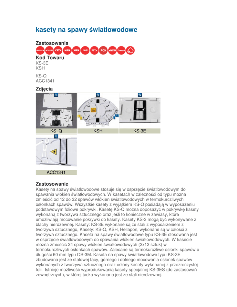 kasety na spawy światłowodowe Zastosowania Kod Towaru KS-3E KSH KS-Q ACC1341 Zdjęcia KS_Q KSH KS-3E ACC1341 Zastosowanie Kasety na spawy światłowodowe stosuje się w osprzęcie światłowodowym do spawania włókien światłowodowych. W kasetach w zależności od typu można zmieścić od 12 do 32 spawów włókien światłowodowych w termokurczliwych osłonkach spawów. Wszystkie kasety z wyjątkiem KS-Q posiadają w wyposażeniu podstawowym foliowe pokrywki. Kasetę KS-Q można doposażyć w pokrywkę kasety wykonaną z tworzywa sztucznego oraz jeśli to konieczne w zawiasy, które umożliwiają mocowanie pokrywki do kasety. Kasety KS-3 mogą być wykonywane z blachy nierdzewnej. Kasety: KS-3E wykonane są ze stali z wyposarzeniem z tworzywa sztucznego, Kasety: KS-Q, KSH, Hellapon, wykonane są w całości z tworzywa sztucznego. Kaseta na spawy światłowodowe typu KS-3E stosowana jest w osprzęcie światłowodowym do spawania włókien światłowodowych. W kasecie można zmieścić 24 spawy włókien światłowodowych (2x12 sztuk) w termokurczliwych osłonkach spawów. Zalecane są termokurczliwe osłonki spawów o długości 60 mm typu OS-3M. Kaseta na spawy światłowodowe typu KS-3E zbudowana jest ze stalowej tacy, górnego i dolnego mocowania osłonek spawów wykonanych z tworzywa sztucznego oraz osłony kasety wykonanej z przezroczystej folii. Istnieje możliwość wyprodukowania kasety specjalnej KS-3ES (do zastosowań zewnętrznych), w której tacka wykonana jest ze stali nierdzewnej. Dane techniczne KS-Q ACC1341 Hellapon KSH KS-3E ilość spawów 12 16 12 24 zastosowanie PS19/120 PS19/144 PSH-3 mufy FRBU UFC, BPK-19, BP-19 PS-3, PS-8, PS-5, PS-4, PS-19, MF-19, MK-5 BPK-19, MUF-1 wymiary szer./wys./głęb. [mm] 155/92 8 236 /92/8 204/145/7 200/115/10 Przykład zamówienia kaseta KS-3E
