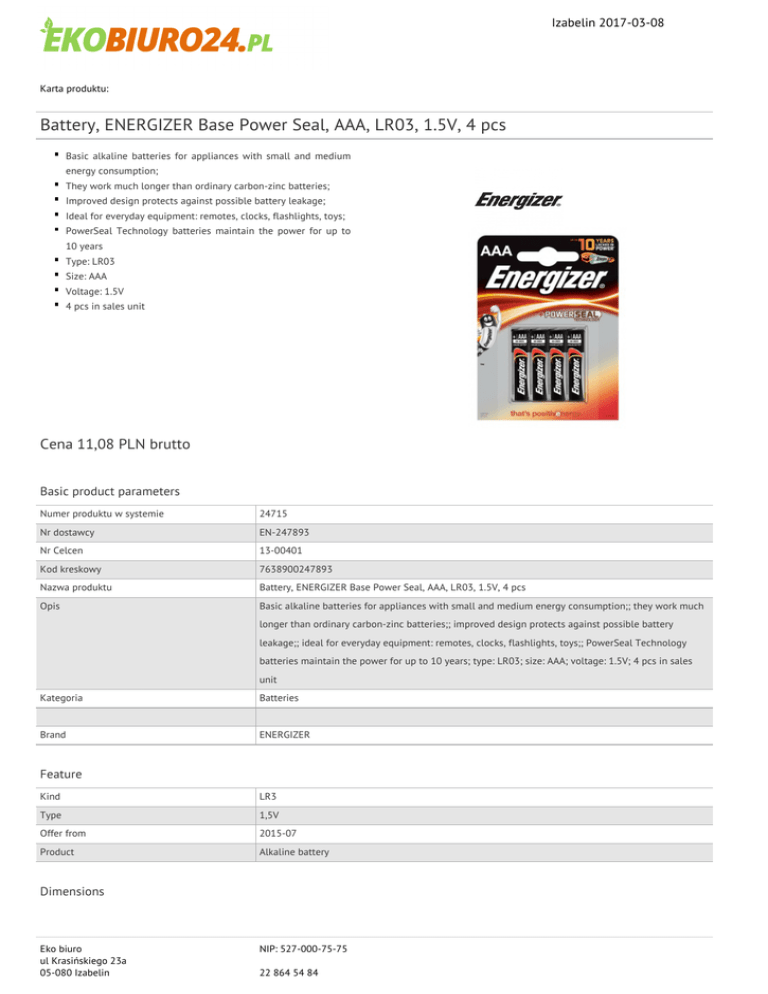 Izabelin 2017-03-08 Karta produktu: Battery, ENERGIZER Base Power Seal, AAA, LR03, 1.5V, 4 pcs Basic alkaline batteries for appliances with small and medium energy consumption; They work much longer than ordinary carbon-zinc batteries; Improved design protects against possible battery leakage; Ideal for everyday equipment: remotes, clocks, flashlights, toys; PowerSeal Technology batteries maintain the power for up to 10 years Type: LR03 Size: AAA Voltage: 1.5V 4 pcs in sales unit Cena 11,08 PLN brutto Basic product parameters Numer produktu w systemie 24715 Nr dostawcy EN-247893 Nr Celcen 13-00401 Kod kreskowy 7638900247893 Nazwa produktu Battery, ENERGIZER Base Power Seal, AAA, LR03, 1.5V, 4 pcs Opis Basic alkaline batteries for appliances with small and medium energy consumption;; they work much longer than ordinary carbon-zinc batteries;; improved design protects against possible battery leakage;; ideal for everyday equipment: remotes, clocks, flashlights, toys;; PowerSeal Technology batteries maintain the power for up to 10 years; type: LR03; size: AAA; voltage: 1.5V; 4 pcs in sales unit Kategoria Batteries Brand ENERGIZER Feature Kind LR3 Type 1,5V Offer from 2015-07 Product Alkaline battery Dimensions Eko biuro ul Krasińskiego 23a 05-080 Izabelin NIP: 527-000-75-75 22 864 54 84 Izabelin 2017-03-08 Karta katalogowa produktu cd. Battery, ENERGIZER Base Power Seal, AAA, LR03, 1.5V, 4 pcs Dimensions (mm) Diameter: 10,5 wysoko Size AAA Procurement vocabulary CPV 31411000-0 Certifications Hit Hit New product Standard Serdecznie zapraszamy do współpracy Eko biuro zespół. Eko biuro ul Krasińskiego 23a 05-080 Izabelin NIP: 527-000-75-75 22 864 54 84