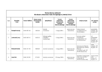 Wyk az lek ar zy sadowych dla obszar u wlasciwosci Sadu Okr egowego w Jeleniej Gór ze L .p. Nazwisko i imie Numer telefonu Numer prawa Wykonywania specjalizacja zawodu 1. Hampel Andr zej 0 604 099 149 1065426 2. Jankowski Jerzy 0 602 402 911 5628122 choroby wewnetrzne chirurgia ogólna, ortopedia i traumatologia Ter min rozpoczecia wykonywania czynnosci lekarza sadowego Ter min zakonczenia wykonywania czynnosci lekarza sadowego 1 lutego 2008 r. umowa na czas nieokreslony 1 lutego 2008 r. umowa na czas nieokreslony 3. Walczak Dorota 0 602 187 194 4069669 choroby wewnetrzne 1 lutego 2008 r. umowa na czas nieokreslony 4. Joya Aziz 0 606 103 883 8716381 choroby wewnetrzne 20 lutego 2008 r. umowa na czas nieokreslony miejsce przyjec dni i godziny przyjec Gabinet lekarski ul. Sienkiewicza 43 59-420 Bolków poniedzialki od godz. 1800 do godz. 2000 prywatny gabinet ortopedyczny od poniedzialku do soboty od godz. 1600 do godz. 2000 ul. Staroszkolna 7 B/5 59-700 Bo les lawiec Internistyczna Praktyka Specjalistyczna- Dorota Walczak ul. Letnia 2, gab. 20 7 58-506 Jelenia Góra Niepubliczny Zaklad Opieki Zdrowotnej „JO -MED.” u l. Korczaka 7d 59-850 Swieradów Zdrój sroda od godz. 1600 do godz. 1800 wtorki,czwartki, piatki od godz. 900 do godz. 1300 Zaklad Opieki Zdrowotnej „FAMILIA” ul. Dabrowskiego 64 59-930 Piensk 5. Grelinska Danuta 075 778 63 44 5651016 choroby wewnetrzne 21 lutego 2008 r. umowa na czas nieokreslony _______________________ prywatny gab inet ul. Boles lawiecka 18a II/2 59-930 Piensk poniedzialek od 1130 do 1800 wtorek od 800 do 14 00 sroda od 1130 do 1730 czwartek od 800 do 14 00 piatek od 1200 do 1800 poniedzialek od 800 do 900 wtorek od 1600 do 1700 sroda od 800 do 900 czwartek od 1600 do 1700 piatek od 800 do 900 Grupowa Praktyka Lekarzy 6. 7. K antor Robert Borowski Jan 0 606 625 324 075 647 34 80 5393119 4392969 chirurgia stomatologiczna 21 lutego 2008 r. umowa na czas nieokreslony Stomatologów Robert i od poniedzialku Barbara Kantor do piatku od godz. 1000 do godz. 1400 Spólka Partnerska ul. Szkolna 2 59-600 Lwówek S laski NZOZ „Biomed” od poniedzialku 19 marca 2008 r. umowa na czas nieokreslony Ul. Piaskowa 15 59-700 Boleslawiec do piatku od godz. 800 do godz. 900 11 kwietnia 2008 r. umowa na czas nieokreslony NZOZ „Sanitas” ul. Sienkiewicza 52 59-820 Lesna neurologia poniedzialki, 8. Bolczyk Izabela 0 506 073 282 7009173 choroby wewnetrzne medycyna rodzinna wtorki, piatki od 1100 do 1400 srody od 1600 do 1800 9. Janusz Zablocki (075) 77 52 007 0 600 988 752 2391684 neurologia 22 stycznia 2010 r. umowa na czas nieokreslony Gabinet Neurologiczny srody i piatki ul. Langiewicza 20, pok. 4 59-900 Zgorzelec od godz. 1630 do godz. 1800