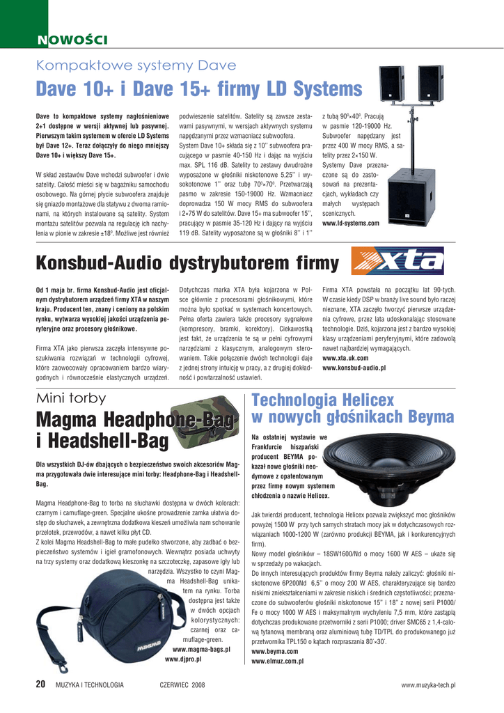 NOWOŚCI Kompaktowe systemy Dave Dave 10+ i Dave 15+ firmy LD Systems Dave to kompaktowe systemy nagłośnieniowe 2+1 dostępne w wersji aktywnej lub pasywnej. Pierwszym takim systemem w ofercie LD Systems był Dave 12+. Teraz dołączyły do niego mniejszy Dave 10+ i większy Dave 15+. W skład zestawów Dave wchodzi subwoofer i dwie satelity. Całość mieści się w bagażniku samochodu osobowego. Na górnej płycie subwoofera znajduje się gniazdo montażowe dla statywu z dwoma ramionami, na których instalowane są satelity. System montażu satelitów pozwala na regulację ich nachylenia w pionie w zakresie ±180. Możliwe jest również podwieszenie satelitów. Satelity są zawsze zestawami pasywnymi, w wersjach aktywnych systemu napędzanymi przez wzmacniacz subwoofera. System Dave 10+ składa się z 10’’ subwoofera pracującego w pasmie 40-150 Hz i dając na wyjściu max. SPL 116 dB. Satelity to zestawy dwudrożne wyposażone w głośniki niskotonowe 5,25’’ i wysokotonowe 1’’ oraz tubę 700×700. Przetwarzają pasmo w zakresie 150-19000 Hz. Wzmacniacz doprowadza 150 W mocy RMS do subwoofera i 2×75 W do satelitów. Dave 15+ ma subwoofer 15’’, pracujący w pasmie 35-120 Hz i dający na wyjściu 119 dB. Satelity wyposażone są w głośniki 8’’ i 1’’ z tubą 900×400. Pracują w pasmie 120-19000 Hz. Subwoofer napędzany jest przez 400 W mocy RMS, a satelity przez 2×150 W. Systemy Dave przeznaczone są do zastosowań na prezentacjach, wykładach czy małych występach scenicznych. www.ld-systems.com Konsbud-Audio dystrybutorem firmy Od 1 maja br. firma Konsbud-Audio jest oficjalnym dystrybutorem urządzeń firmy XTA w naszym kraju. Producent ten, znany i ceniony na polskim rynku, wytwarza wysokiej jakości urządzenia peryferyjne oraz procesory głośnikowe. Firma XTA jako pierwsza zaczęła intensywne poszukiwania rozwiązań w technologii cyfrowej, które zaowocowały opracowaniem bardzo wiarygodnych i równocześnie elastycznych urządzeń. Dotychczas marka XTA była kojarzona w Polsce głównie z procesorami głośnikowymi, które można było spotkać w systemach koncertowych. Pełna oferta zawiera także procesory sygnałowe (kompresory, bramki, korektory). Ciekawostką jest fakt, że urządzenia te są w pełni cyfrowymi narzędziami z klasycznym, analogowym sterowaniem. Takie połączenie dwóch technologii daje z jednej strony intuicję w pracy, a z drugiej dokładność i powtarzalność ustawień. Mini torby Magma Headphone-Bag i Headshell-Bag Dla wszystkich DJ-ów dbających o bezpieczeństwo swoich akcesoriów Magma przygotowała dwie interesujące mini torby: Headphone-Bag i HeadshellBag. Magma Headphone-Bag to torba na słuchawki dostępna w dwóch kolorach: czarnym i camuflage-green. Specjalne ukośne prowadzenie zamka ułatwia dostęp do słuchawek, a zewnętrzna dodatkowa kieszeń umożliwia nam schowanie przelotek, przewodów, a nawet kilku płyt CD. Z kolei Magma Headshell-Bag to małe pudełko stworzone, aby zadbać o bezpieczeństwo systemów i igieł gramofonowych. Wewnątrz posiada uchwyty na trzy systemy oraz dodatkową kieszonkę na szczoteczkę, zapasowe igły lub narzędzia. Wszystko to czyni Magma Headshell-Bag unikatem na rynku. Torba dostępna jest także w dwóch opcjach kolorystycznych: czarnej oraz camuflage-green. www.magma-bags.pl www.djpro.pl 20 MUZYKA I TECHNOLOGIA CZERWIEC 2008 Firma XTA powstała na początku lat 90-tych. W czasie kiedy DSP w branży live sound było raczej nieznane, XTA zaczęło tworzyć pierwsze urządzenia cyfrowe, przez lata udoskonalając stosowane technologie. Dziś, kojarzona jest z bardzo wysokiej klasy urządzeniami peryferyjnymi, które zadowolą nawet najbardziej wymagających. www.xta.uk.com www.konsbud-audio.pl Technologia Helicex w nowych głośnikach Beyma Na ostatniej wystawie we Frankfurcie hiszpański producent BEYMA pokazał nowe głośniki neodymowe z opatentowanym przez firmę nowym systemem chłodzenia o nazwie Helicex. Jak twierdzi producent, technologia Helicex pozwala zwiększyć moc głośników powyżej 1500 W przy tych samych stratach mocy jak w dotychczasowych rozwiązaniach 1000-1200 W (zarówno produkcji BEYMA, jak i konkurencyjnych firm). Nowy model głośników – 18SW1600/Nd o mocy 1600 W AES – ukaże się w sprzedaży po wakacjach. Do innych interesujących produktów firmy Beyma należy zaliczyć: głośniki niskotonowe 6P200Nd 6,5’’ o mocy 200 W AES, charakteryzujące się bardzo niskimi zniekształceniami w zakresie niskich i średnich częstotliwości; przeznaczone do subwooferów głośniki niskotonowe 15” i 18” z nowej serii P1000/ Fe o mocy 1000 W AES i maksymalnym wychyleniu 7,5 mm, które zastąpią dotychczas produkowane przetworniki z serii P1000; driver SMC65 z 1,4-calową tytanową membraną oraz aluminiową tubę TD/TPL do produkowanego już przetwornika TPL150 o kątach rozpraszania 80°×30°. www.beyma.com www.elmuz.com.pl www.muzyka-tech.pl