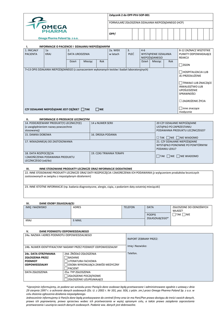 ) Załącznik 2 do OPP-PhV-SOP-001 FORMULARZ ZGŁOSZENIA DZIAŁANIA NIEPOŻĄDANEGO (HCP) OPP/ Omega Pharma Poland Sp. z o.o. I. INFORMACJE O PACJENCIE I DZIAŁANIU NIEPOŻĄDANYM 1. INICJAŁY 1a 2. 2a. WIEK PACJENTA KRAJ DATA URODZENIA w latach Dzień Miesiąc 3. PŁEĆ Rok 4-6 WYSTĄPIENIE DZIAŁANIA NIEPOŻĄDANEGO Dzień Miesiąc Rok 8-12 ZAZNACZ WSZYSTKIE PUNKTY ODPOWIADAJĄCE REAKCJI ZGON 7+13 OPIS DZIAŁANIA NIEPOŻĄDANEGO (z zaznaczeniem wykonanych testów i badań laboratoryjnych) HOSPITALIZACJA LUB JEJ PRZEDŁUŻENIE TRWAŁE LUB ZNACZĄCE INWALIDZTWO LUB UPOŚLEDZENIE SPRAWNOŚCI ZAGROŻENIE ŻYCIA CZY DZIAŁANIE NIEPOŻĄDANE JEST CIĘŻKIE? TAK inne znaczące medycznie NIE II. INFORMACJE O PRODUKCIE LECZNICZYM 14. PODEJRZEWANY PRODUKT(Y) LECZNICZY(E) 14 a NUMER SERII (z uwzględnieniem nazwy powszechnie stosowanej) 15. DAWKA DOBOWA 16. DROGA PODANIA 20 CZY DZIAŁANIE NIEPOŻĄDANE USTĄPIŁO PO ZAPRZESTANIU PODAWANIA PRODUKTU LECZNICZEGO? TAK NIE NIE WIADOMO 21. CZY DZIAŁANIE NIEPOŻĄDANE WYSTĄPIŁO PONOWNIE PO POWTÓRNYM PODANIU LEKU? 17. WSKAZANIE(A) DO ZASTOSOWANIA 18. DATA ROZPOCZĘCIA I ZAKOŃCZENIA PODAWANIA PRODUKTU LECZNICZEGO (od/do) 19. CZAS TRWANIA TERAPII TAK NIE NIE WIADOMO III. INNE STOSOWANE PRODUKTY LECZNICZE ORAZ INFORMACJE DODATKOWE 22. INNE STOSOWANE PRODUKTY LECZNICZE ORAZ DATY ROZPOCZĘCIA I ZAKOŃCZENIA ICH PODAWANIA (z wyłączeniem produktów leczniczych zastosowanych w związku z niepożądanym działaniem) 23. INNE ISTOTNE INFORMACJE (np. badania diagnostyczne, alergie, ciąża, z podaniem daty ostatniej miesiączki) IV. DANE OSOBY ZGŁASZAJĄCEJ IMIĘ I NAZWISKO ADRES KRAJ TELEFON DATA PODPIS ZGŁASZAJĄCEGO* E-MAIL ZGŁOSZONE DO ODNOŚNYCH WŁADZ? TAK NIE V. DANE PODMIOTU ODPOWIEDZIALNEGO 24a. NAZWA I ADRES PODMIOTU ODPOWIEDZIALNEGO RAPORT ZEBRANY PRZEZ: 24b. NUMER IDENTYFIKACYJNY NADANY PRZEZ PODMIOT ODPOWIEDZIALNY Imię i Nazwisko: 24c. DATA OTRZYMANIA ZGŁOSZENIA PRZEZ PODMIOT ODPOWIEDZIALNY Telefon. DATA ZGŁOSZENIA 24d. ŹRÓDŁO ZGŁOSZENIA BADANIE LITERATURA FACHOWA OSOBA WYKONUJĄCA ZAWÓD MEDYCZNY PACJENT 25a. TYP ZGŁOSZENIA ZGŁOSZENIE POCZĄTKOWE ZGŁOSZENIE UZUPEŁNIAJĄCE *Uprzejmie informujemy, że podane we wniosku przez Panią/a dane osobowe będą przetwarzane i administrowane zgodnie z ustawą z dnia 29 sierpnia 1997 r. o ochronie danych osobowych (Dz. U. z 2002 r. Nr 101, poz. 926, z późn. zm.) przez Omega Pharma Poland Sp. z o.o. w celu złożenia zgłoszenia działania niepożądanego. Jednocześnie informujemy iż Pani/a dane będą przekazywane do centrali firmy oraz że ma Pani/Pan prawo dostępu do treści swoich danych, prawo ich poprawiania, prawo sprzeciwu wobec ich przetwarzania w wyżej opisanym celu, a także prawo zażądania zaprzestania przetwarzania i usunięcia swoich danych osobowych. Podanie ww. danych jest dobrowolne.