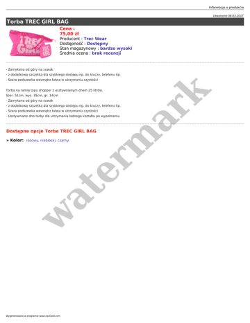 Informacje o produkcie Utworzono 08-03-2017 Torba TREC GIRL BAG Cena : 75,00 zł Producent : Trec Wear Dostępność : Dostępny Stan magazynowy : bardzo wysoki Średnia ocena : brak recenzji - Zamykana od góry na suwak - z dodatkową saszetką dla szybkiego dostępu np. do kluczy, telefonu itp. - Szara podszewka wewnątrz łatwa w utrzymaniu czystości Szer. 51cm, wys. 35cm, gr. 14cm - Zamykana od góry na suwak er m ar k Torba na ramię typu shopper z usztywnianym dnem 25 litrów. - z dodatkową saszetką dla szybkiego dostępu np. do kluczy, telefonu itp. - Szara podszewka wewnątrz łatwa w utrzymaniu czystości - Usztywniane dno torby dla utrzymania ładnego kształtu po wypełnieniu Dostępne opcje Torba TREC GIRL BAG w at » Kolor: różowy, niebieski, czarny. Wygenerowano w programie www.oscGold.com