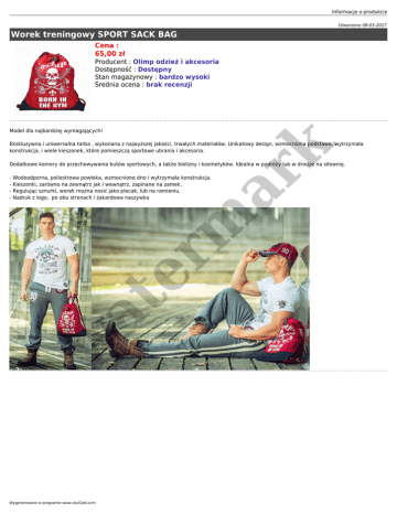 Informacje o produkcie Utworzono 08-03-2017 Worek treningowy SPORT SACK BAG Cena : 65,00 zł Producent : Olimp odzież i akcesoria Dostępność : Dostępny Stan magazynowy : bardzo wysoki Średnia ocena : brak recenzji Model dla najbardziej wymagających! er m ar k Ekskluzywna i uniwersalna torba , wykonana z najwyższej jakości, trwałych materiałów. Unikatowy design, wzmocniona podstawa, wytrzymała konstrukcja, i wiele kieszonek, które pomieszczą sportowe ubrania i akcesoria. Dodatkowe komory do przechowywania butów sportowych, a także bielizny i kosmetyków. Idealna w podróży lub w drodze na siłownię. w at - Wodoodporna, poliestrowa powłoka, wzmocnione dno i wytrzymała konstrukcja. - Kieszonki, zarówno na zewnątrz jak i wewnątrz, zapinane na zamek. - Regulując sznurki, worek można nosić jako plecak, lub na ramieniu. - Nadruk z logo, po obu stronach i żakardowa naszywka Wygenerowano w programie www.oscGold.com