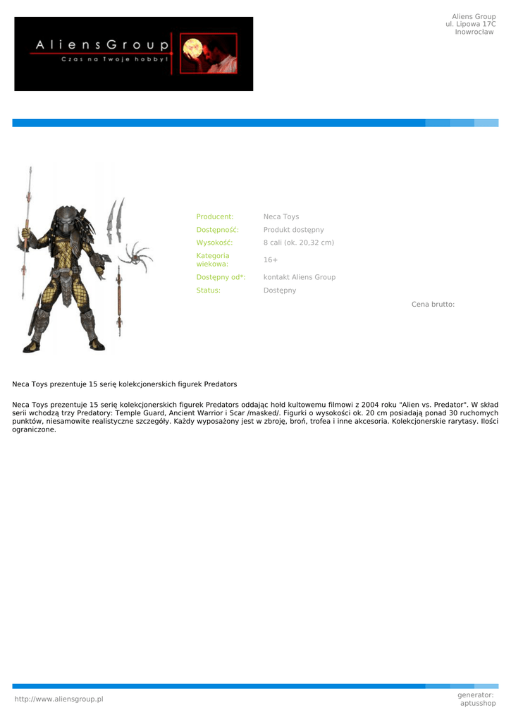 Aliens Group ul. Lipowa 17C Inowrocław Producent: Neca Toys Dostępność: Produkt dostępny Wysokość: 8 cali (ok. 20,32 cm) Kategoria wiekowa: 16+ Dostępny od*: kontakt Aliens Group Status: Dostępny Cena brutto: Neca Toys prezentuje 15 serię kolekcjonerskich figurek Predators Neca Toys prezentuje 15 serię kolekcjonerskich figurek Predators oddając hołd kultowemu filmowi z 2004 roku "Alien vs. Predator". W skład serii wchodzą trzy Predatory: Temple Guard, Ancient Warrior i Scar /masked/. Figurki o wysokości ok. 20 cm posiadają ponad 30 ruchomych punktów, niesamowite realistyczne szczegóły. Każdy wyposażony jest w zbroję, broń, trofea i inne akcesoria. Kolekcjonerskie rarytasy. Ilości ograniczone. http://www.aliensgroup.pl generator: aptusshop