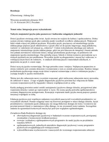 Rezolucja (Übersetzung: Aidong Qu) Wiosenne posiedzenie plenarne 2013 12.-14. Kwiecień 2013, Poczdam Temat roku: Integracja przez wyksztalcenie Nabycie znajomości języka jako poznawcze i kulturalne osiągnięcie jednostki Dzieci językiem otwierają sobie świat. Język otwiera im wejście do kultury i społeczeństwa. Dobry system oświaty traktuje język jako centralny punkt wszelkich wysiłków edukacyjnych. Większość ludzi włada więcej niż jednym językiem. Wszystkie języki, począwszy od niemieckiego języka edukacyjnego poprzez język młodzieżowy i języki obce aż do języka migowego, mają jednakową wartość i w zależności od sytuacji są ,,właściwe”. Celem wykształcenia szkolnego jest nabycie znajomości niemieckiego języka edukacyjnego, gdyż ten jest kluczem do integracji i brania udziału. Jest jednak niewłaściwe mierzenie dzieci, innego pochodzenia językowego, na podstawie ich znajomości języka niemieckiego. One potrafią więcej. Szkoła w której rozmowy prowadzone są w różnych językach nie jest problemem. Wszystkie języki są ubogaceniem i muszą być widoczne; w wielojęzycznym liście do rodziców, w znakach informacyjnych i materiałach szkolnych, w spojrzeniu na język w czasie zajęć. Dzieci uczą się języka rozmawiając. Do tego potrzeba czasu i miejsca. Najlepszym poparciem ze strony rodziców jest czytanie dzieciom i rozmawianie o tym co zostało przeczytane. Rodzice innego pochodzenia językowego mogą swoje dzieci wspierać rozmawiając z nimi w rodzinnym języku i czytając książki w języku niemieckim. Ważne jest aby zaburzenia mowy wcześnie rozpoznać, gdyż nieleczone zaburzenia mowy prowadzą do zaburzeń w nauce. Z tego względu diagnostyka językowa powinna być włączona do badań wczesno-rozpoznawczych by logopedzi i lekarze współpracowali ze sobą. Każdy pedagog powinien umieć ustalić umiejętności językowe danego dziecka, przygotować plan wspierania dziecka i umieć go wprowadzić w życie. Do oceny języka potrzeba ogólnonarodowe oceniane diagnostyczne postępowanie. Koncepcje wspierania nauki języka muszą poprzez granice instytucji współgrać ze sobą. Edukacja językowa jest wspólnym zadaniem wszystkich nauczycieli wszystkich przedmiotów we wszystkich szkołach. Pomiar osiągnięć musi się kierować postępem w nauce danego dziecka. Język przedmiotowy i niemiecki język edukacyjny nie mogą blokować dostępu do treści. Uczniowie nie powinni ponosić klęski w matematyce tylko dlatego, że nie zrozumieli treści zadania. Szczególnie zadania na egzaminach końcowych muszą być pod tym względem ogólnodostępne. Związkowa Rada Rodziców domaga się: obowiązkowej diagnostyki językowej w badaniach wczesno-rozpoznawczych, powiązanej ewentualnie z koniecznymi środkami pomocy rozwoju i rozbudowy ogólnopaństwowych programów do nauki języka na przykładzie transferu SINUS ogólnopaństwowych, jednolitych mierników diagnostyki językowej i oceny programów językowych uwzględniających wielojęzyczność wykwalifikowania wychowawców i nauczycieli do wczesnego rozpoznawania zaburzeń mowy i do utworzenia i wdrażania planów wspierania dzieci informowania rodziców o diagnozie językowej ich dziecka i udziału rodziców w przyswajaniu języka niemieckiego wykształcania i szkolenia wszystkich pedagogów do obchodzenia się z wielojęzycznością i niemieckim jako drugim językiem wspólnego, obowiązkowego szkolenia wychowawców, pedagogów specjalnych i nauczycieli aby została zapewniona zgodna edukacja językowa Dobry system edukacyjny tworzy w rodzicach i nauczycielach świadomość zasadniczego znaczenia języka i widzi wielojęzyczność jako ubogacenie.