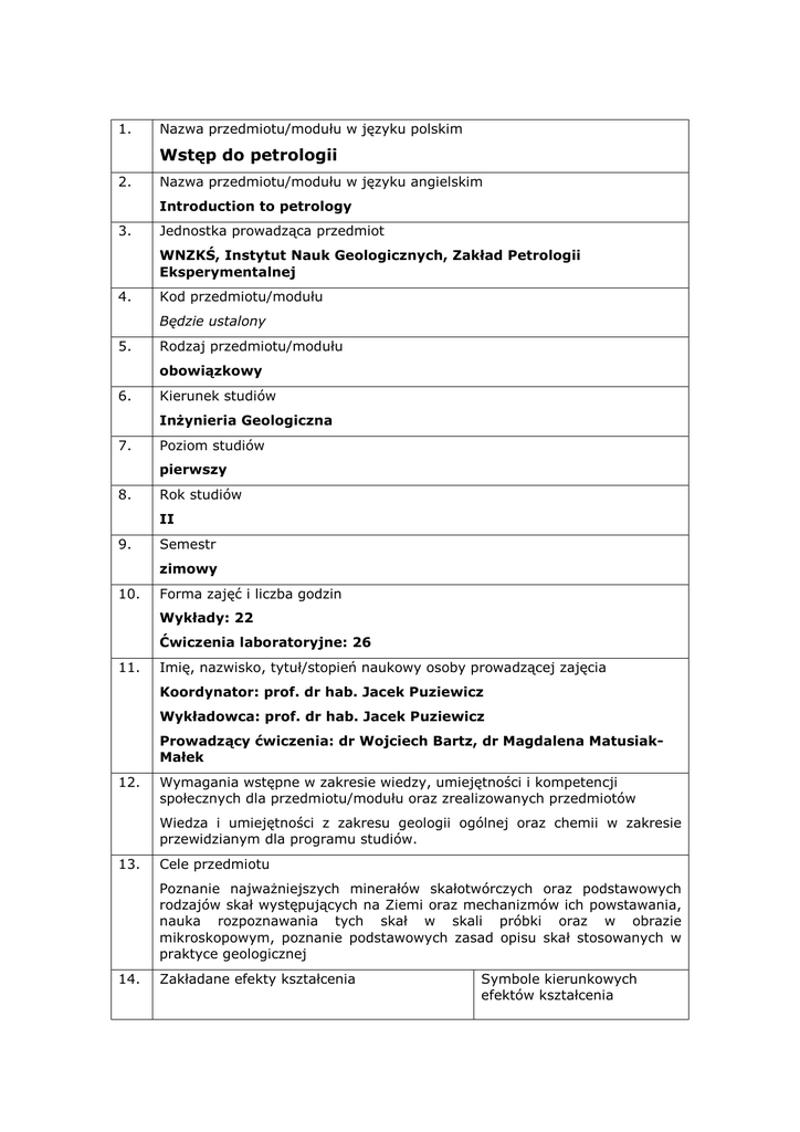 1. Nazwa przedmiotu/modułu w języku polskim Wstęp do petrologii 2. Nazwa przedmiotu/modułu w języku angielskim Introduction to petrology 3. Jednostka prowadząca przedmiot WNZKŚ, Instytut Nauk Geologicznych, Zakład Petrologii Eksperymentalnej 4. Kod przedmiotu/modułu Będzie ustalony 5. Rodzaj przedmiotu/modułu obowiązkowy 6. Kierunek studiów Inżynieria Geologiczna 7. Poziom studiów pierwszy 8. Rok studiów II 9. Semestr zimowy 10. Forma zajęć i liczba godzin Wykłady: 22 Ćwiczenia laboratoryjne: 26 11. Imię, nazwisko, tytuł/stopień naukowy osoby prowadzącej zajęcia Koordynator: prof. dr hab. Jacek Puziewicz Wykładowca: prof. dr hab. Jacek Puziewicz Prowadzący ćwiczenia: dr Wojciech Bartz, dr Magdalena MatusiakMałek 12. Wymagania wstępne w zakresie wiedzy, umiejętności i kompetencji społecznych dla przedmiotu/modułu oraz zrealizowanych przedmiotów Wiedza i umiejętności z zakresu geologii ogólnej oraz chemii w zakresie przewidzianym dla programu studiów. 13. Cele przedmiotu Poznanie najważniejszych minerałów skałotwórczych oraz podstawowych rodzajów skał występujących na Ziemi oraz mechanizmów ich powstawania, nauka rozpoznawania tych skał w skali próbki oraz w obrazie mikroskopowym, poznanie podstawowych zasad opisu skał stosowanych w praktyce geologicznej 14. Zakładane efekty kształcenia Symbole kierunkowych efektów kształcenia 15. W_1 Zna podstawowe pojęcia, procesy i zjawiska związane z procesami kształtującymi Ziemię K1_W03, InżK_W01 W_2 Posiada podstawową wiedzę w zakresie petrologii i geochemii powstawania podstawowych skał K1_W04 U_1 Potrafi wykorzystać podstawowe techniki laboratoryjne stosowane przy analizie skał i minerałów InżK_U01, InżK_U02 U_2 Potrafi na podstawie cech i właściwości rozpoznać podstawowe minerały i skały K1_U01, K1_U02, InżK_U01 U_3 Potrafi zaprezentować środowiska geotektoniczne i mechanizmy powstawania skal i minerałów InżK_U02 U_4 Potrafi omówić skały, które odgrywają ważną role w praktyce geologiczno – inżynierskiej InżK_U04, K1_U11, K1_U09 K_1 Potrafi właściwie wykorzystywać powierzany do pracy sprzęt K1_K04 K_2 Posada umiejętność organizowanie czasu pracy oraz pracy w grupie InżK_K02 Treści programowe Wykłady: Wykłady zaznajamiają słuchaczy z najważniejszymi skałami występującymi na Ziemi, ze środowiskami geotektonicznymi w których one występują oraz z mechanizmami ich powstawania. Skały występujące w Europie, ze szczególnym naciskiem na skały Polski, są omawiany bardziej szczegółowo. Wykład zaznajamia także słuchaczy ze skałami ważnymi dla praktyki geologiczno-inżynierskiej, szczególnie ze skałami ilastymi oraz niezlityfikowanymi skałami osadowymi. Ćwiczenia laboratoryjne: Ćwiczenia uczą rozpoznawania podstawowych minerałów skałotwórczych oraz skał w skali próbki i w obrazie mikroskopowym. Ważnym elementem ćwiczeń jest opanowanie przez słuchaczy umiejętności kompleksowego (makro- i mikroskopowego) opisu skał stosowanego w praktyce. 16. Zalecana literatura Literatura podstawowa: Przewodnik do petrografii. Praca zbiorowa pod redakcją Andrzeja Maneckiego i Marka Muszyńskiego. Wydawnictwo AGH, 2008. Literatura uzupełniająca: Gill R, 2010, Igneous Rocks and Processes, A practical Guide. Wiley-Blackwell 17. Forma zaliczenia poszczególnych komponentów przedmiotu/modułu, sposób sprawdzenia osiągnięcia zamierzonych efektów kształcenia: Wykłady: Egzamin pisemny. Wynik pozytywny – prawidłowa odpowiedź na co najmniej połowę zadanych pytań; udział w wyniku końcowym 60 %, W_1, W_2 Ćwiczenia laboratoryjne: Sprawdzian teoretyczny - 4 sprawdziany pisemne, wynik pozytywny – uzyskanie średniej ≥ 3,0 wyliczonej w oparciu o ocenę wszystkie sprawdziany udział w wyniku końcowym 40 %; U_1, U_2, U_3, U_4, K_1, K_2 18. Język wykładowy polski 19. Obciążenie pracą studenta: Forma aktywności studenta Średnia liczba godzin na zrealizowanie aktywności Godziny zajęć (wg planu studiów) z nauczycielem: - wykład: 22 53 - ćwiczenia laboratoryjne: 26 - konsultacje: 5 Praca własna studenta np.: - przygotowanie do zajęć: 10 50 - opracowanie wyników: 10 - czytanie wskazanej literatury: 10 - napisanie raportu z zajęć: 5 - przygotowanie do egzaminu: 15 Suma godzin Liczba punktów ECTS 103 5